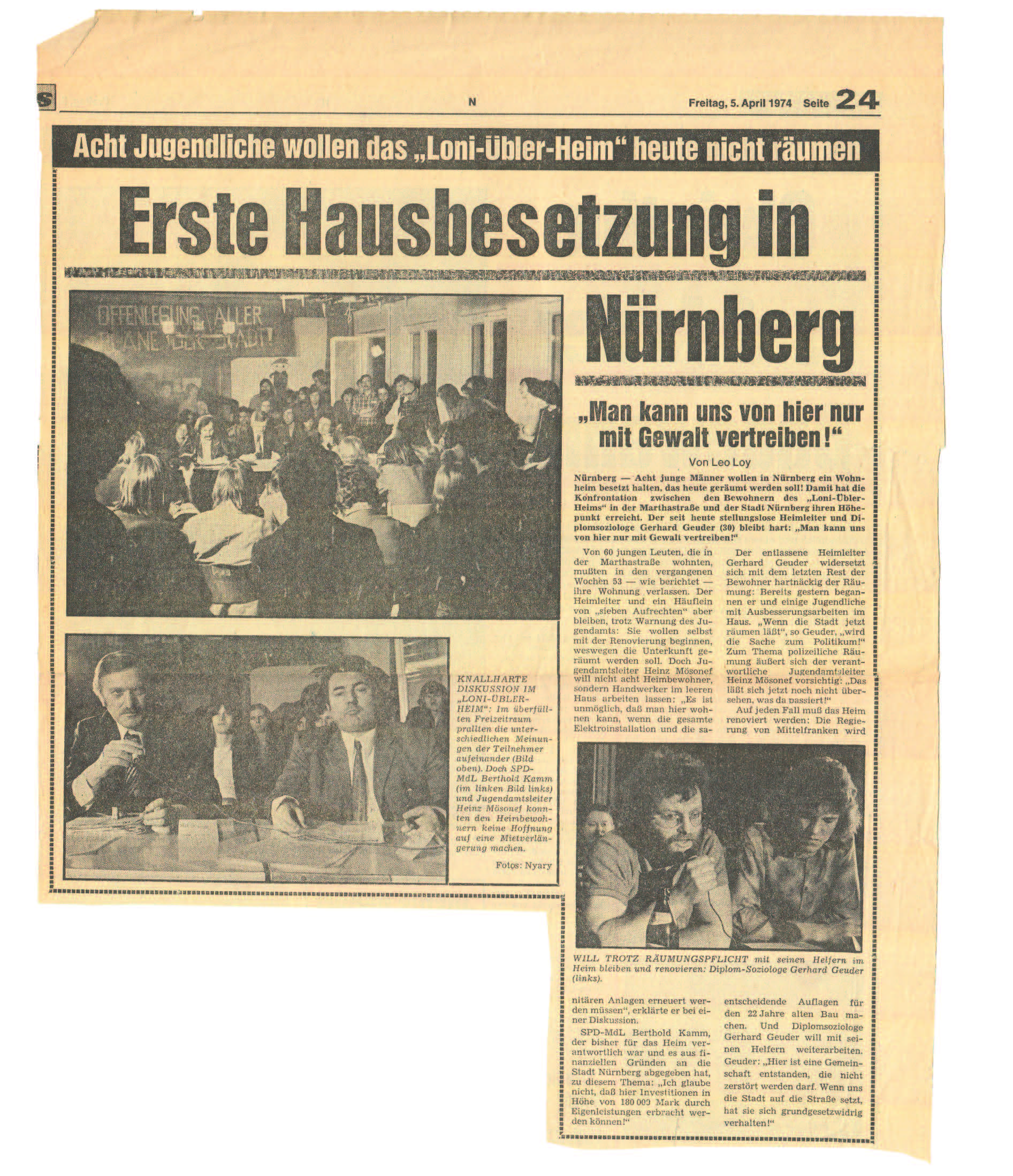 Nach der Schließung des Jugendwohnheims 1974 geht das Haus wieder in den Besitz der Stadt Nürnberg über. Die Jugendlichen hoffen das Haus weiter nutzen zu dürfen und wollen es auf eigene Faust sanieren. Die Stadt Nürnberg stellt sich quer und ruft zur Räumung auf. Die Heimbewohner wollen sich nicht vertreiben lassen und besetzen gemeinsam mit dem entlassenen Heimleiter Gerhard Geuder das Loni-Übler-Heim – die erste Hausbesetzung Nürnbergs. Am 13. April 1974 durchsucht die Polizei das Haus und nimmt Jugendliche mit auf die Wache. Kurz darauf lässt die Stadt die Fenster mit Brettern vernageln.