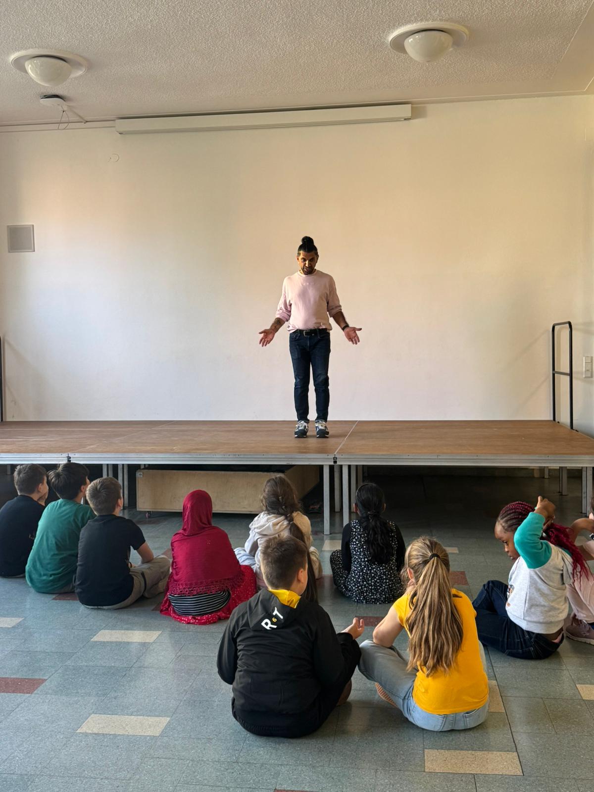 Über einen Zeitraum von 4 Wochen trafen sich der Schaupieler Irfan Taufik, die Deutschklasse der Bartholomäusschule und die Pädagog*innen vom Loni jeweils zwei Tage die Woche über je zwei Schulstunden.