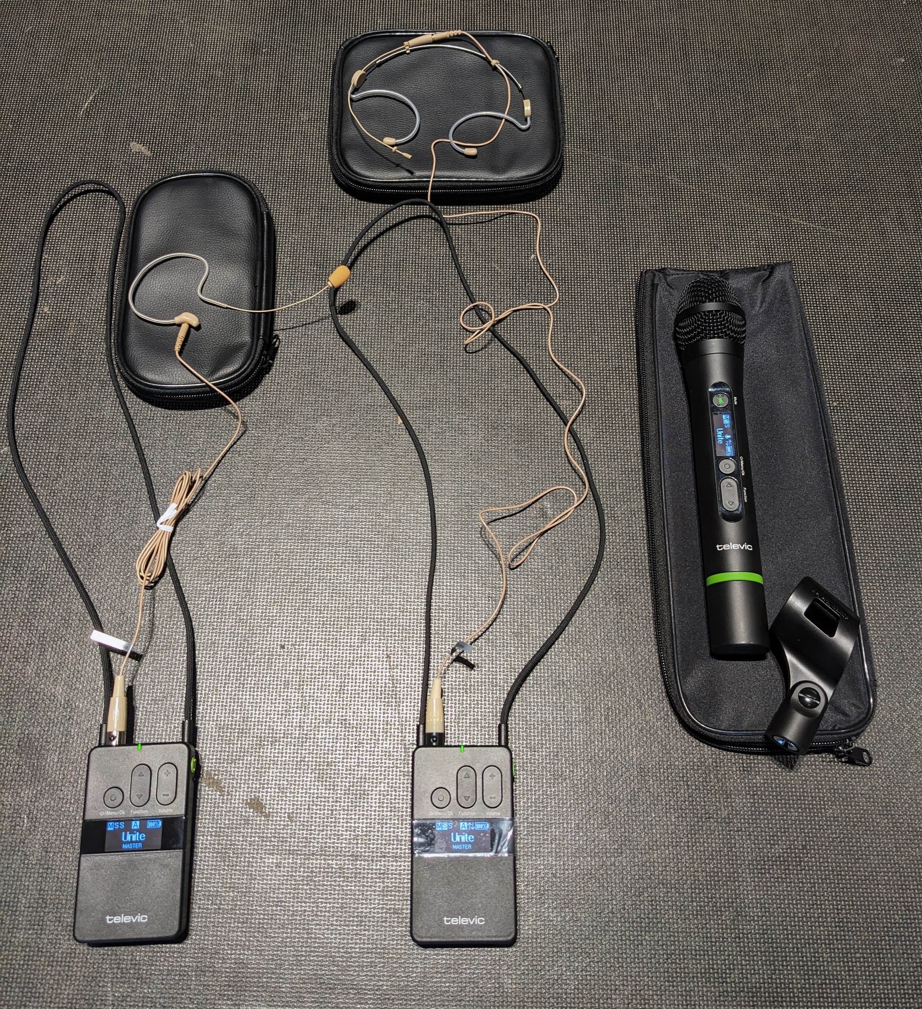 Drei Senderarten: Zwei Headset-Varianten mit hautfarbenen Mikrofonen verbunden mit Taschensendern und ein Handmikrofon als eigenständiger Sender.