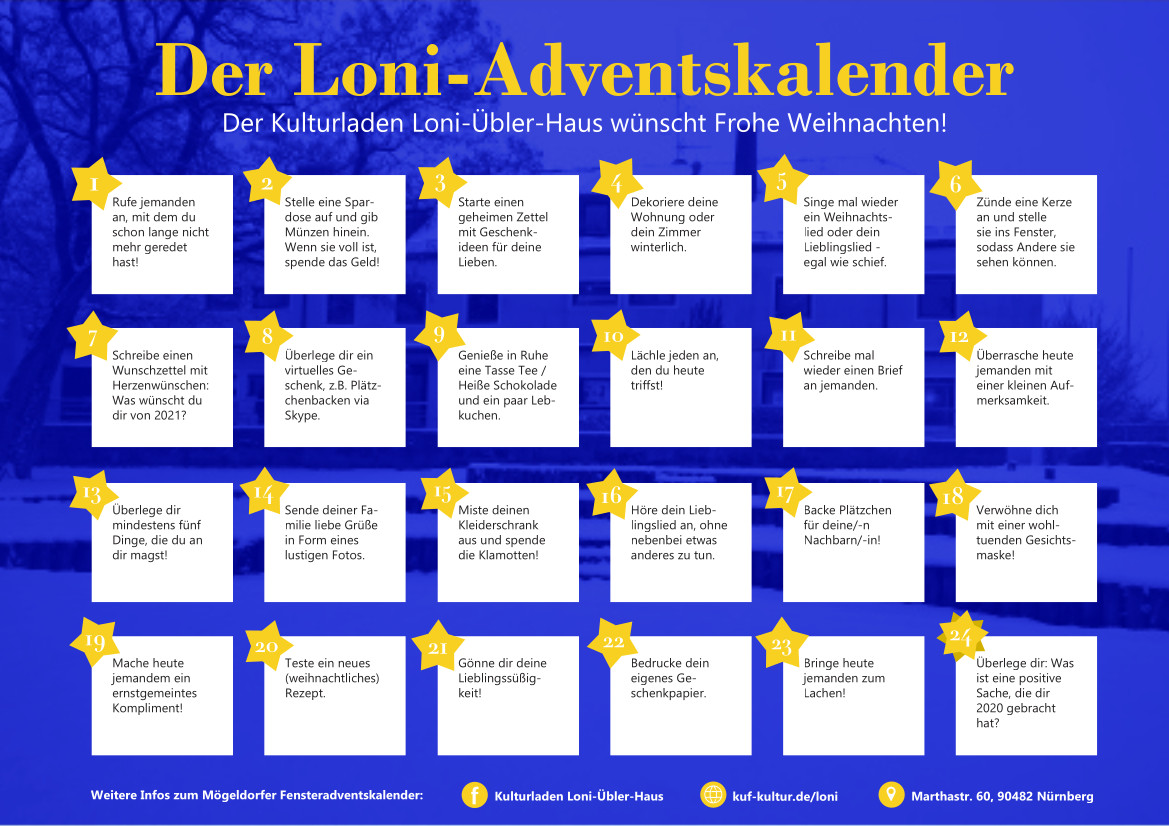 Der Kulturladen Loni-Übler-Haus hat in seinem Adventsfenster einen zusätzlichen Mini-Adventskalender mit kleinen Aufgaben für jeden Tag integriert. Die Aufgaben finden Sie hier online als Download (Design: Andrea Hozner).