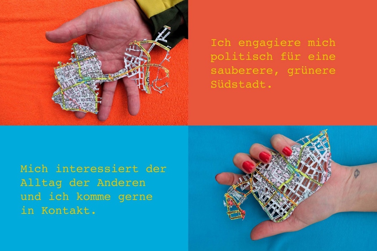 Das Kunstprojekt „Stadt in die Hand nehmen“ – beauftragt vom Amt für Kultur und Freizeit (Kuf) und wurde von der Nürnberger Künstlerin Regina Pemsl realsiert. Von Oktober 2020 bis Mai 2021 präsentierte KUF im südpunkt zahlreiche Bild- und Textpaare mit Händen und Aussagen von Stadtteilbewohnerinnen und Stadtteilbewohnern rund um den Maffeiplatz.