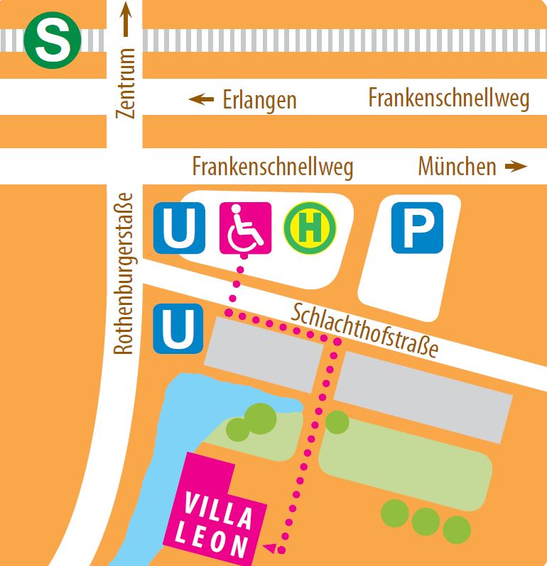 Die Villa Leon verfügt über keine eigenen Parkplätze. Parkmöglichkeiten gibt es Wochentags ab 17 Uhr und am Wochenende ganztags auf dem Parkplatz der Evenordbank an der Schlachthofstraße. Hierzu benötigen sie eine Parkgenehmigung der Villa Leon. Außerdem steht der Park&Ride Parkplatz auch an der Schlachthofstraße zur Verfügung.