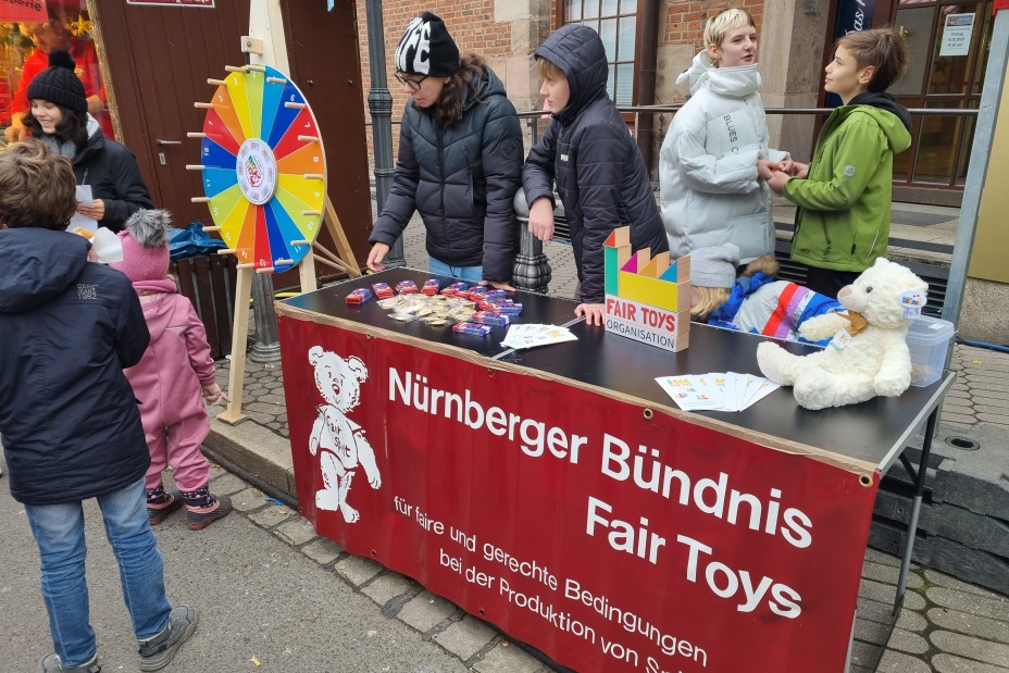 Vor diesem Hintergrund haben sich 2001 mehrere kirchliche und städtische Einrichtungen sowie Menschenrechtsgruppen zum „Nürnberger Bündnis Fair Toys" zusammengeschlossen, um sich gemeinsam für gerechte und menschenwürdige Arbeitsbedingungen in der Spielzeugproduktion einzusetzen.