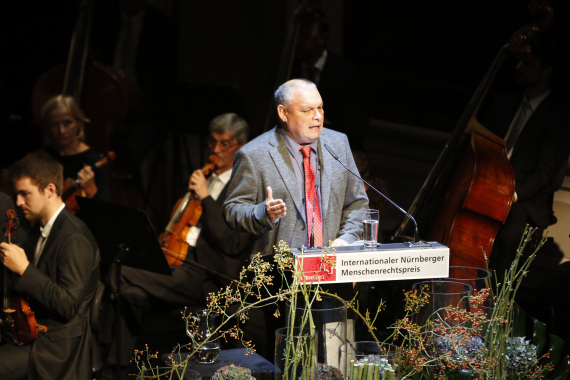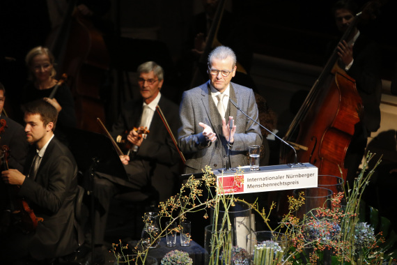 In seinem Grußwort lobte der ehemalige Bundespräsident Joachim Gauck Nürnberg als eine Stadt, die Fremde und Minderheiten willkommen heißt, und in der sich Menschen seit Jahrzehnten für den Schutz der Menschenrechte einsetzten. „Sie würdigen alle zwei Jahre Menschen, die sich zur Wehr setzen, weit über die eigene Existenz hinaus.“ Diese Menschen setzten sich trotz Ängsten und Verfolgungen für Menschenrechte ein. „Wir brauchen diese besonderen Vorbilder, die anderen zeigen, was in einem stecken kann.“
