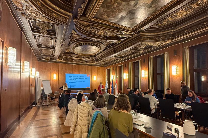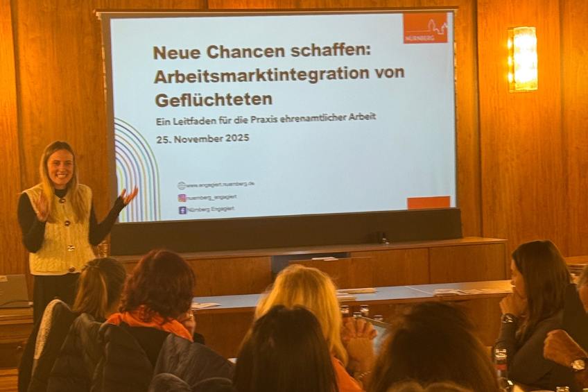 Am 25. November 2025 gaben Expert:innen aus Nürnberg – Susanne Wagner (IHK), Martina Kohler (bfz), Tamara Morro (Bildungsbüro, Stadt Nürnberg) und Katharina Schwartz (Stabstelle Bürgerschaftliches Engagement, Stadt Nürnberg) – praxisnahe Einblicke, wie Ehrenamtliche Geflüchtete beim Einstieg in den Arbeitsmarkt unterstützen können.