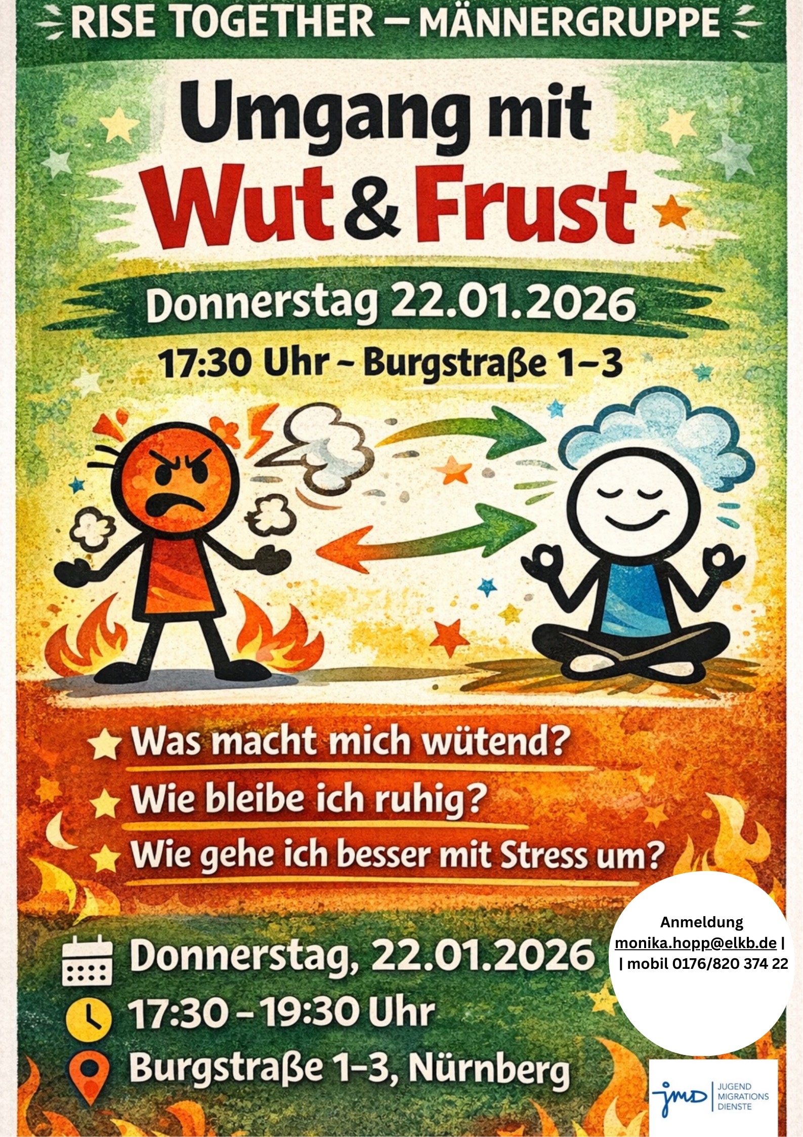Rise Together - Männergruppe Ein Angebot zum Umgang mit Wut und Frust findet von 17:30 bis 19:30 Uhr in der Burgstraße 1–2, Nürnberg statt. Anmeldung unter monika.hopp@elkb.de oder telefonisch unter 0176 82037422.