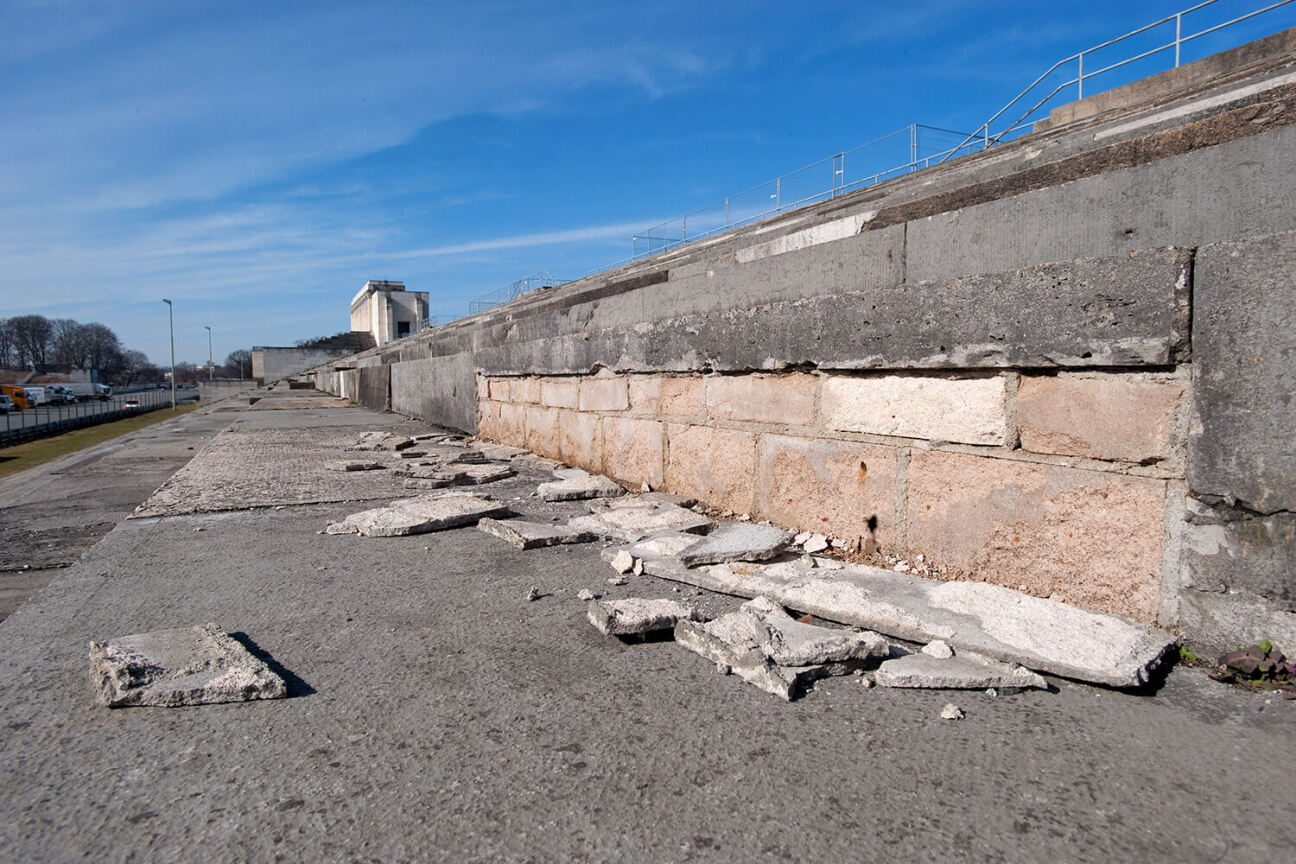 Seit Jahren werden Schäden an der Zeppelintribüne und der Wallanlagen trotz des kontinuierlichen Bauunterhalts deutlich. Regen und Frost haben den 1935/37 entstandenen Bauten immer stärker zugesetzt, so dass aus Sicherheitsgründen Teile nun mit einem Zaun abgesperrt werden mussten.