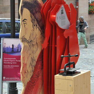 Die Open-Air-Präsentation mit sieben erzählenden Skulpturen-Stationen war als "Stadtgeflüster" gedacht. Es gab Begegnungen in der Burgstraße: mit einem Spekulanten, einem Medienmogul, einer Lichtgestalt, dem Kumpel, einem Kunstfreund und der Managerin-Ehefrau. Prototypen, die damals wie heute Schlüsselrollen spielen. Überlebensgroße Dürer-Silhouetten wiesen den Weg zu Hörstationen.