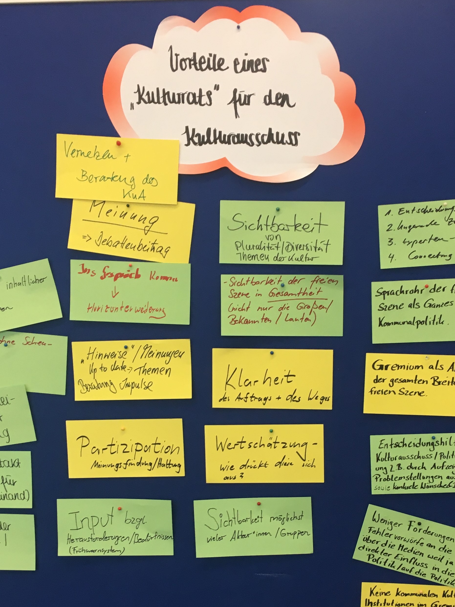 Um den politischen Rückhalt zu schaffen, wurden 2021, Workshops mit Mitgliedern des Kulturausschusses durchgeführt. In diesen Workshops konnte sich auf „Thesen“ verständigt werden, die als erste kulturpolitische Leitplanken für die Weiterarbeit verwendet werden. Diese Leitplanken werden während des Erarbeitungsprozesses an die Bedarfe und Möglichkeiten der Kulturschaffenden angepasst: