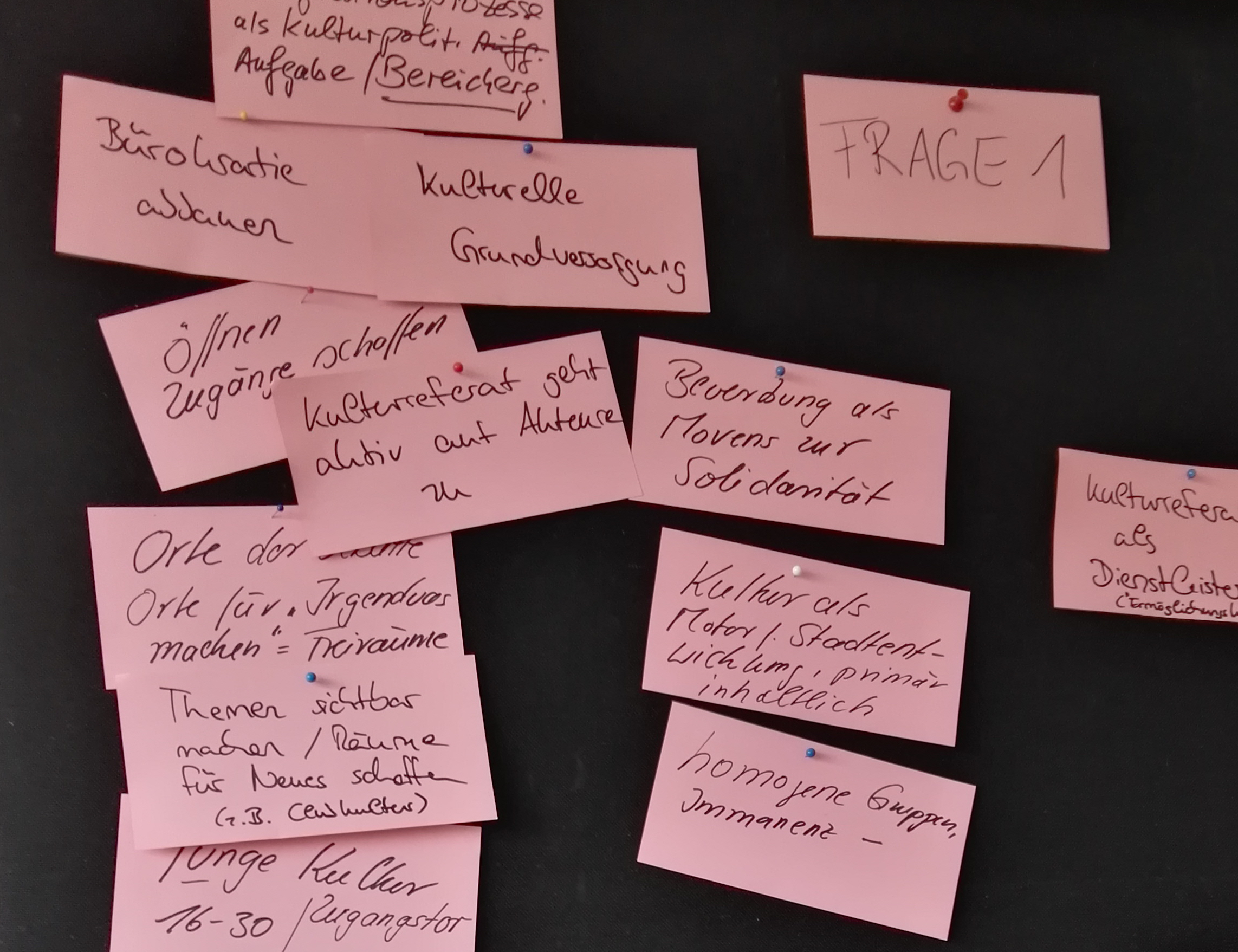 Außerdem wurden kleinere, temporäre „Fokusgruppen“ zu Themen wie „Kulturförderung“ und „Kulturelle Ermöglichungsräume“ ins Leben gerufen. Ziel dieser war es, bei der Umsetzung der Kulturstrategie die Perspektive der (freien) Kulturschaffenden mitdenken zu können.