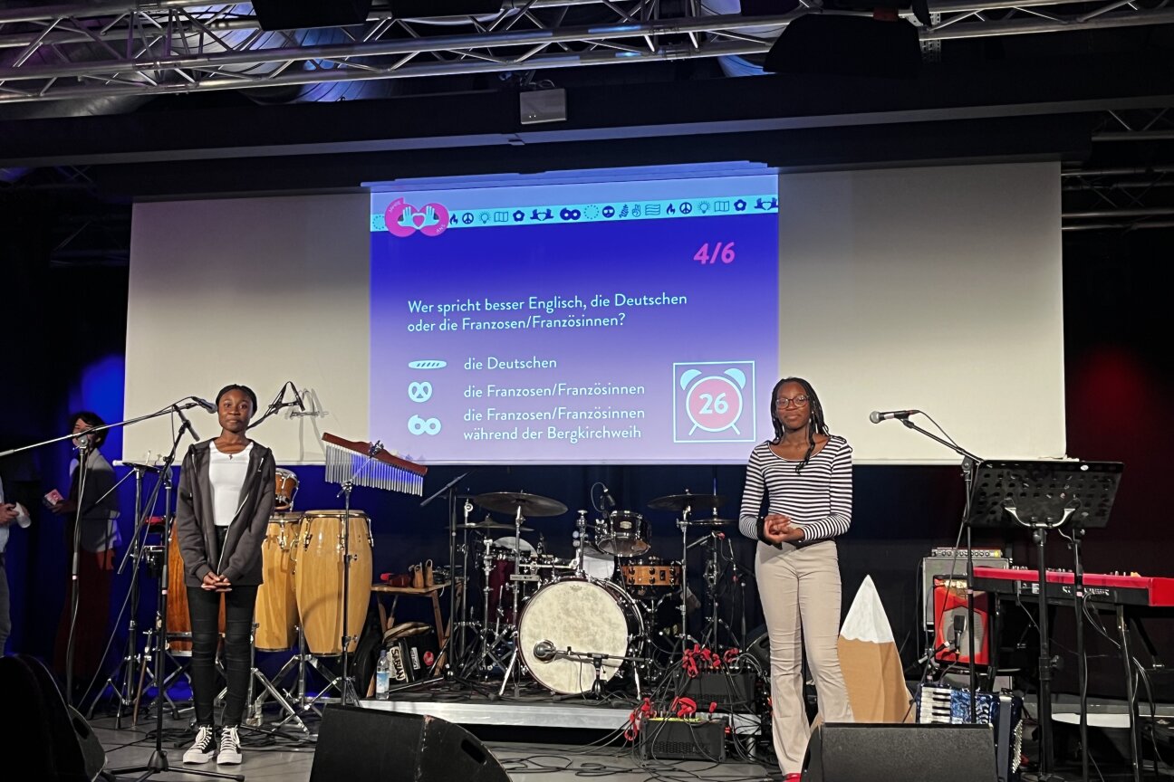 Die Französisch-Klasse 8bc von Herrn Fast nahm am 25. Januar am Jubiläumsfest, anlässlich des 60. Jahrestags des Elysee-Vertrags, des Deutsch-Französischen Instituts im E-Werk Erlangen teil. Als Teil des Abendprogramms haben die SchülerInnen ein Bistrot-Quiz mit interessanten und lustigen Fragen (z.B. „Was ist die Lieblingsspeise von Olaf Scholz?“ „Wie ging das letzte Fußballspiel zwischen Deutschland und Frankreich aus?“) zum Deutsch-Französischen Verhältnis vorbereitet und den etwa 250 Gästen auf der Bühne erfolgreich präsentiert. Zuvor besuchten die SchülerInnen das Deutsch-Französische Institut in Erlangen und wurden von der aktuellen FranceMobil-Lektorin Mahault Sturm-André für den Bereich Nordbayern und der Institutsleitung Rachel Gillio mit einem Städte-Musik Quiz im Institut begrüßt, bevor es zur Crêpe-Verköstigung als Stärkung für den Abend ging. Im Anschluss daran hatten die SchülerInnen ihren großen Auftritt im E-Werk