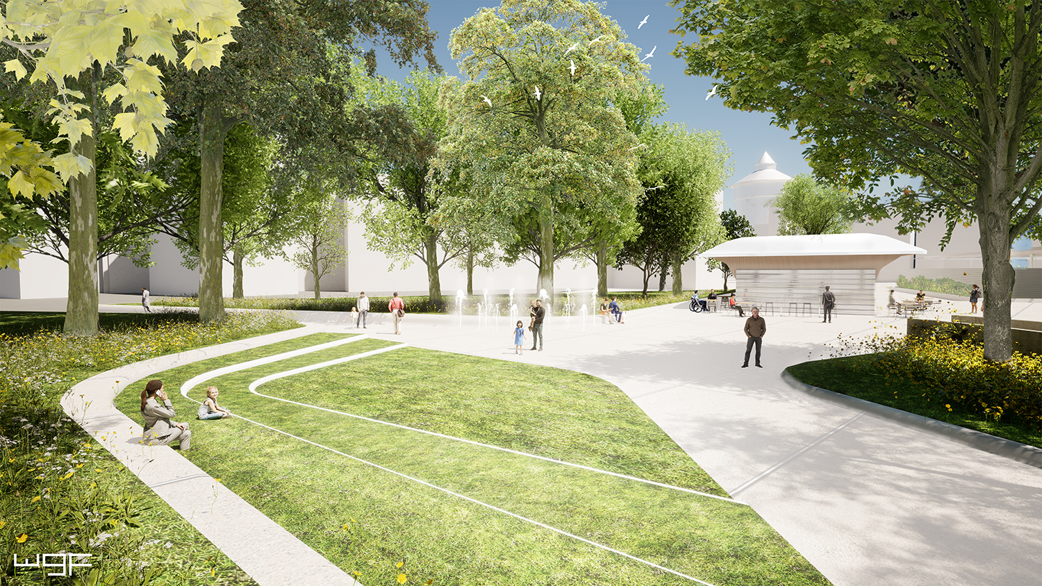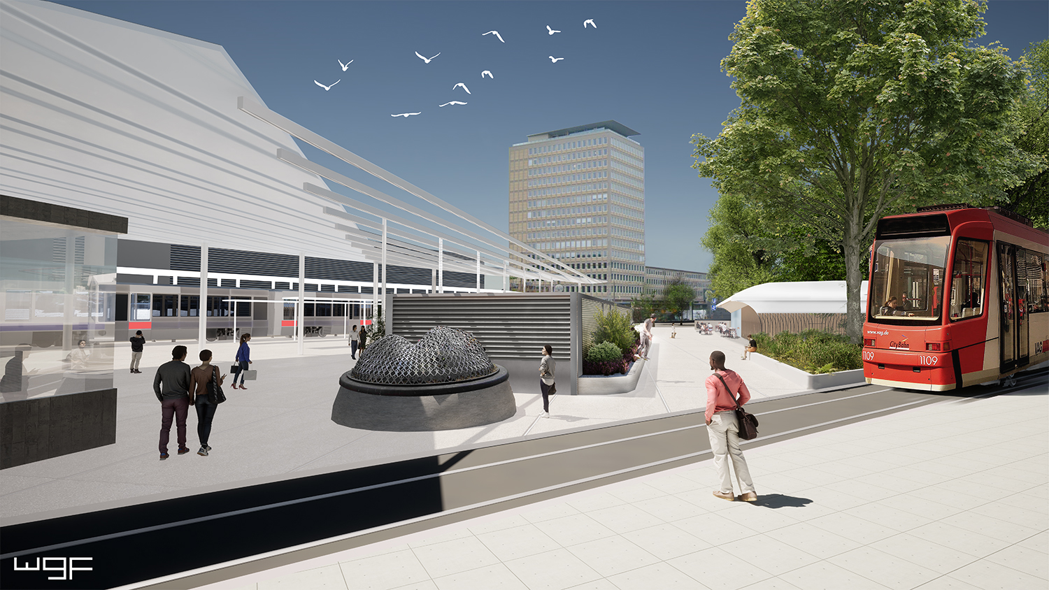 Der zentrale "Plärrerplatz" bietet künftig schattige Sitzmöglichkeiten, ein Wasserspiel sowie am östlichen Rand das Funktionsgebäude. Neben einem T-Store, der Fahrscheine sowie kleine Snacks und Getränke verkauft, beherbergt es das öffentliche WC sowie den Pausenraum für das Fahrpersonal der VAG.