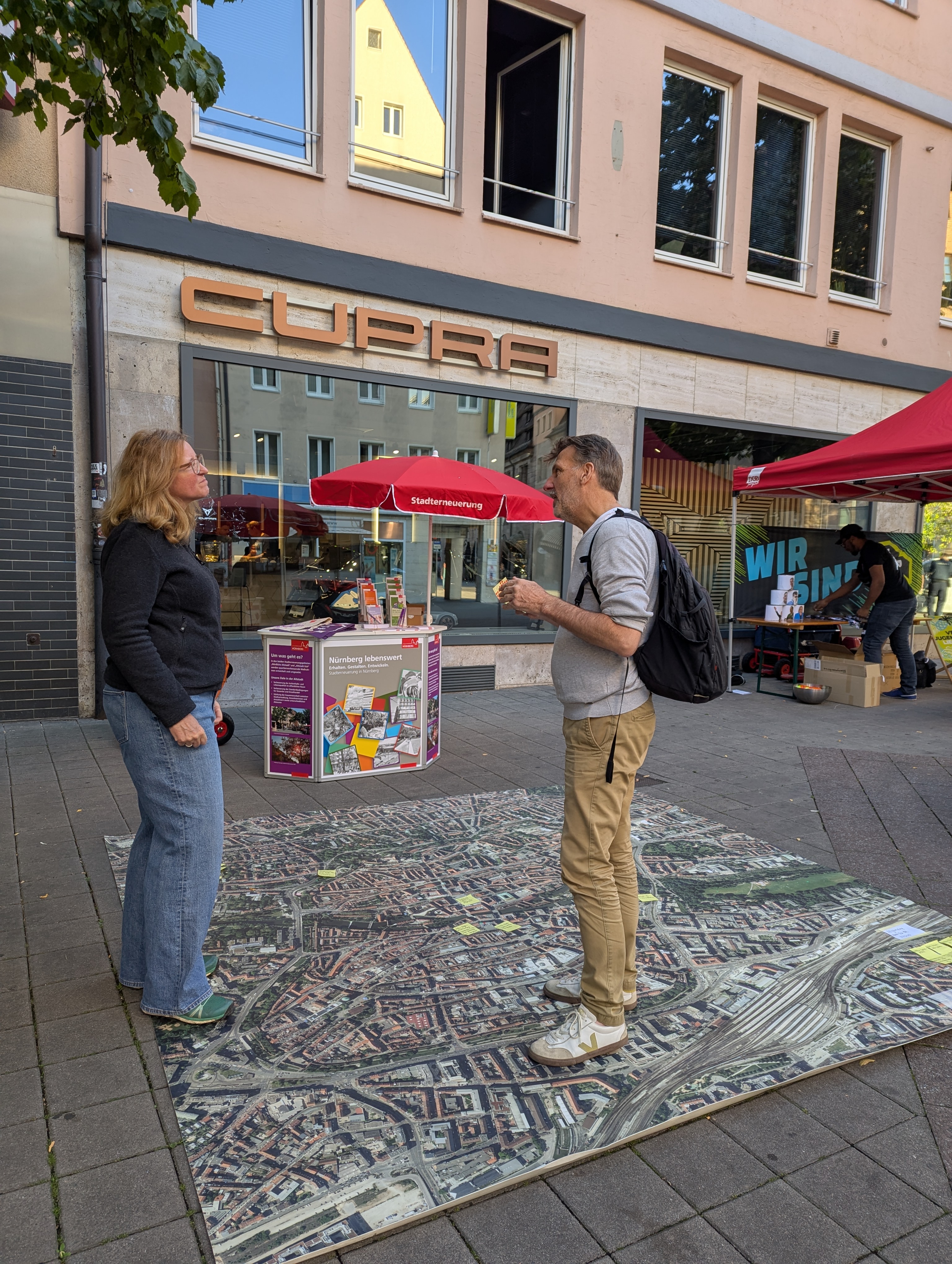 Das Quartiersmanagement Altstadt beteiligte sich am 12.09.2025 mit einem Stand an der Klara-Kärwa in der Klaragasse. Passantinnen und Passanten wurden hier zu ihren Lieblingsorten und zu Ideen und Verbesserungsvorschlägen für die Altstadt befragt. Zudem bestand die Möglichkeit Orte anzugeben, an denen sie sich nicht gerne aufhalten und unwohl fühlen. Auf einem Luftbild der Altstadt konnten die Teilnehmenden mit grünen Punkten (Lieblingsorte/Aufenthaltsorte), roten Punkten (Orte mit Verbesserungsbedarf) und post-its (Wünsche/was fehlt?) ihre Antworten verorten.