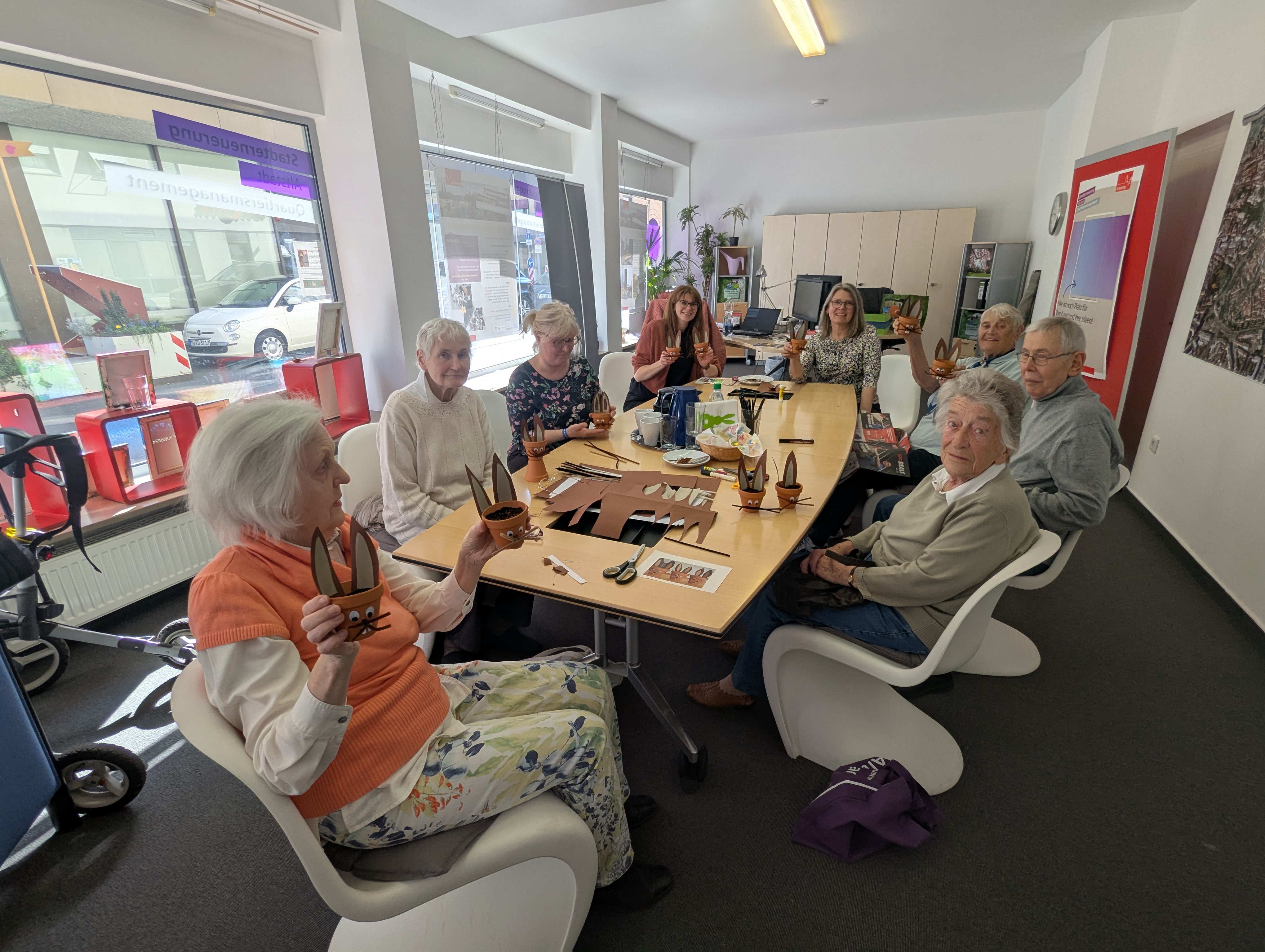 Gemeinsam mit dem Seniorennetzwerk Altstadt fand Anfang April ein Bastelnachmittag im Quartiersbüro Altstadt statt. Die teilnehmenden Seniorinnen und Senioren gestalteten, bei Kaffee und Osterbrot, Blumentöpfe im Hasendesign und bepflanzten diese mit Kresse bzw. Katzengras.