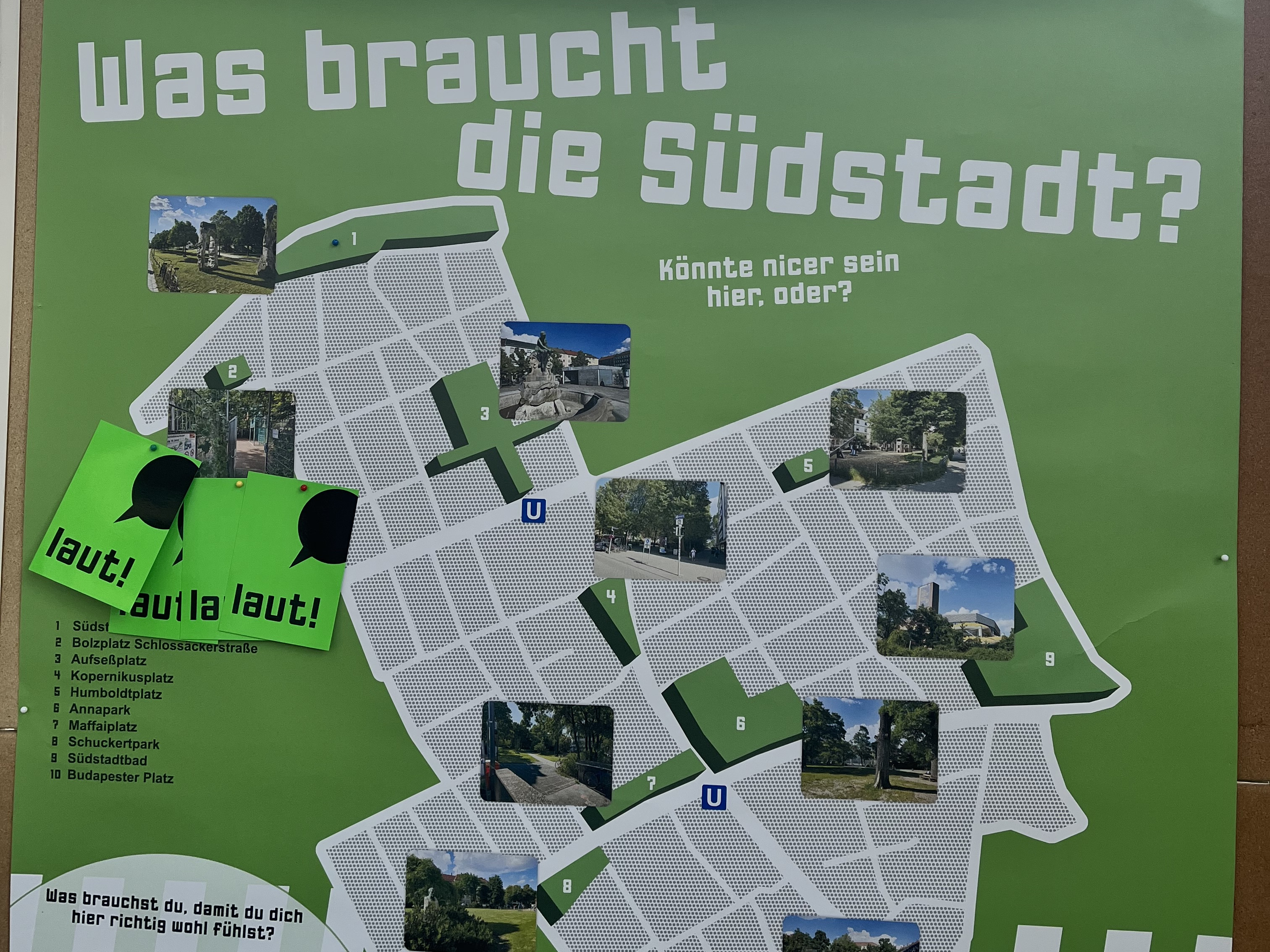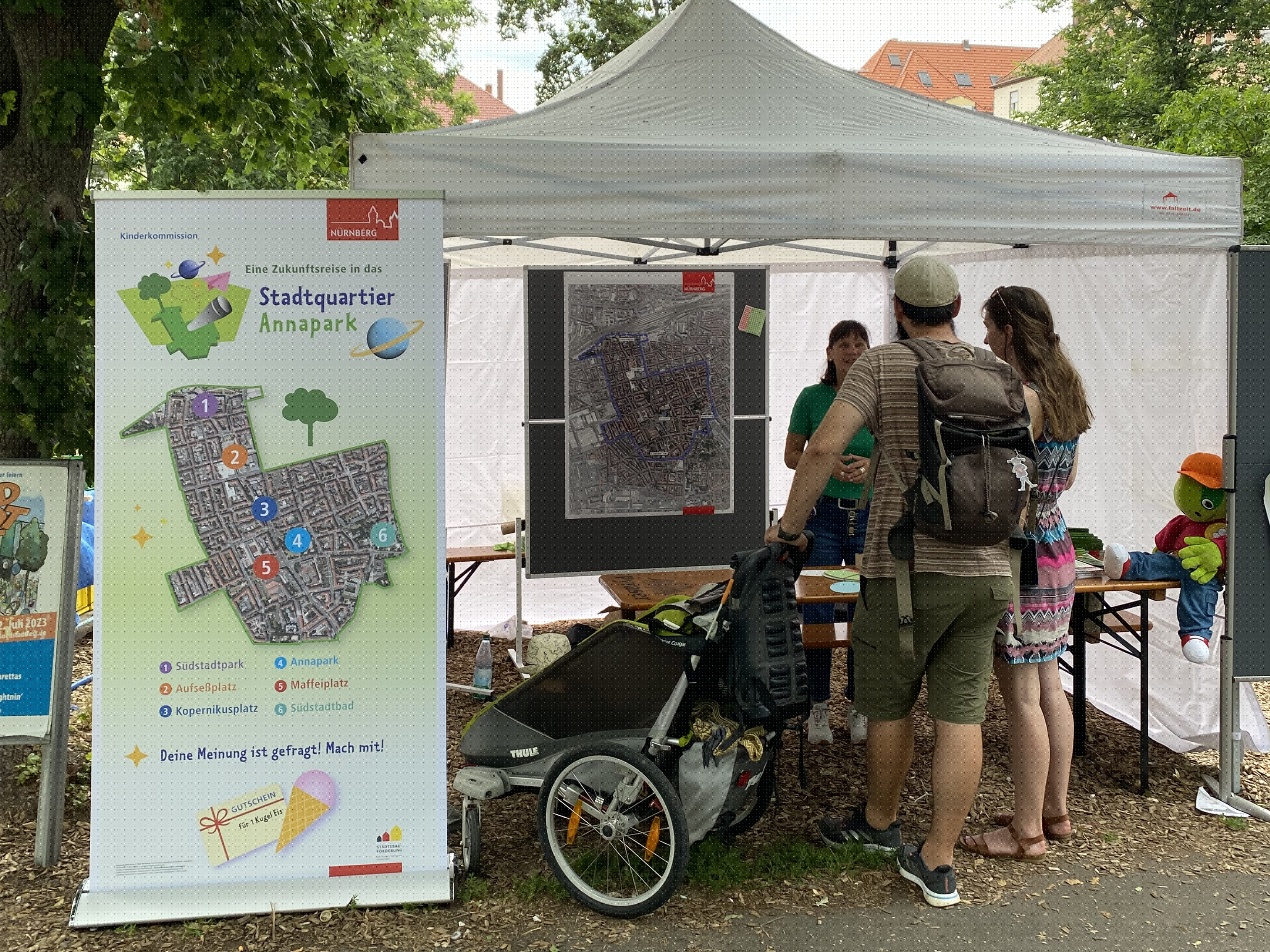 Zentraler Bestandteil eines Stadterneuerungsprozesses ist die Beteiligung der Bürgerinnen und Bürger vor Ort. Ihr lokales Wissen sowie ihre Wünsche und Bedarfe wurde eng eingebunden. Als erstes Format fand im März 2024 die Onlinebeteiligung statt: Interessierte konnten ihr Lob, ihre Kritik und ihre Wünsche zu Orten und Themen im Untersuchungsgebiet auf der Beteiligungsplattform der Stadt Nürnberg einbringen. Zudem fand 2024 eine umfassende Kinder- und Jugendbeteiligung statt,, die Ergebnisse flossen in die Ergebnisse der vorbereitenden Untersuchungen ein. Auf dem Südstadtfest in den Jahren 2024 und 2025 hatten alle Interessierten die Möglichkeit, sich über die Planungen und den Projektfortschritt zu informieren und eigene Anliegen einzubringen.