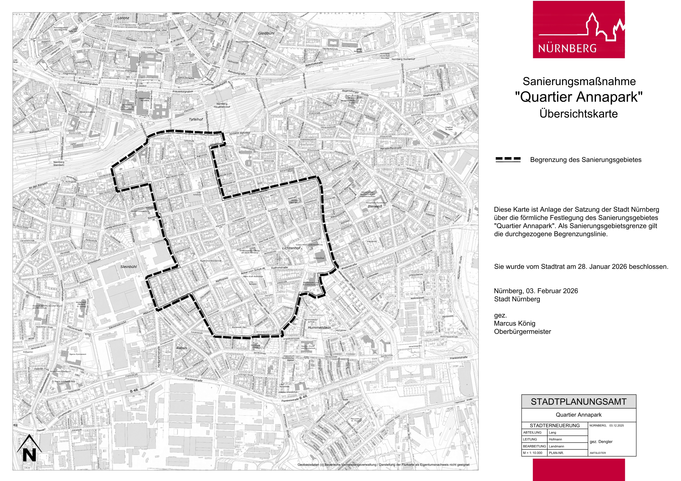 Die förmliche Festlegung des Sanierungsgebietes Quartier Annapark wurde am 28. Januar 2026 vom Stadtrat der Stadt Nürnberg beschlossen.