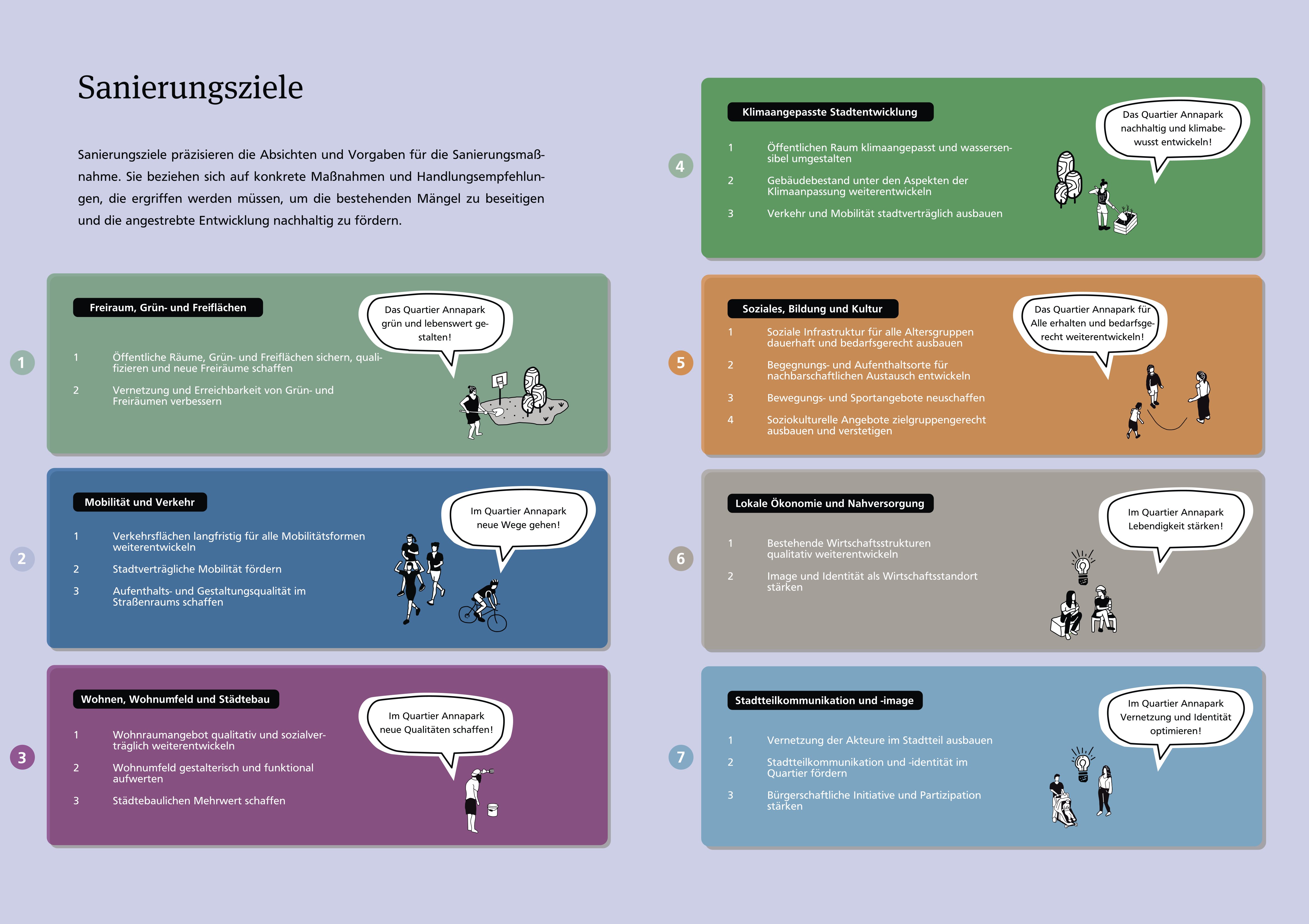 Im Rahmen des Stadterneuerungsprozesses wird der Stadtteil auf Entwicklungschancen überprüft. Diesen Prozess nennt man „Vorbereitende Untersuchungen“ (VU). In den meisten Gebieten gibt es zusätzlich noch ein sogenanntes „Integriertes Stadtteilentwicklungskonzept“ (INSEK). Als Ergebnis entstehen Entwicklungsziele für das Gebiet. Hinzu kommen Handlungsempfehlungen, wie diese Ziele erreicht werden können. All das wird in Broschüren dokumentiert, die hier online oder im Quartiersbüro gedruckt erhältlich sind. Die wichtigsten Ziele finden Sie hier zusammengefasst: