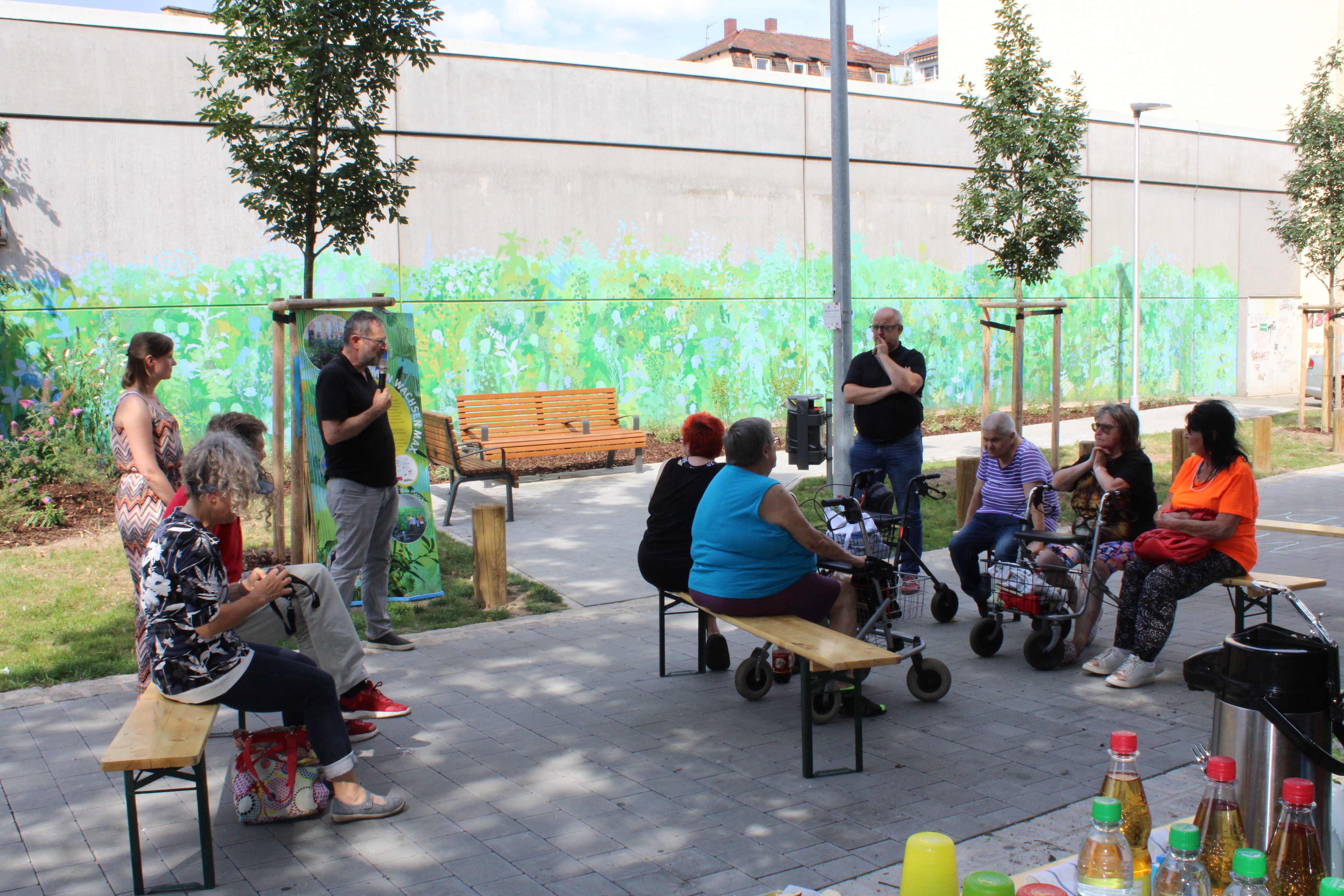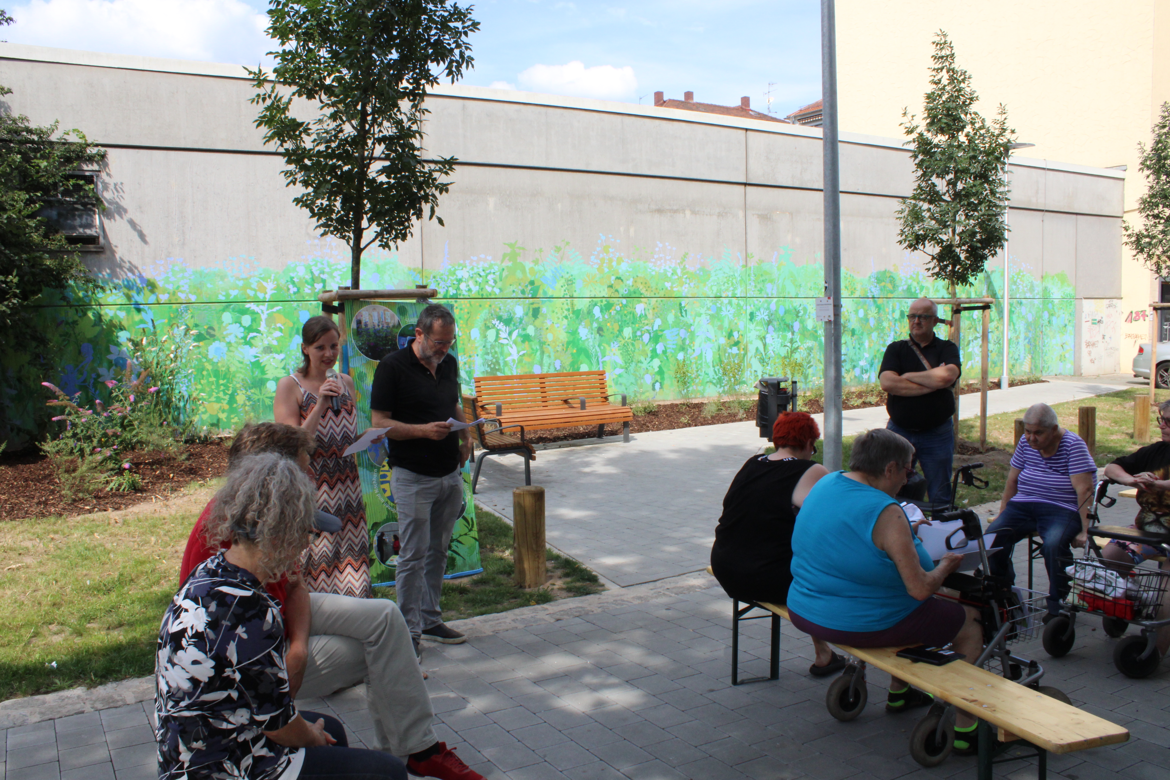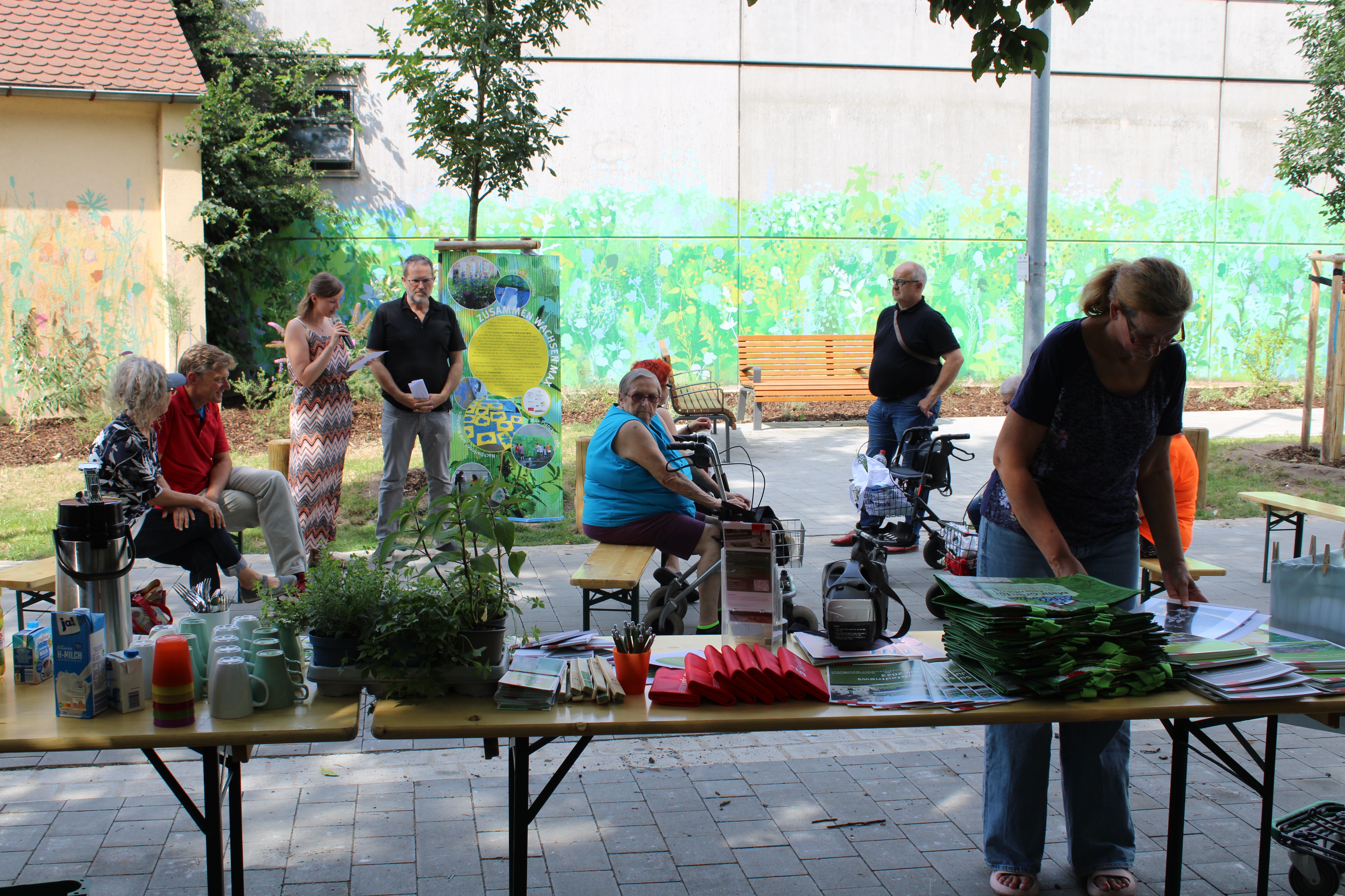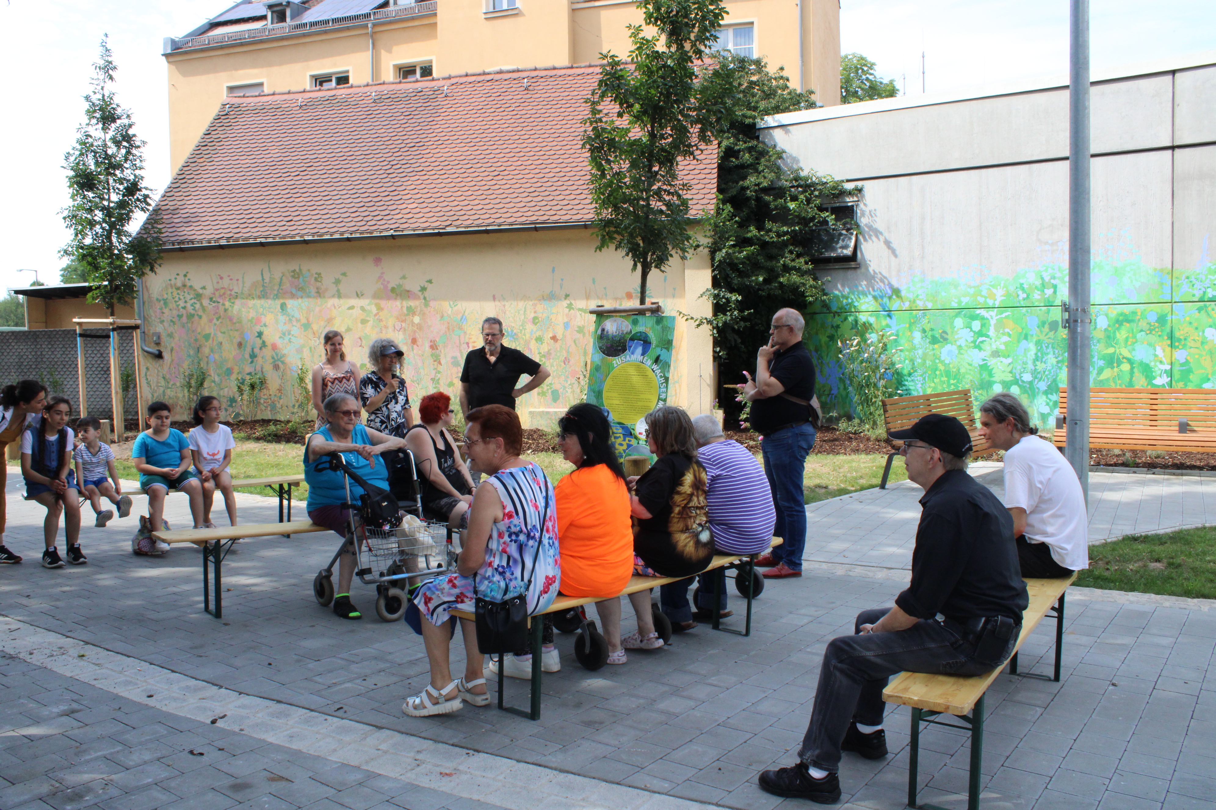 Am Freitag, den 19.07.2024, kamen Anwohnende und Interessierte des Quartiers zusammen, um mit dem Leiter des Stadtplanungsamtes, dem Quartiersmanagement und der Künstlerin, die offizielle Eröffnung des Pocket Parks zu feiern.