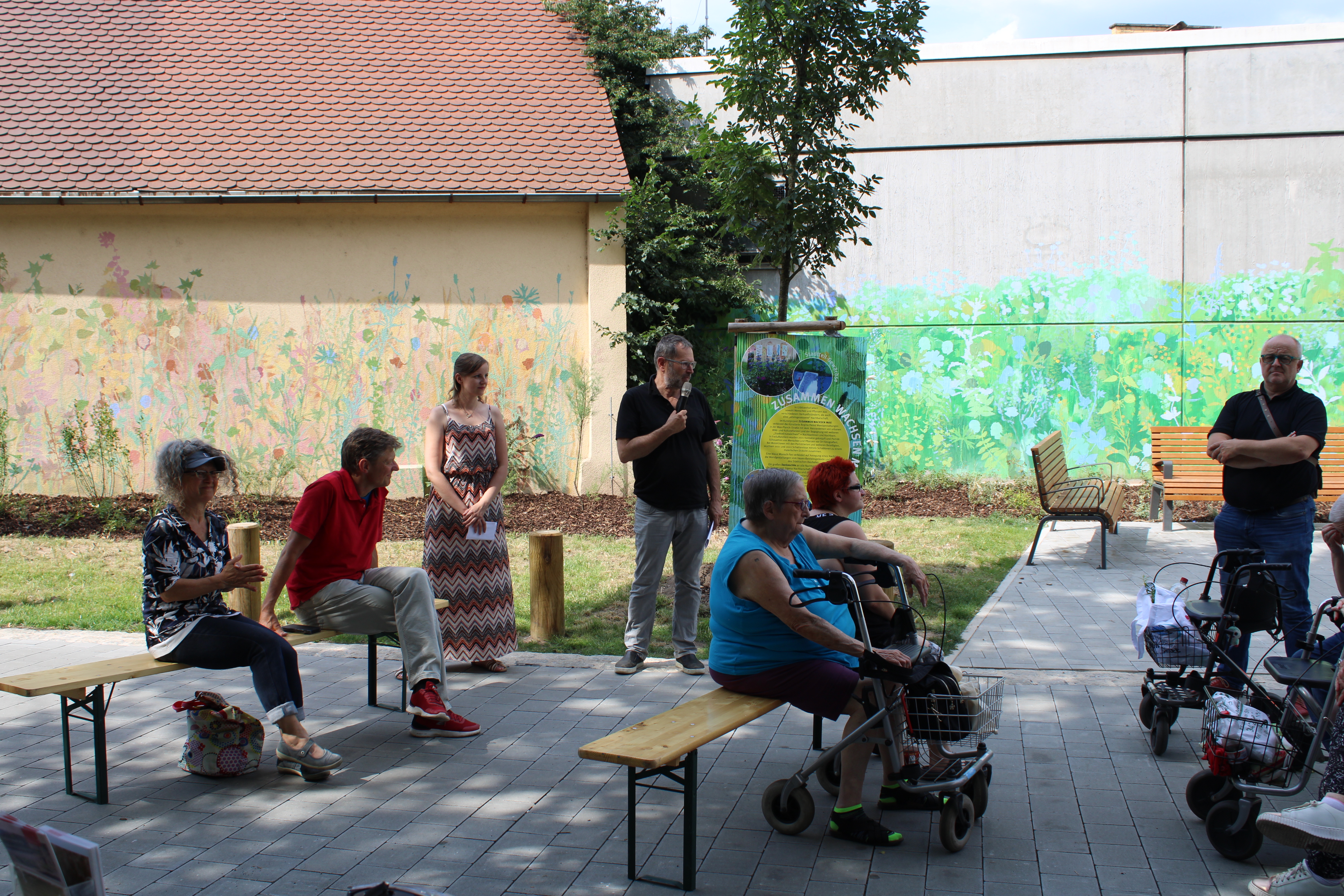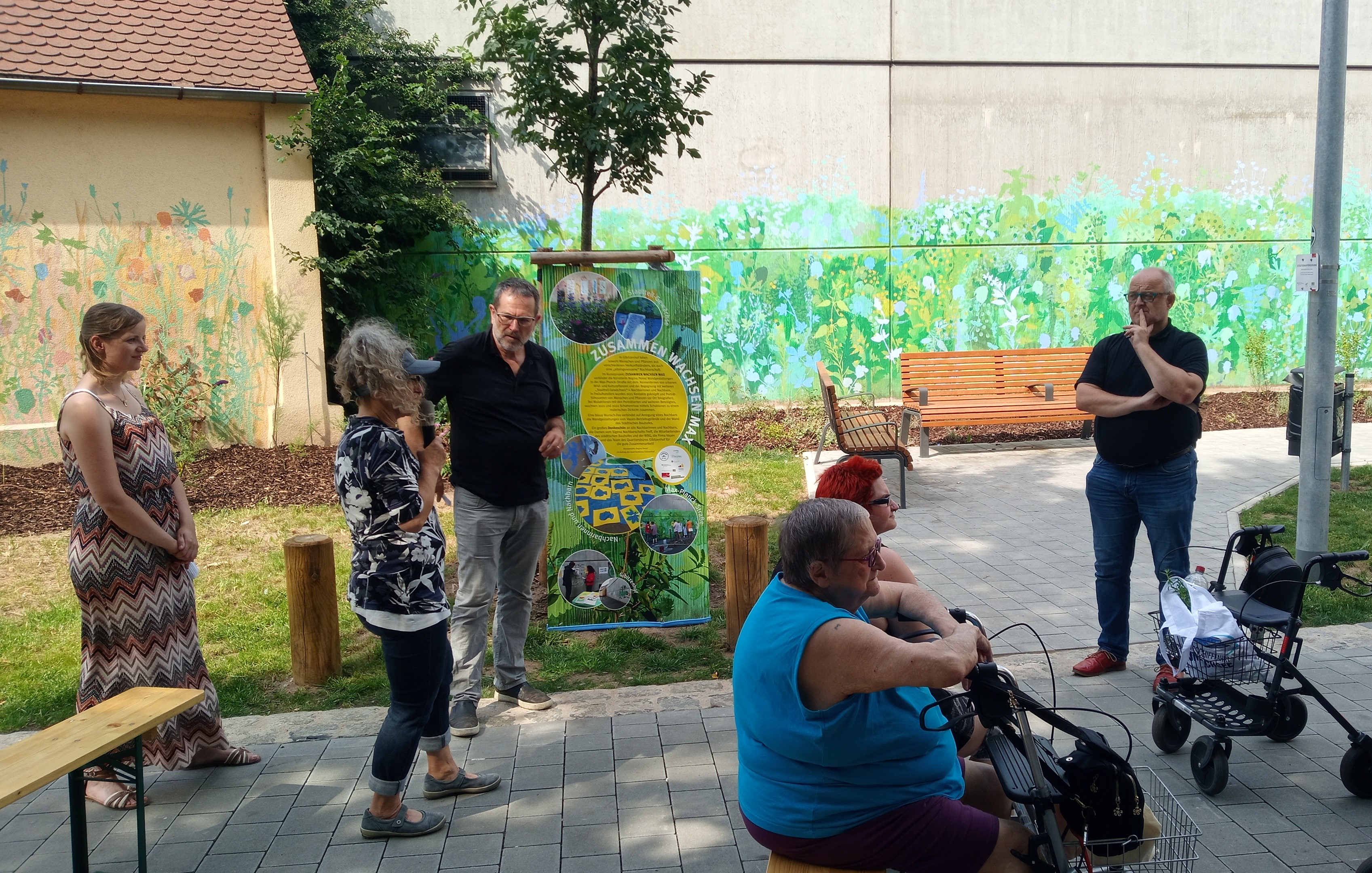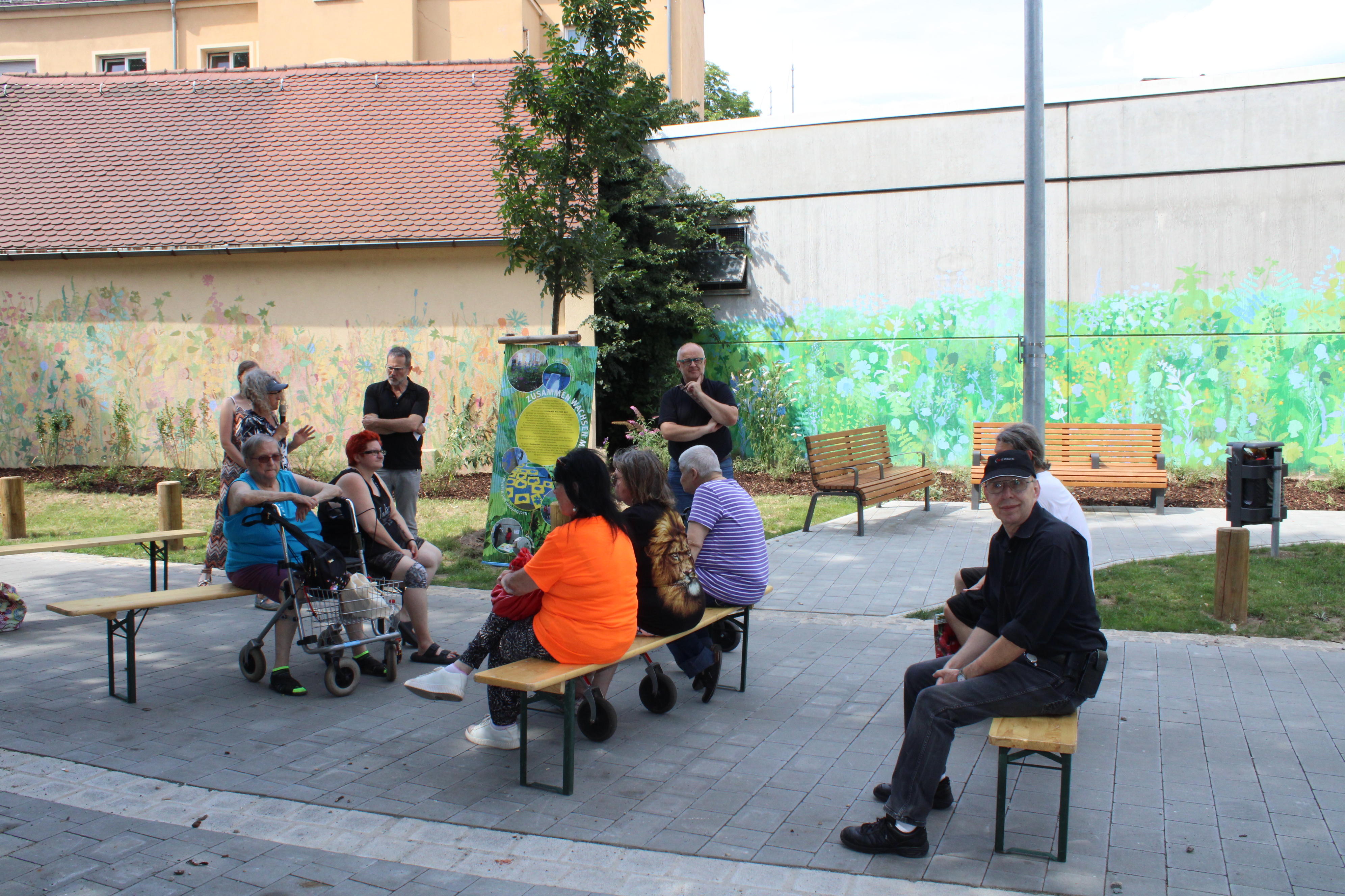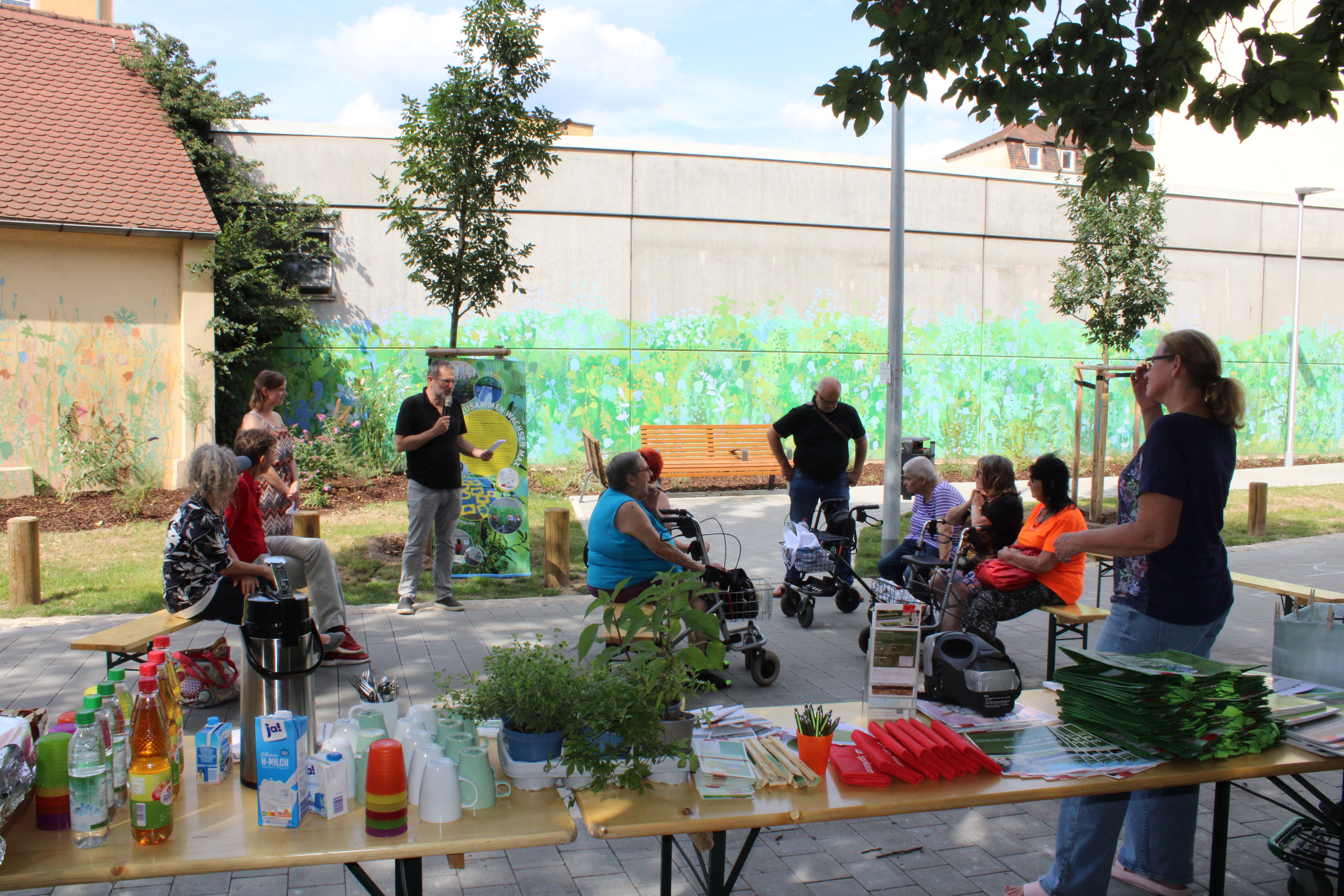 Am Freitag, den 19.07.2024, kamen Anwohnende und Interessierte des Quartiers zusammen, um mit dem Leiter des Stadtplanungsamtes, dem Quartiersmanagement und der Künstlerin, die offizielle Eröffnung des Pocket Parks zu feiern.