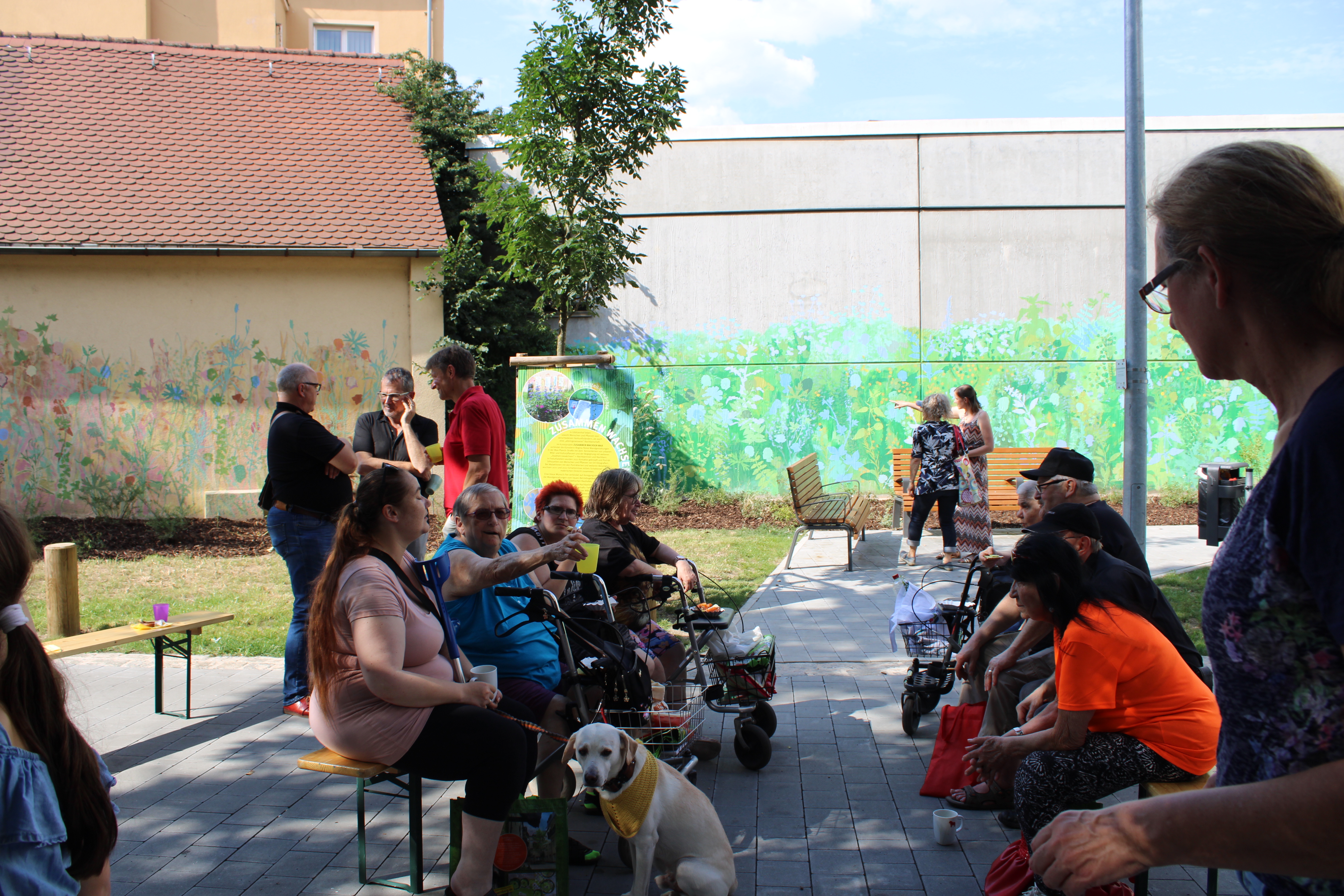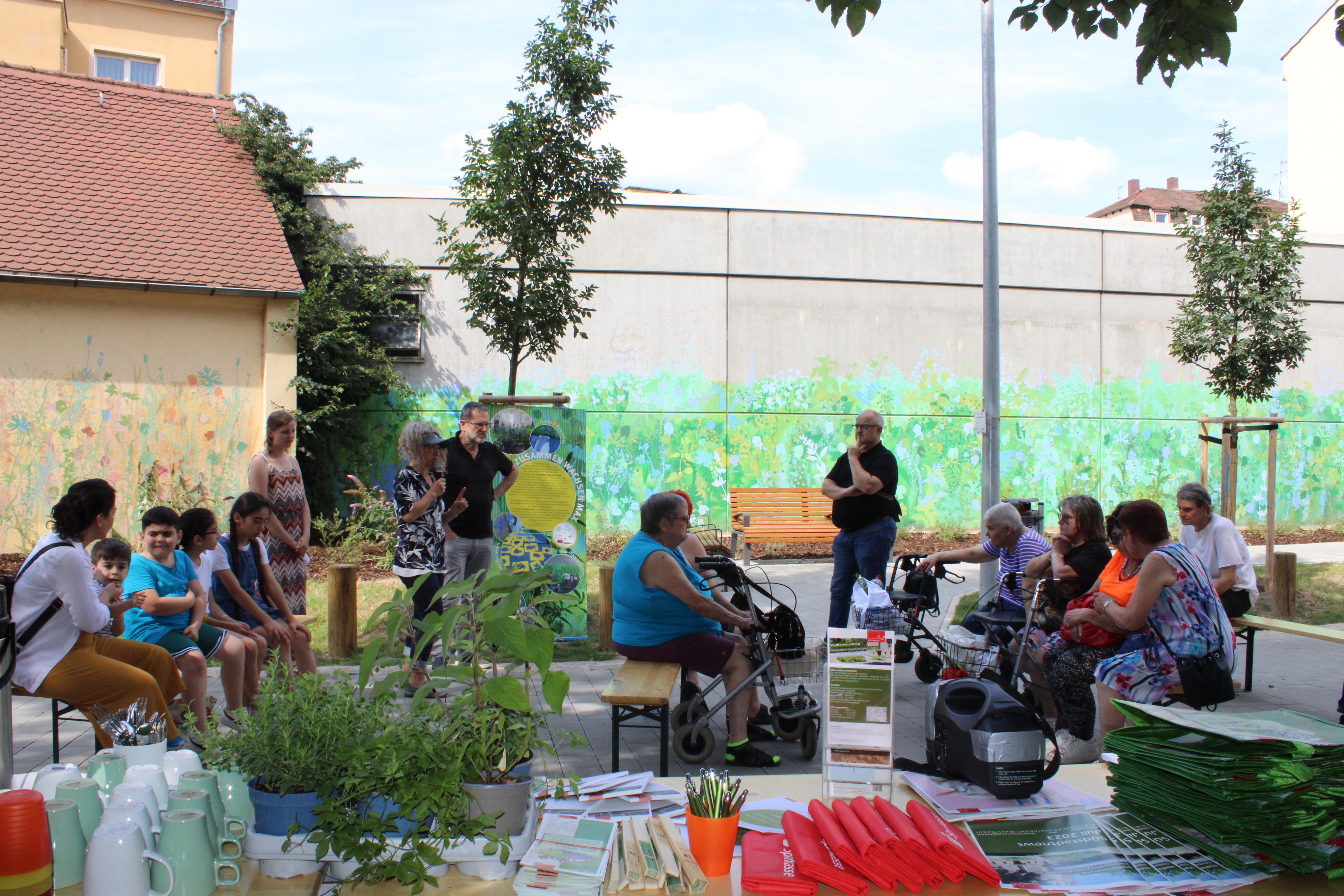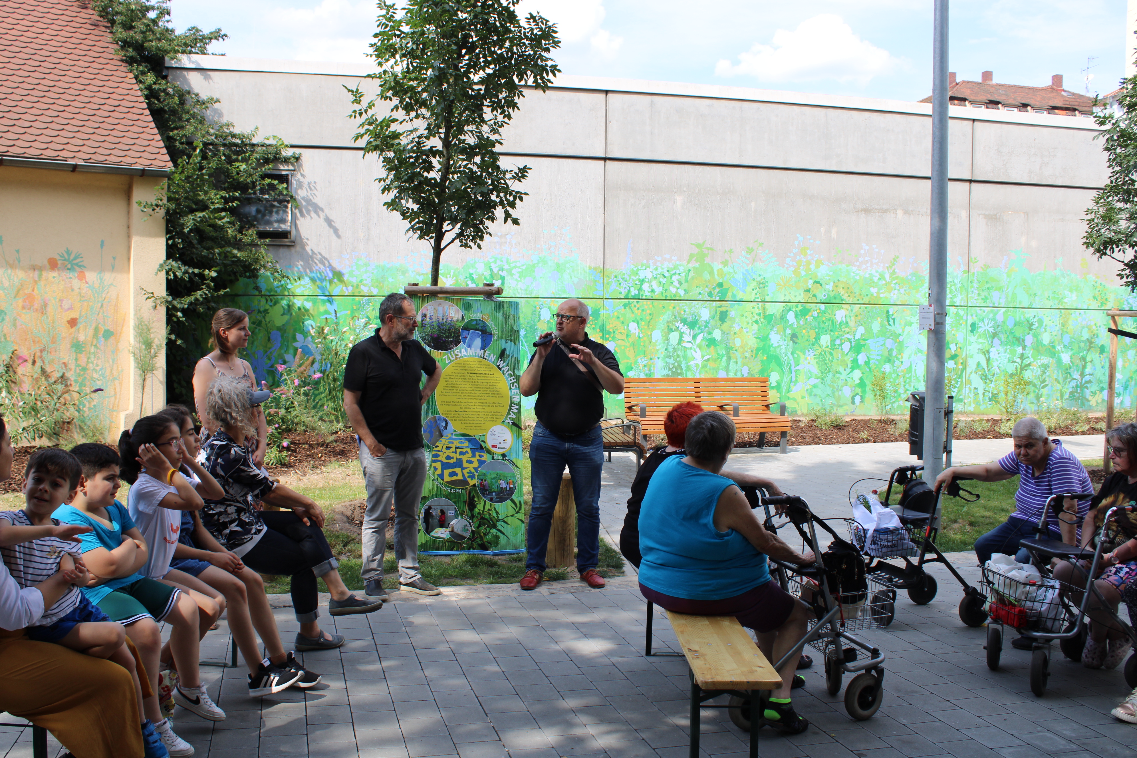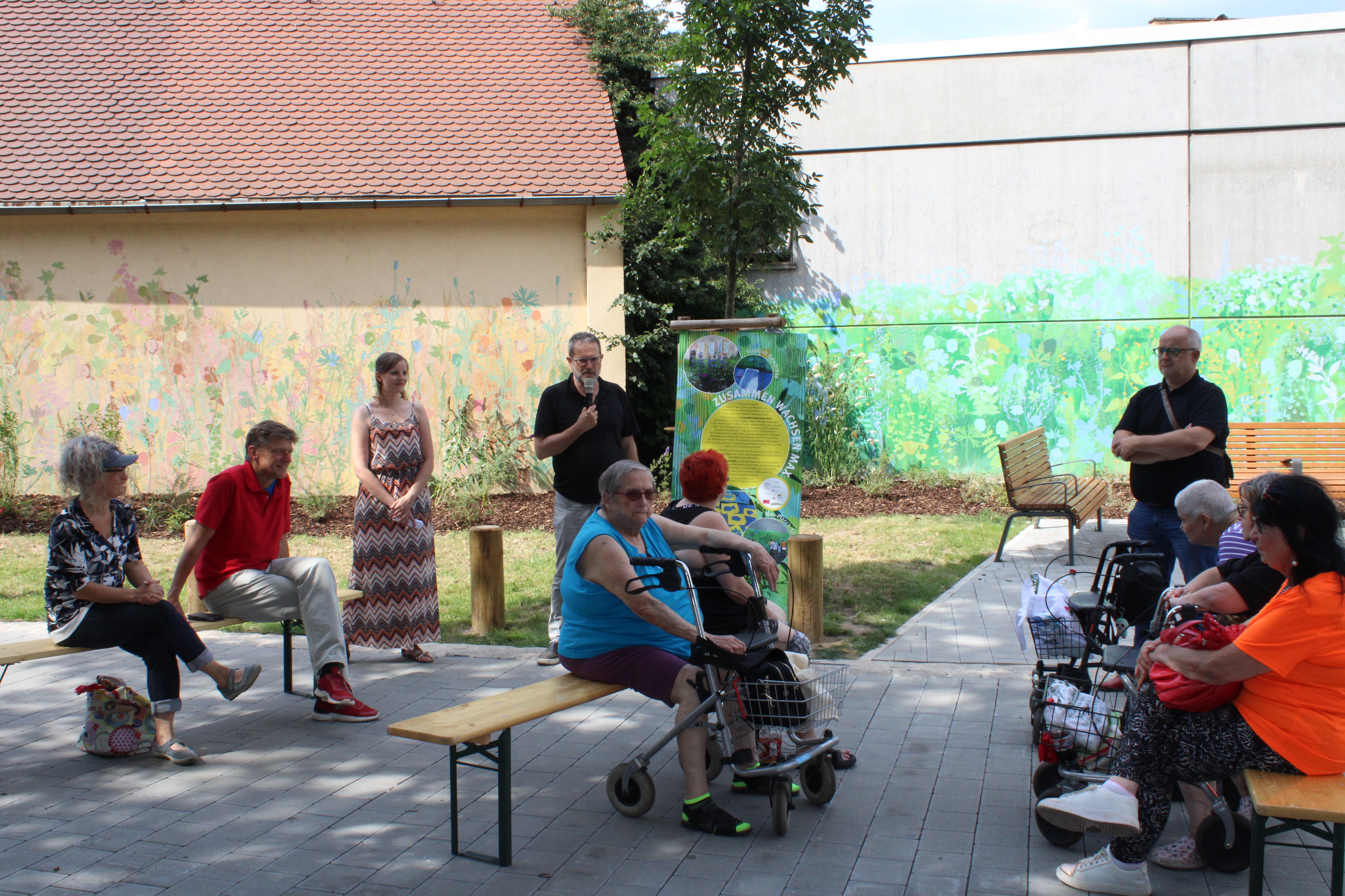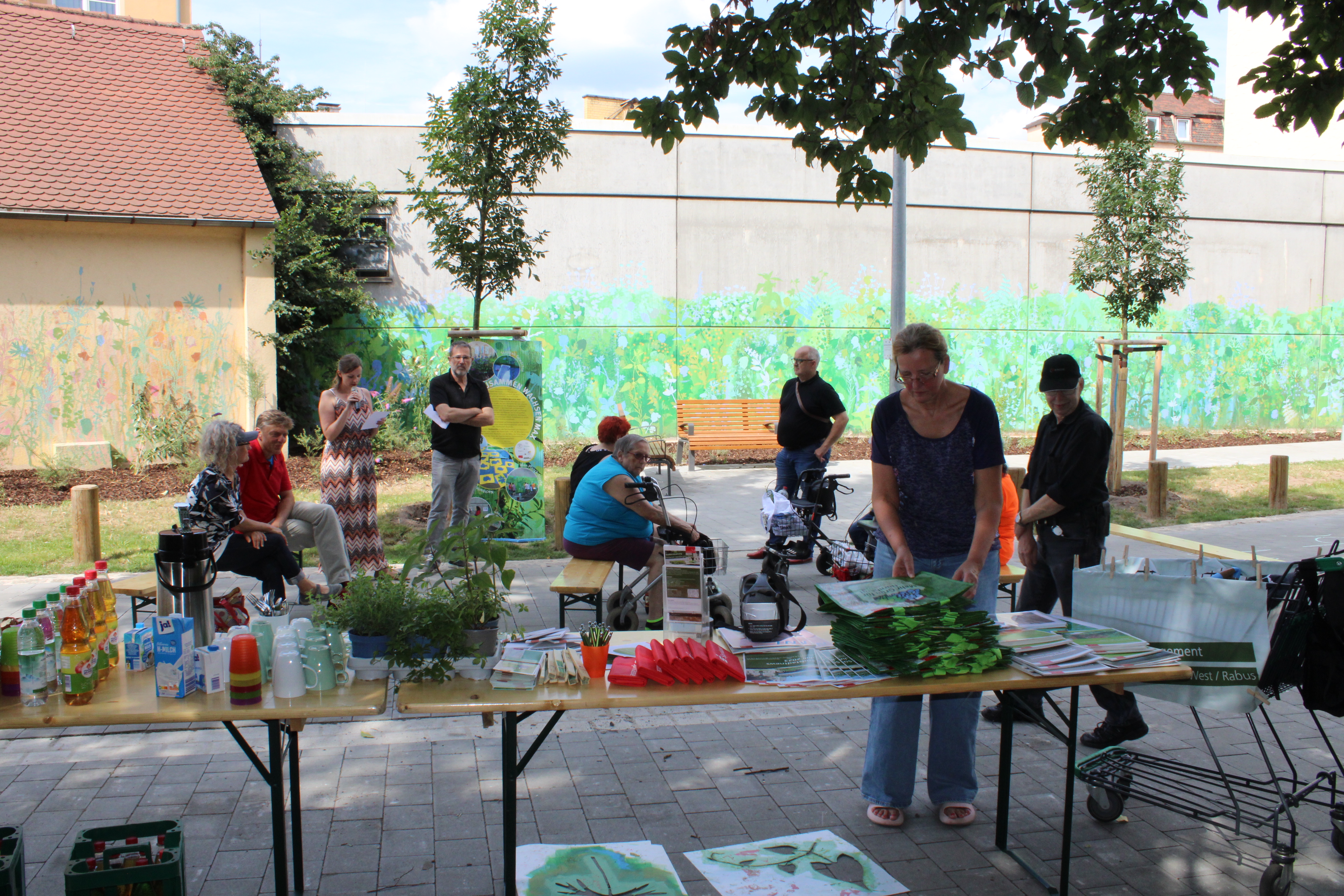 Am Freitag, den 19.07.2024, kamen Anwohnende und Interessierte des Quartiers zusammen, um mit dem Leiter des Stadtplanungsamtes, dem Quartiersmanagement und der Künstlerin, die offizielle Eröffnung des Pocket Parks zu feiern.