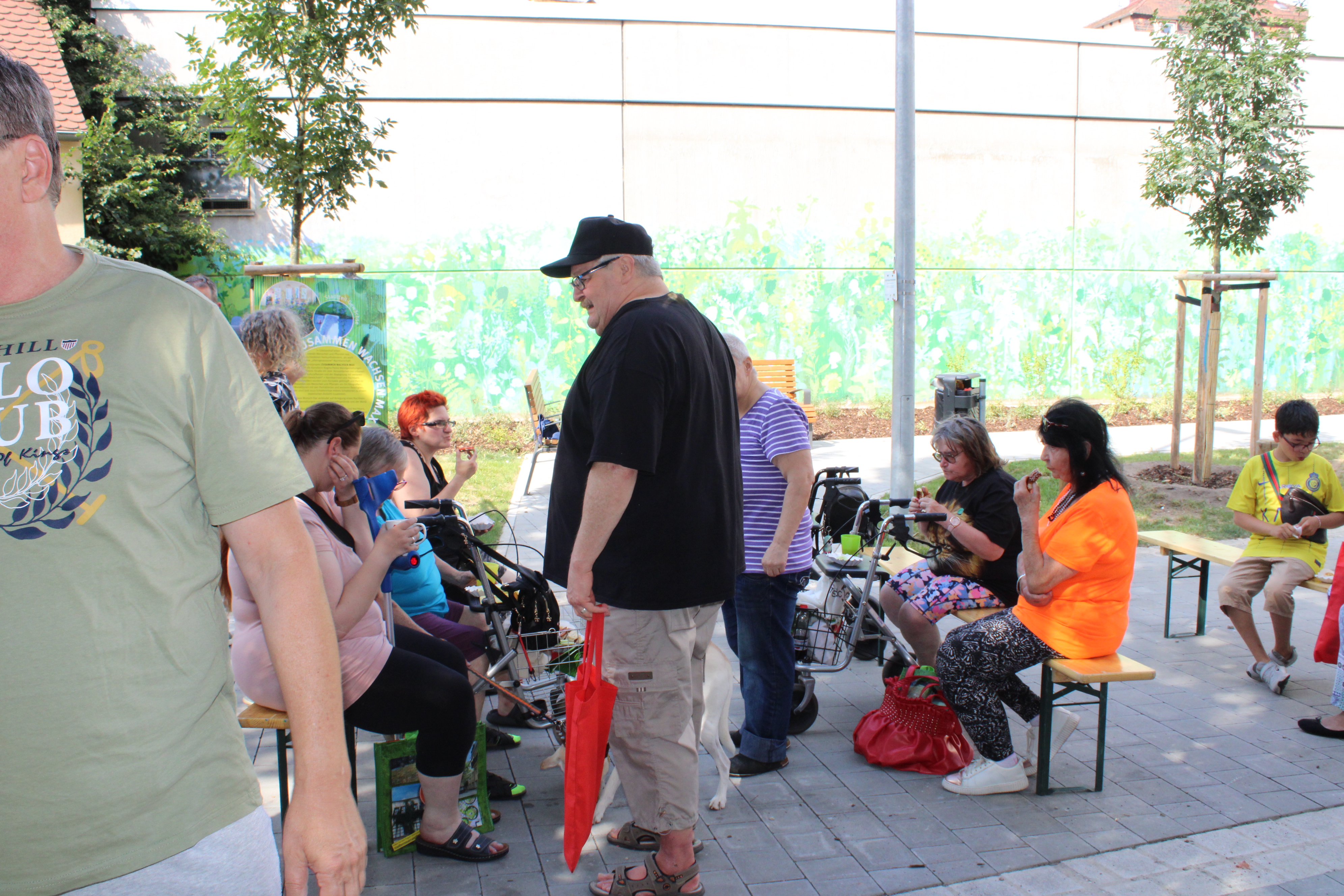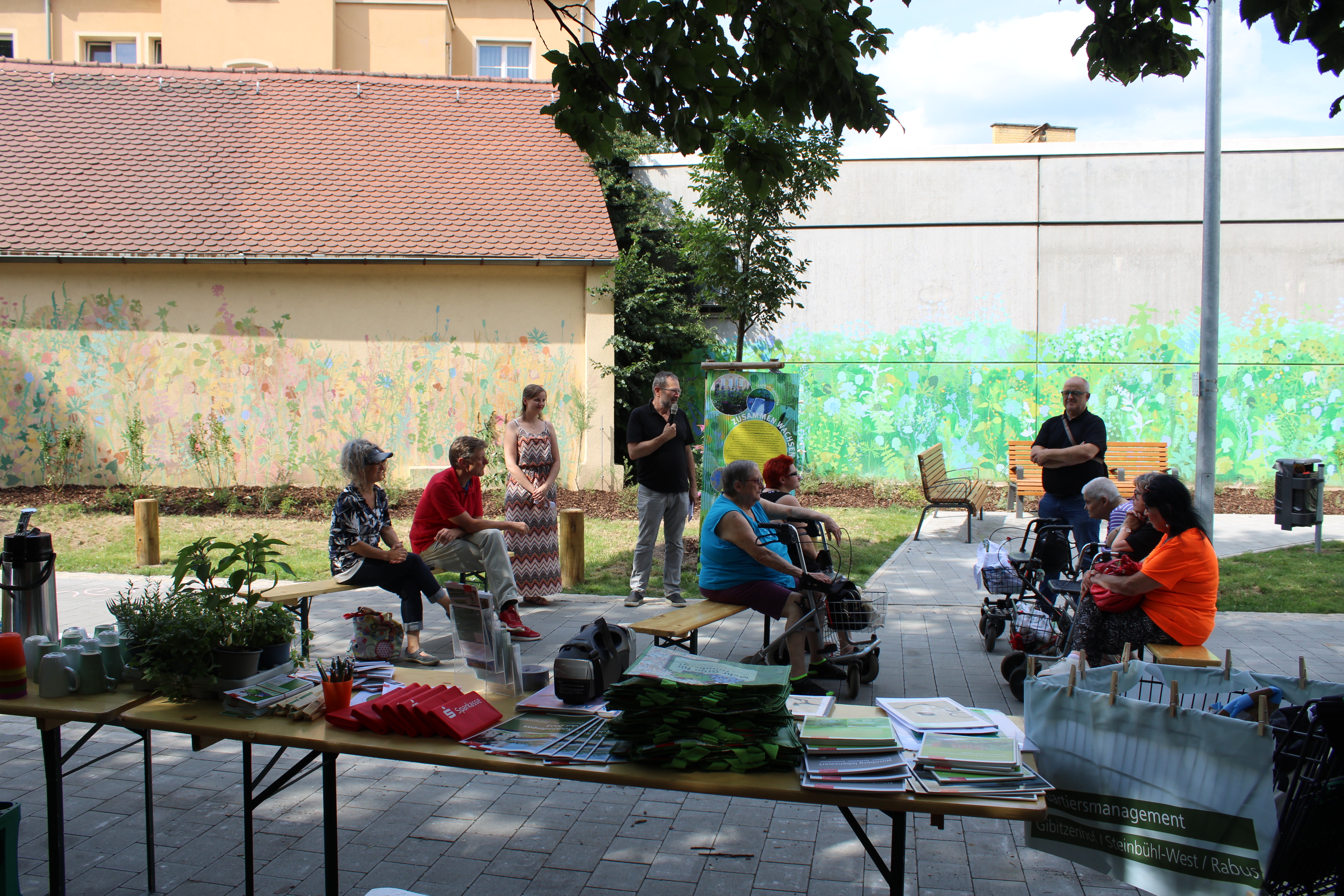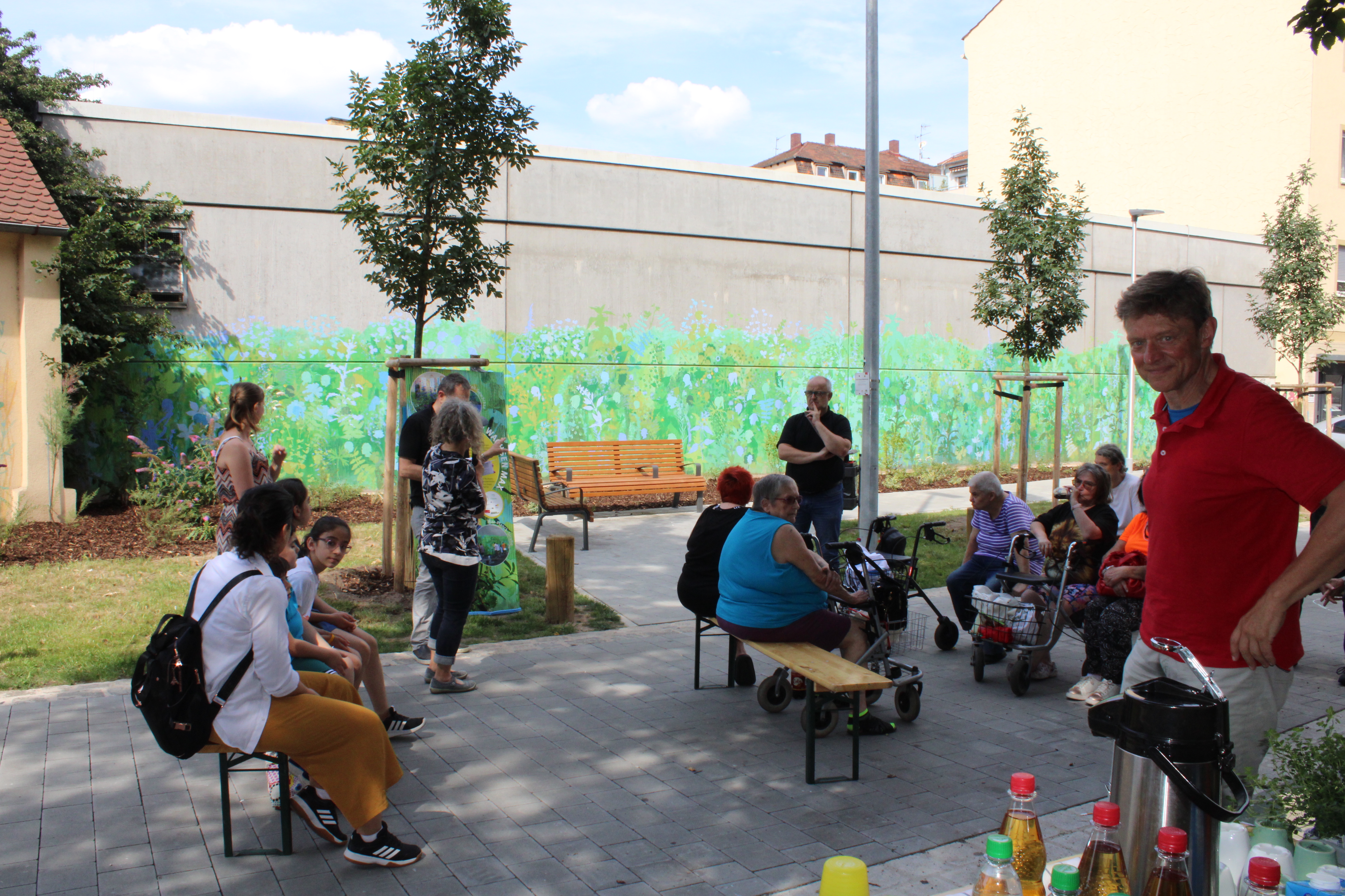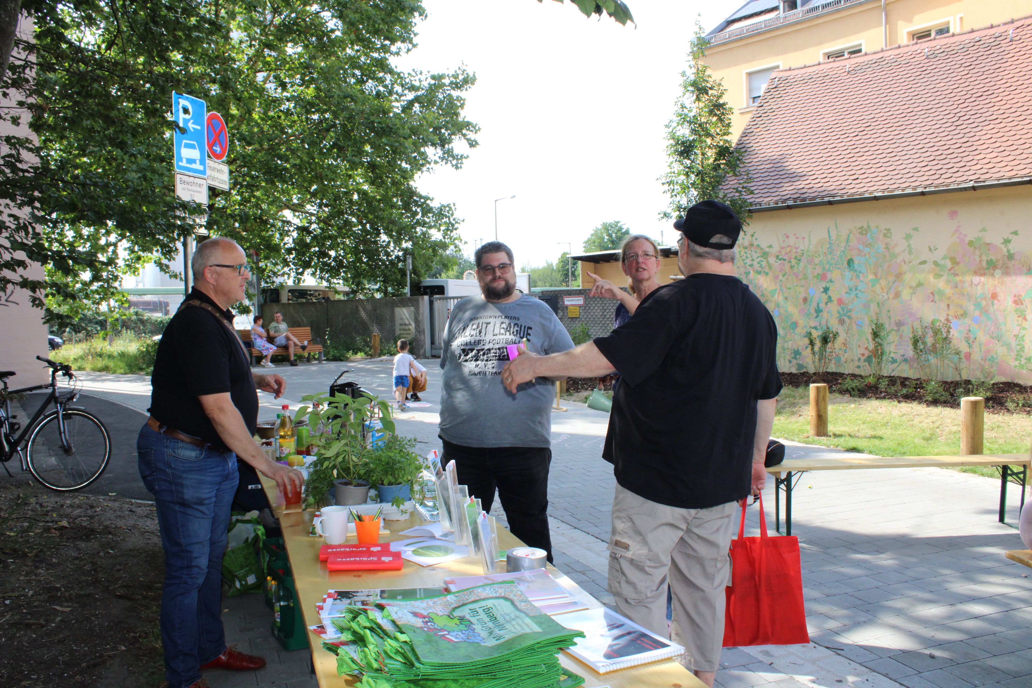 Am Freitag, den 19.07.2024, kamen Anwohnende und Interessierte des Quartiers zusammen, um mit dem Leiter des Stadtplanungsamtes, dem Quartiersmanagement und der Künstlerin, die offizielle Eröffnung des Pocket Parks zu feiern.