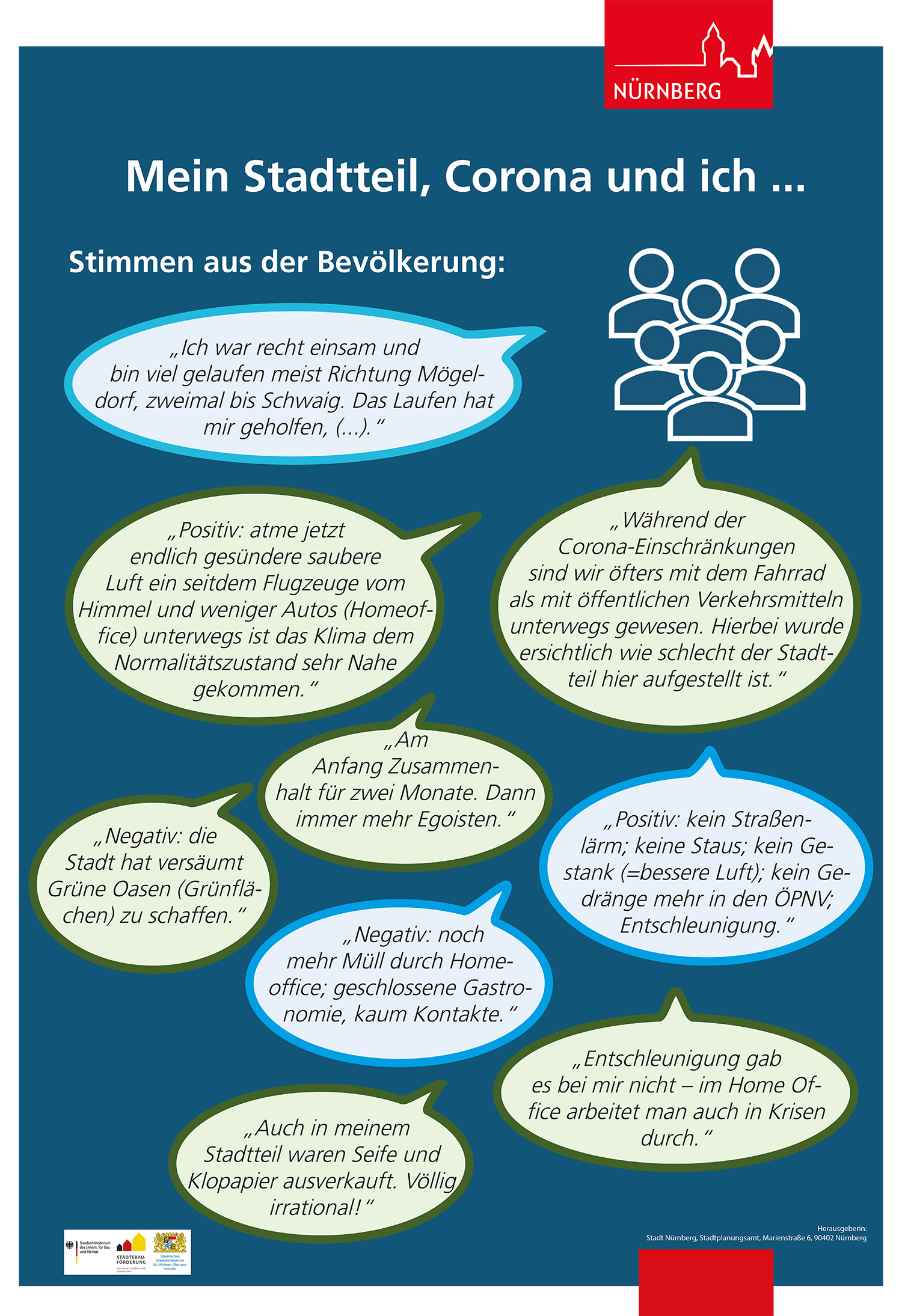 Im Rahmen der Corona-Beteiligungsaktion "Mein Stadtteil, Corona und ich" waren die Bewohnerinnen und Bewohner von Gibitzenhof/Steinbühl-West/Rabus dazu aufgefordert ihre ganz persönlichen Eindrücke vom (Zusammen)Leben im Quartier zu schildern. Auf Grußkarten, die an alle Haushalte im Stadterneuerungsgebiet verteilt wurden, bot sich Platz, der Kreativität freien Lauf zu lassen. Hier eine Auswahl der eindrucksvollsten Einsendungen.