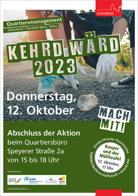 Am 12. Oktober 2023 veranstaltete das Quartiersmanagement Gibitzenhof/Steinbühl-West/Rabus "Kehrd wärd", um für mehr Sauberkeit im öffentlichen Raum zu sensibilisieren. Neben einigen Kindern aus Einrichtungen des Stadtteils, hat sich in diesem Jahr auch die ASN an der Müll-Sammelaktion beteiligt. Zum Abschluss gab es im Quartiersbüro noch eine Vorführung des Theaters Rootslöffel.