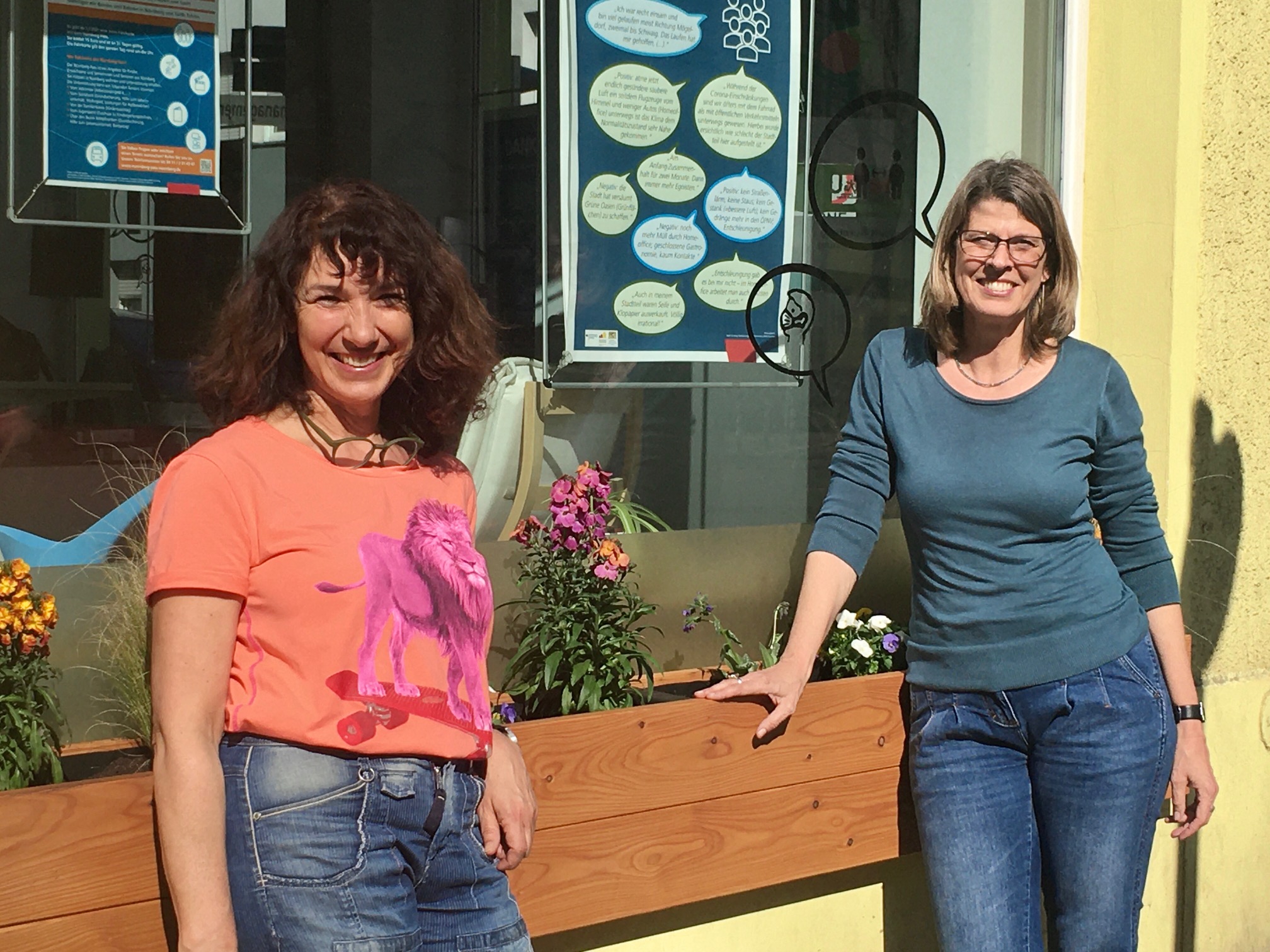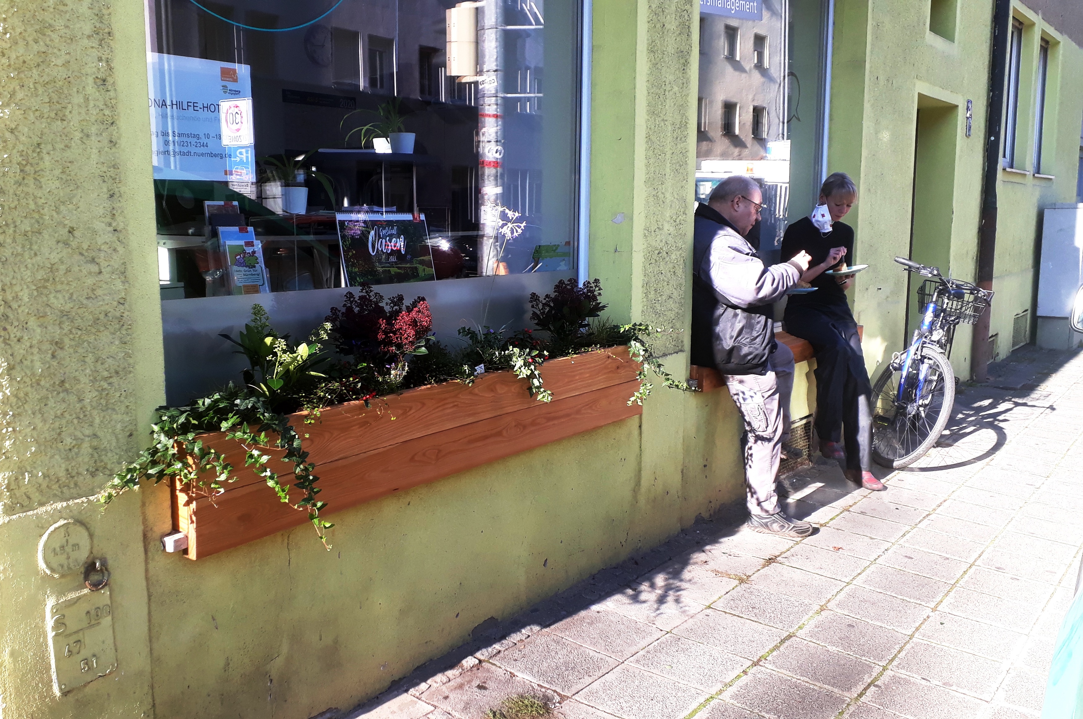 Kurz vor Ostern brachte der Schreiner der NOA den zweiten Blumenkasten mit seinen zwei Helfern. Der schwere Blumenkasten passte nicht. Es wurde geklopft, geschoben, geflucht – keine Chance. So musste der Schreiner noch einmal sein Werkzeug holen und die angeschraubte Leiste versetzen. So bepflanzten die Quartiersmanagerinnen Kathrin Imke und Carmen Lösch den neuen Blumenkasten gemeinsam mit Blumen und Gräser. Ein schönes Ritual!