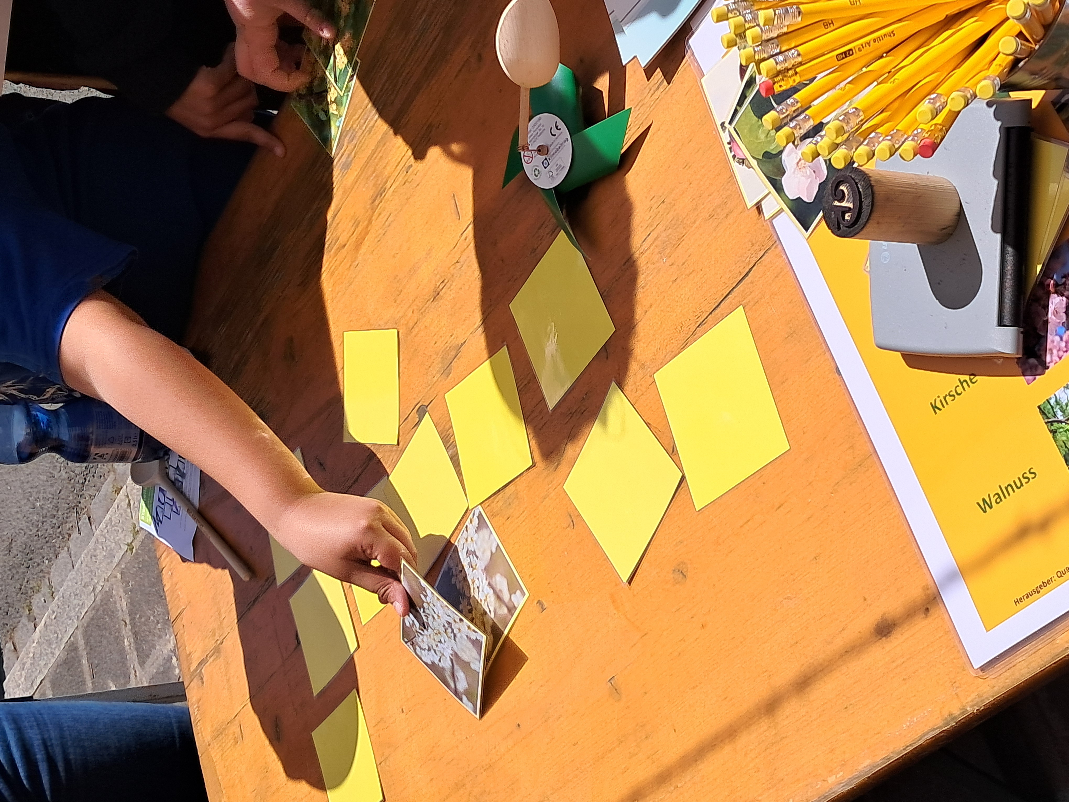 Beim beliebten Stempelquiz konnten die Kinder die geplanten Obstbaumsorten der Gemeinschaftsscholle des Quartiersparks zuordnen.
