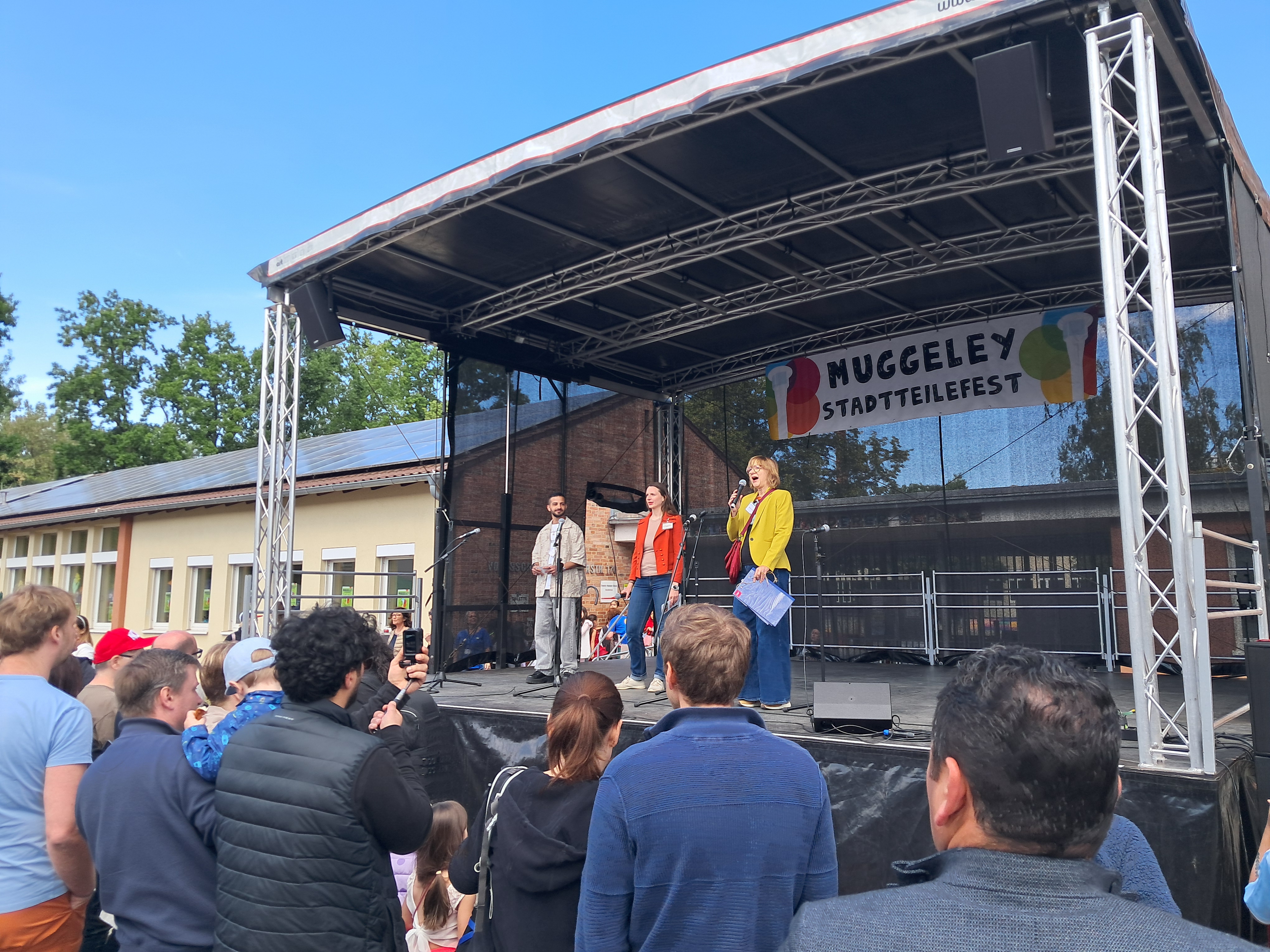 Das Stadtteilefest Muggeley war auch in diesem Jahr ein voller Erfolg. Vereine und Aktive stellten sich vor und Unterhaltung boten allerlei Auftritte auf einer großen Bühne vor der Wandererschule. Auch die Stadterneuerung und das Quartiersmanagement Weststadt informierten über Aktuelles und Zukünftiges. Gespräche mit den Bürgerinnen und Bürgern wurden sowohl zum Austausch, als auch für Rückfragen und Anregungen genutzt. Außerdem konnten Kinder bei einer Malaktion ihren Wunsch-Spielplatz an der Hautschstraße gestalten.