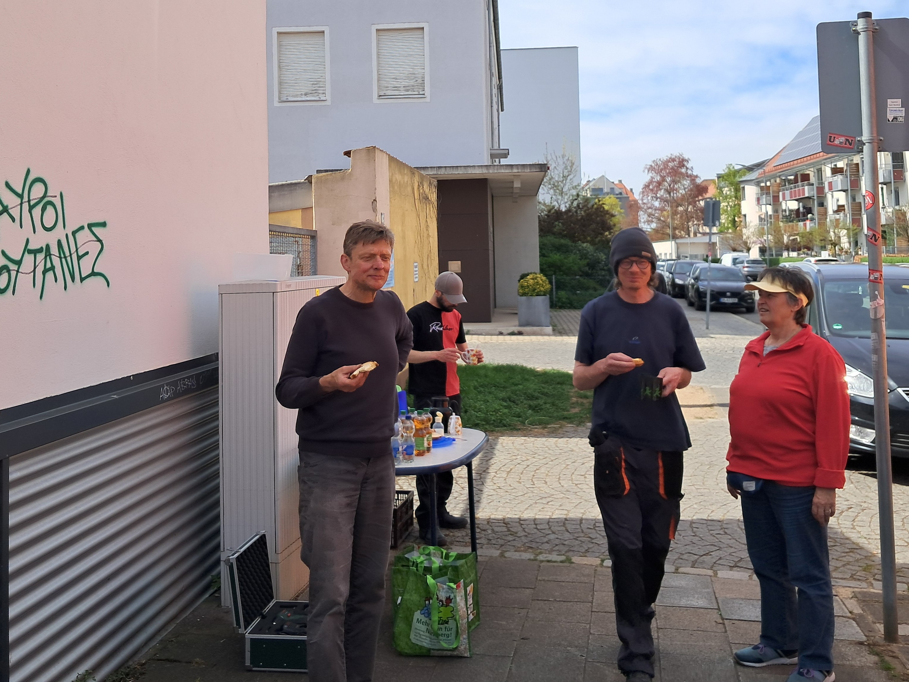 Auch die Bepflanzung an den Garagen wurde gepflegt, Triebe zugeschnitten und Zweige neu befestigt. Der Kinderhort Wanderer, Treffpunkt e.V. und HeHanI e.V. haben zudem Müll eingesammelt und restliches Laub zusammengetragen.