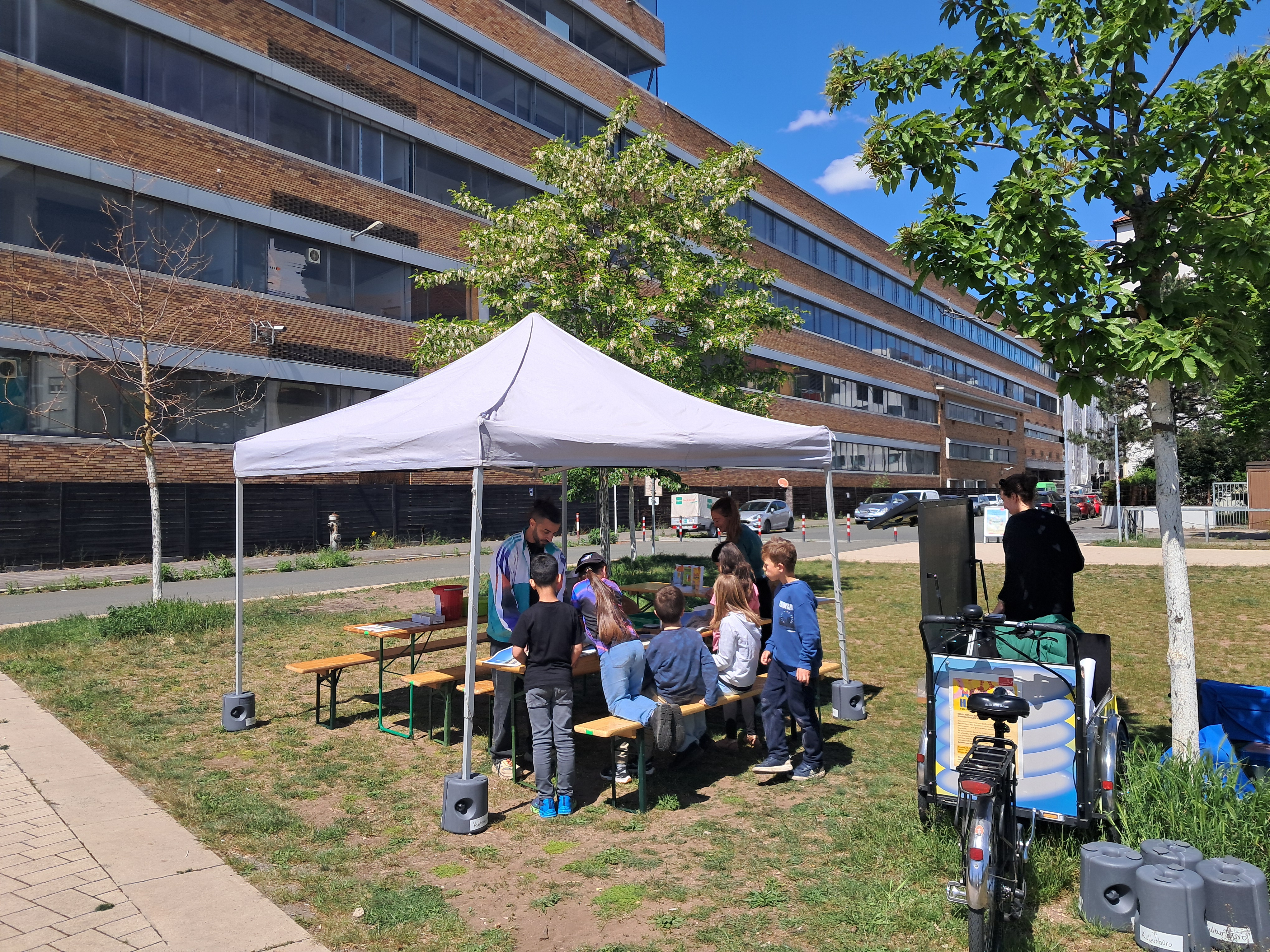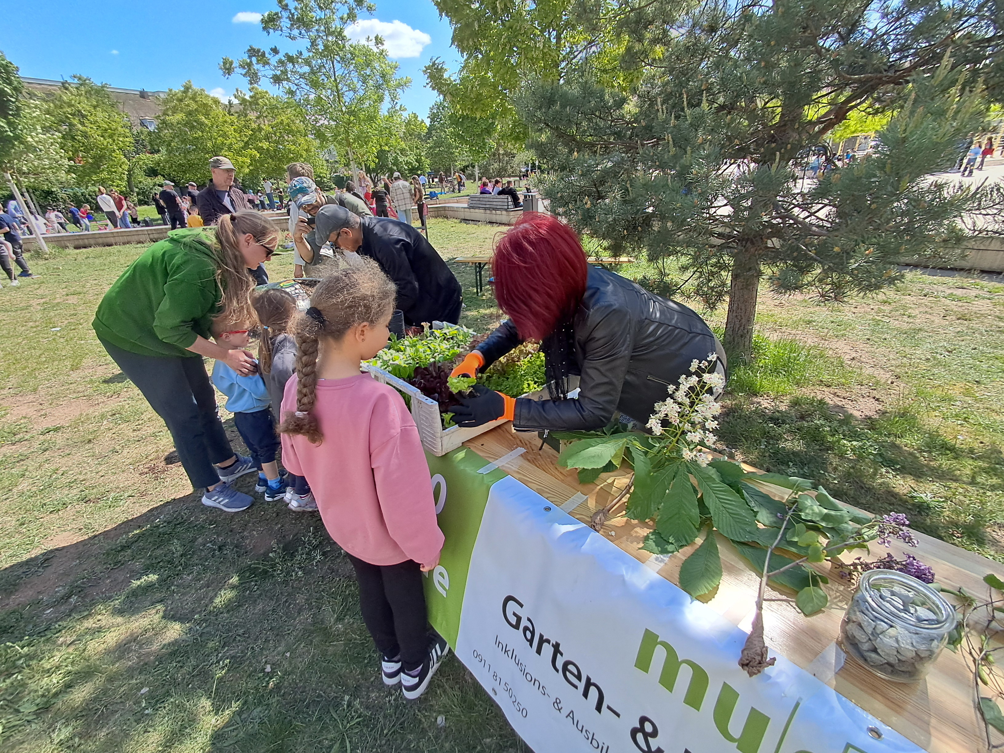 Am 25. Mai 2025 fand das diesjährige Stadtteilefest Muggeley statt. Einrichtungen, Vereine und Aktive aus den Stadtteilen Muggenhof, Eberhardshof, Doos, Leyh, Gaismannshof und Höfen haben auch in diesem Jahr ein wunderbares Fest für Bürgerinnen und Bürger gestaltet. Erstmals fand man sich an einem Samstag - und nicht, wie gewohnt, an einem Sonntagnachmittag im Juni - vor der Wandererschule ein. Bei bester Unterhaltung mit Musik und Tanz auf der großen Bühne, einem internationalen kulinarischen Angebot sowie vielen Informationen und Gesprächen verbrachten die Erwachsenen einen kurzweiligen Nachmittag. Die Kinder fanden an den meisten Ständen ein Angebot mit Spielen, Rätseln oder anderen Aufgaben mit denen man Buchstabenstempel für das Stempel-Quiz zusammentragen konnte. „Muggeley für den Frieden“ war auf den Karten am Ende zu lesen, die an der Verlosung teilnehmen konnten. Die Stadterneuerung war mit einem Infostand und Lastenfahrrad dabei. Einen Stempel konnten man sich hier mit einer Runde Memory mit Obstbaumblüten- und Früchtekarten verdienen.