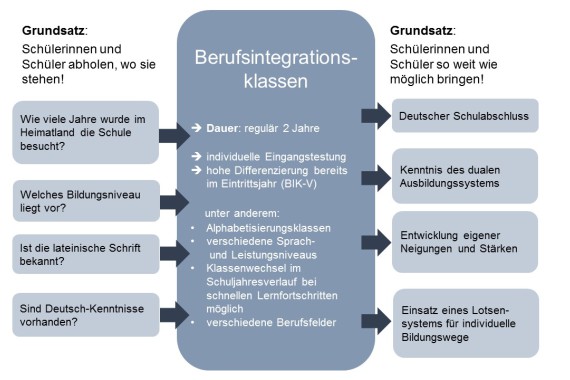 Der zweijährige Bildungsgang Berufsintegrationsklassen an beruflichen Schulen zielt darauf ab, Schülerinnen und Schüler mit Migrationshintergrund in die hiesige Lebens- und Berufswelt zu integ-rieren.