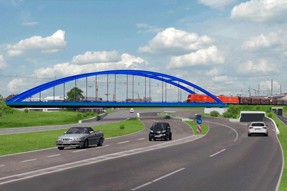 So könnte die neue Verbindungsgleisbrücke über den ausgebauten Frankenschnellweg am Ende aussehen. Die blaue Farbe entspricht nicht der Realität und dient nur der Hervorhebung.