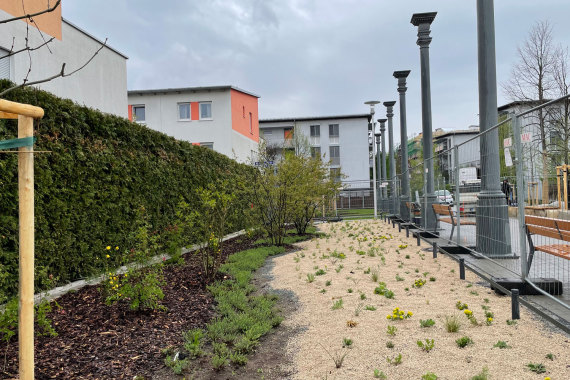 Insgesamt wurden 1 000 Quadratmeter Fläche entsiegelt und 27 klimaangepasste Bäume gepflanzt. Dazu zählen unter anderem Linden, Blumeneschen, Blaseneschen, Schnurbäume und Zelkoven, die für Schatten und Abkühlung im Sommer sorgen sowie Lärmschutz und vielfältigen Lebensraum bieten. Auch zwei Großbaumverpflanzungen erfolgten im Rahmen der Arbeiten. Die Bepflanzung bietet mit einer Mischung aus Großbäumen, mehrstämmigen Kleinbäumen und rund 200 neuen Sträuchern attraktive Blühaspekte und lädt Bienen und Insekten ein. Dazu entstand eine artenreiche und ebenfalls bienenfreundliche betretbare Blühwiese.
