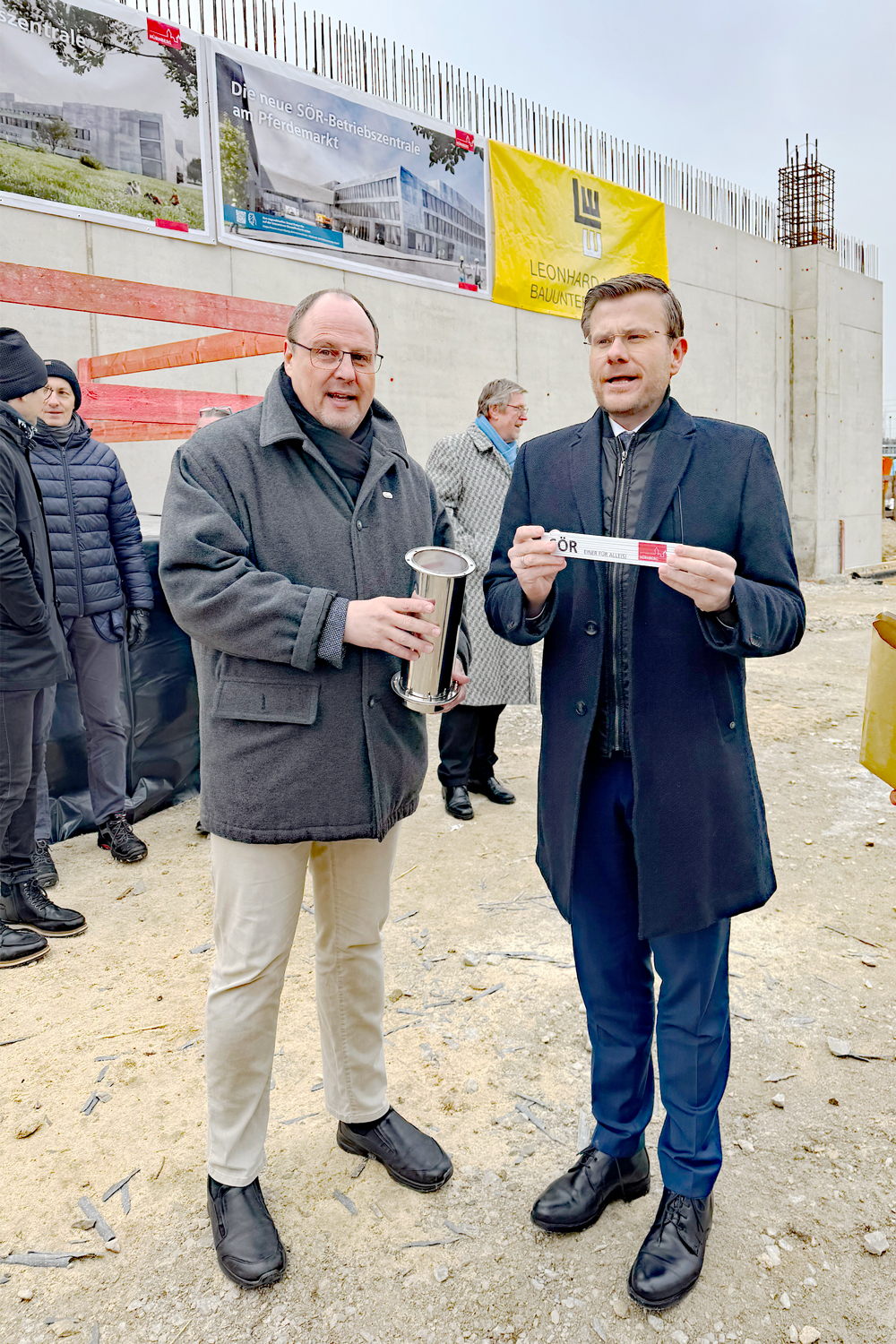 Die neue Zentrale des Servicebetriebs Öffentlicher Raum Nürnberg (SÖR) am Pferdemarkt nimmt Gestalt an. Oberbürgermeister Marcus König sowie Bürgermeister und Erster SÖR-Werkleiter Christian Vogel haben am Mittwoch, 5. Februar 2025, nach altem Brauch gemeinsam eine Zeitkapsel in den Gebäudesockel eingemauert.