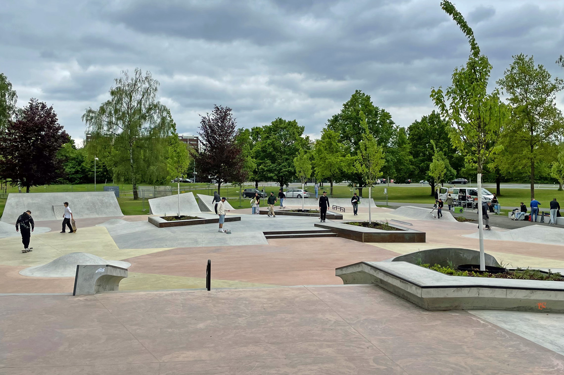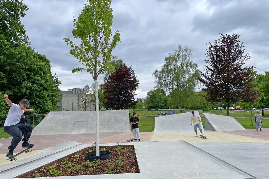 Im Vorfeld waren keine Baumfällungen nötig, Bäume und Grün wurden bei der Planung integriert. Auf der Anlage befinden sich vier „beskatebare“ Bäume, die Skateelemente bilden die Einfassungen der Baumscheiben. Um die gesamte versiegelte Fläche gut in die Parklandschaft zu integrieren wurden sieben Bäume neu gepflanzt. Als Ausgleich für die vor Ort nicht umsetzbare zusätzliche Versiegelung wurden externe Ausgleichsmaßnahme am Weg am Village zwischen Rothenburger Straße und Westpark durchgeführt.