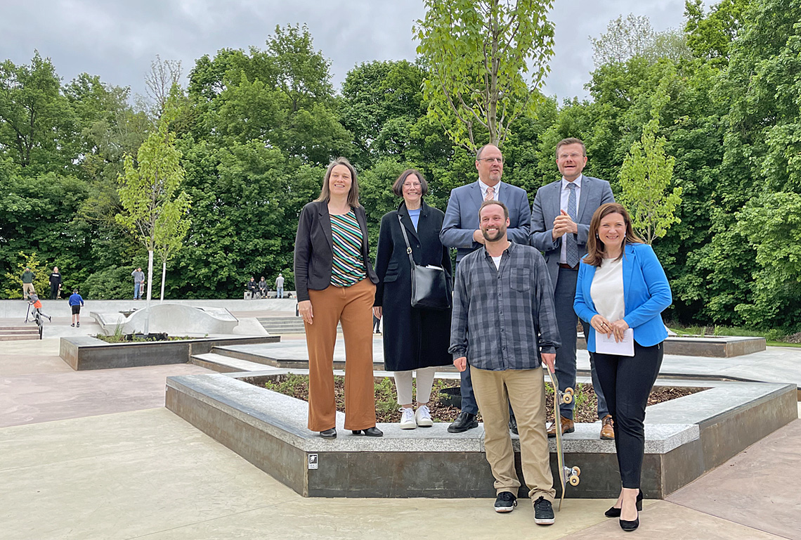 Eröffneten am 17. Mai 2023 den neuen Skatepark Münchener Straße (hinten v.l.n.r): Elisabeth Ries, Referentin für Jugend, Familie und Soziales, Baudirektorin Katharina Sauer, Regierung von Mittelfranken, Christian Vogel, Bürgermeister und Erster SÖR-Werkleiter, Oberbürgermeister Marcus König sowie (vorne v.l.n.r.) Christoph Sausner, Vertreter des Skate Hub e.V., und Cornelia Trinkl, Referentin für Schule und Sport.