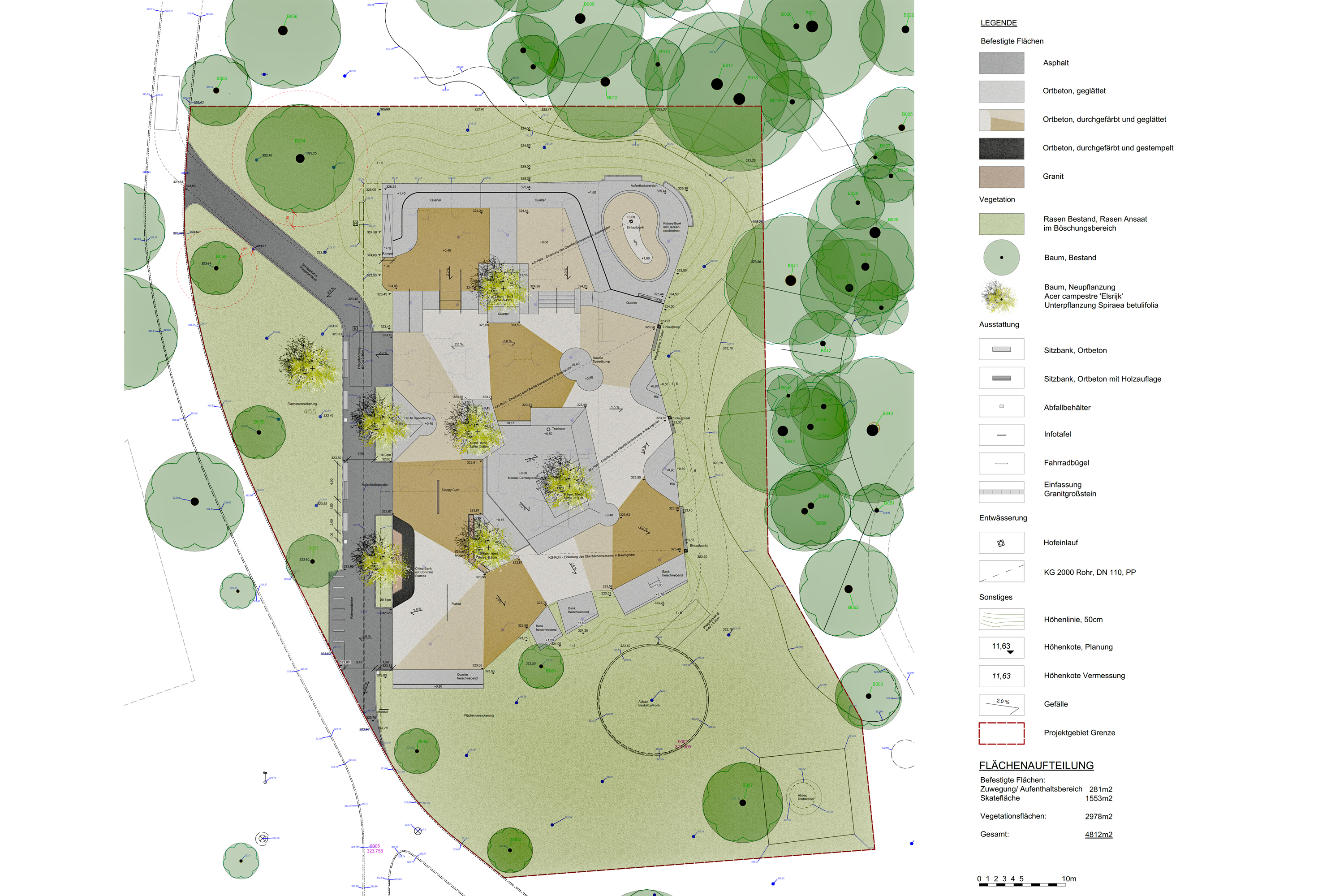 Das Oberflächenwasser kann vor Ort direkt in die angrenzenden Flächen versickern und wird nicht in den Kanal geleitet. Das Niederschlagswasser aus der Skate-Bowl wird in eine Versickerungsmulde geleitet.