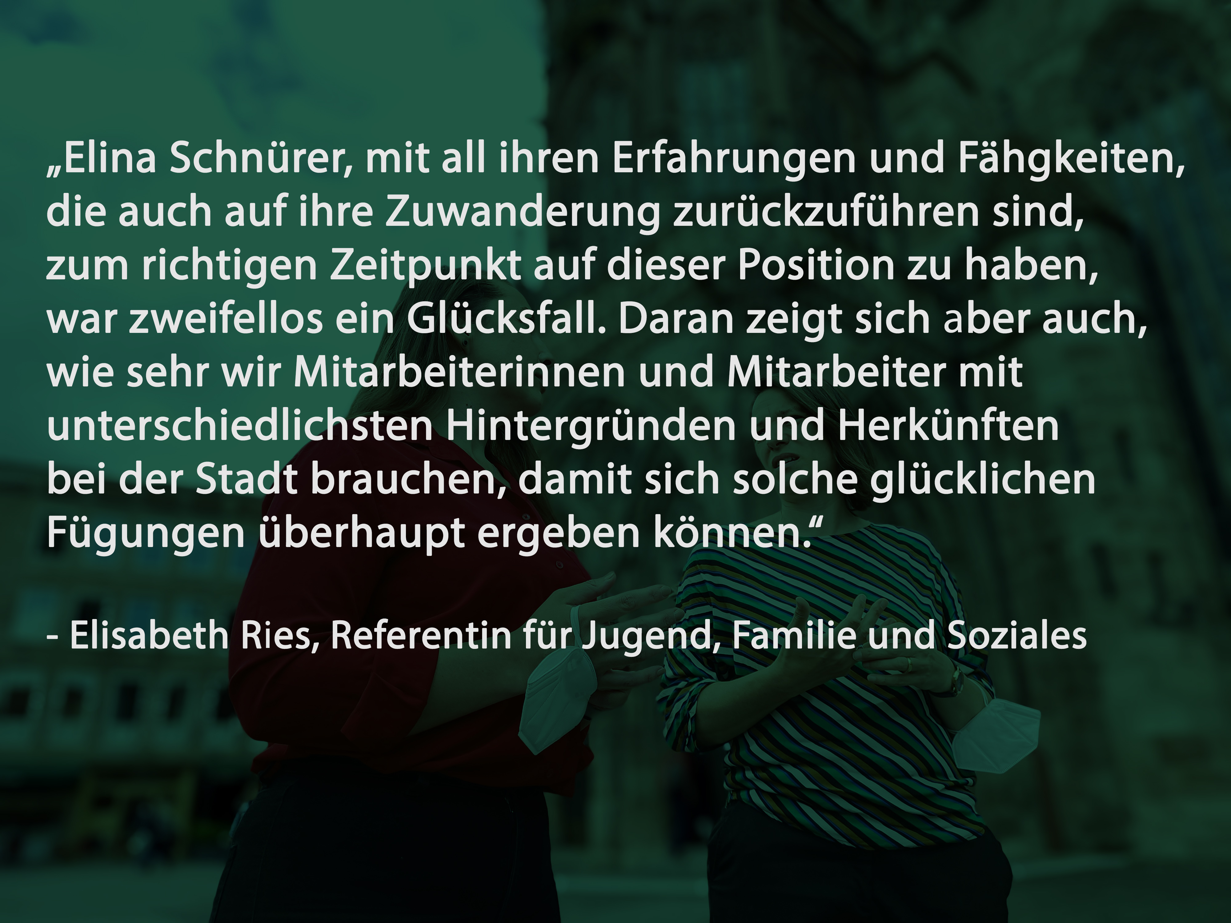 Der Ausbruch des Krieges in der Ukraine am 24. Februar 2022 stellte die Arbeit von Elina Schnürer zeitweise auf den Kopf. Im Gespräch mit der Sozialreferentin Elisabeth Ries im Mai 2022 ging es um das Arbeiten in Krisenzeiten, die wichtige Erfahrungswelt von Zugewanderten und Weichenstellungen im Berufsleben.