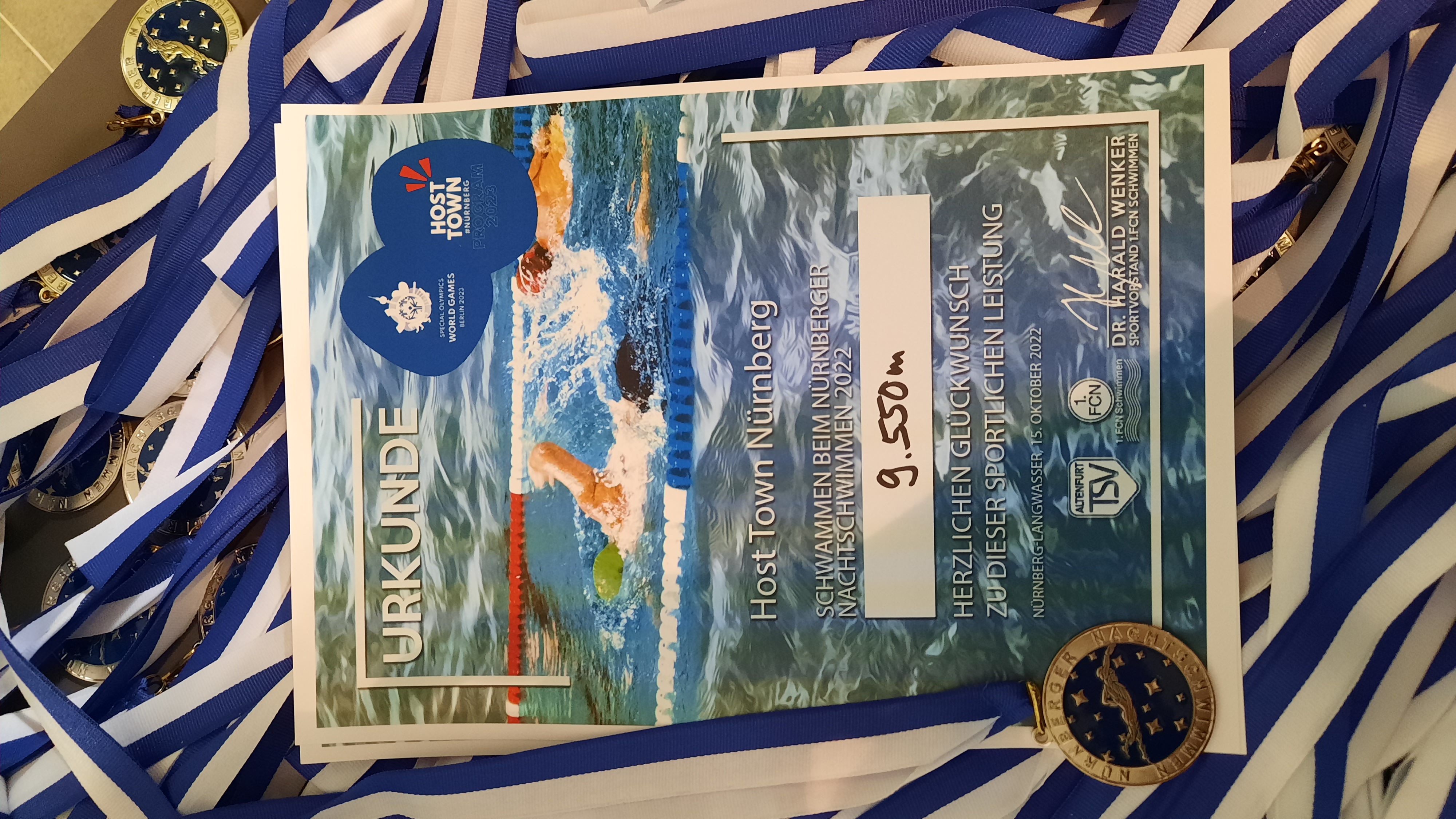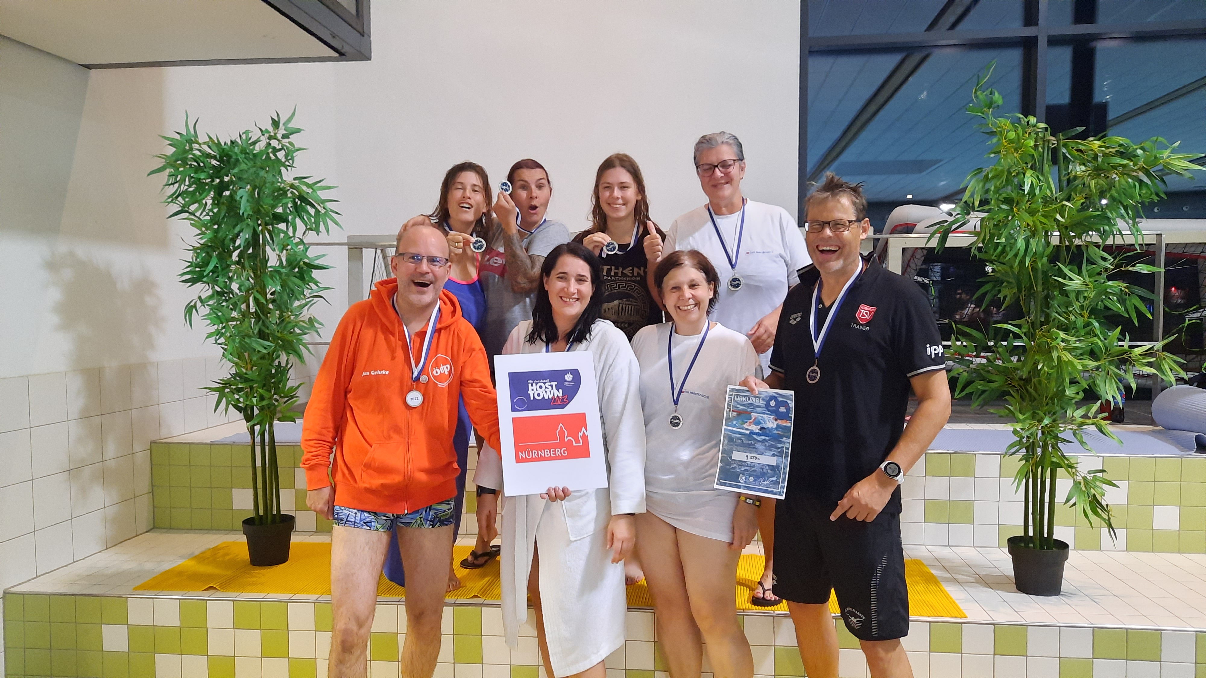 Am 15. Oktober 2022 ging es auch beim Nürnberger Nachtschwimmen um Inklusion: Die Host Town Staffel mit Ilona Busch-Heuer und Birgit Reicher (Paritätischer Wohlfahrtsverband), Jan Gehrke (Stadtrat ÖDP), Eva Hesse (Stadt Nürnberg), Volker Klügl (IPP Projektmanagement, Förderer Team Nürnberg und Goldener Ring), Katharina und Anja Koops, sowie Yvonne Stolz (TSV Altenfurt e.V.) und Armin Nembach (KUF Dunkelcafé) erschwamm in drei Stunden, 33 Minuten und 33 Sekunden gemeinsam 9 550 Meter!