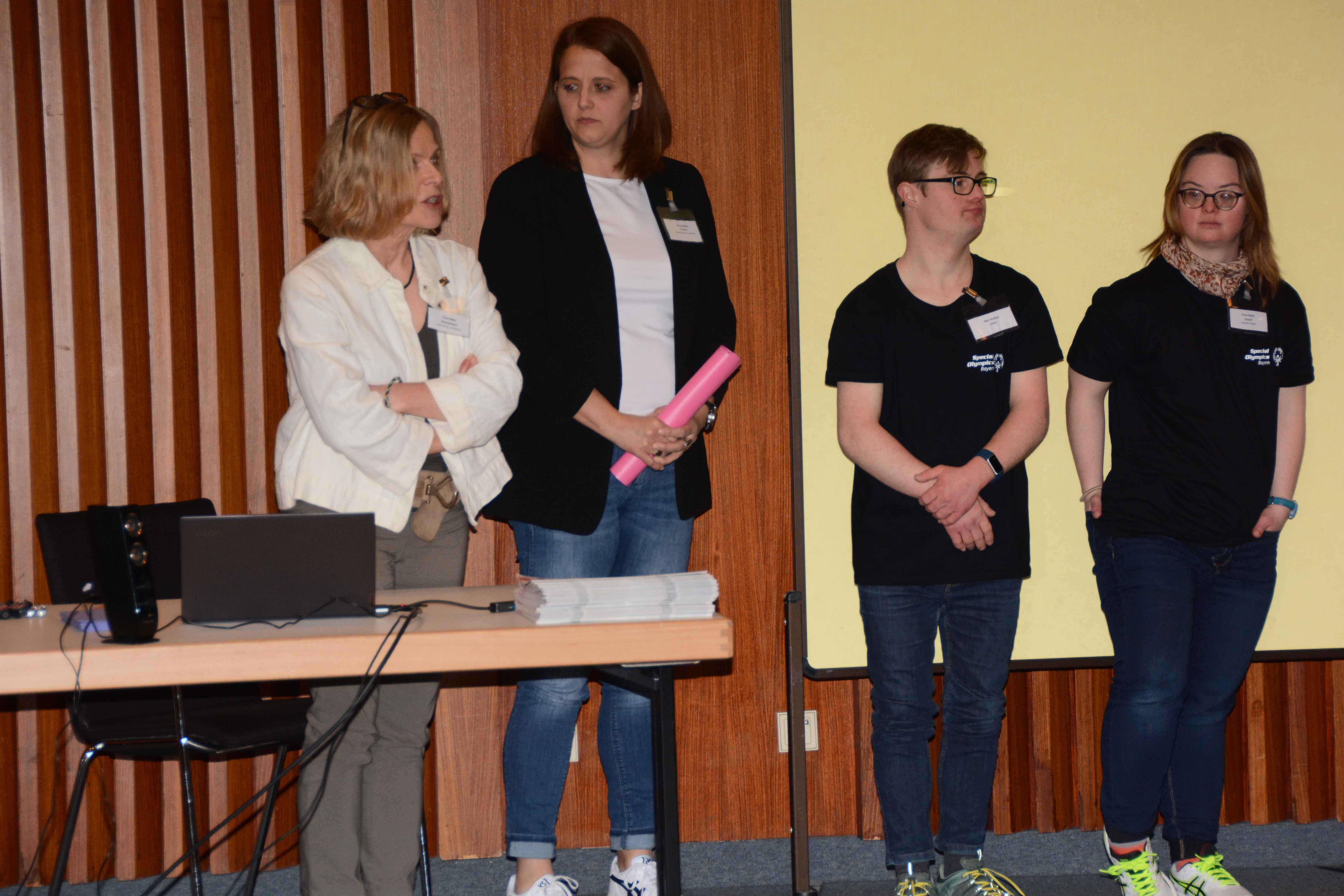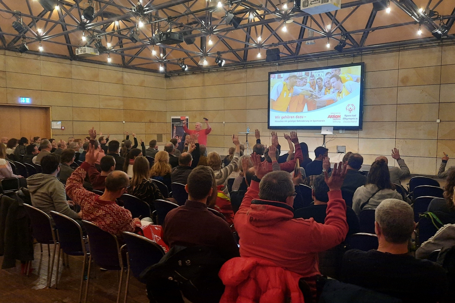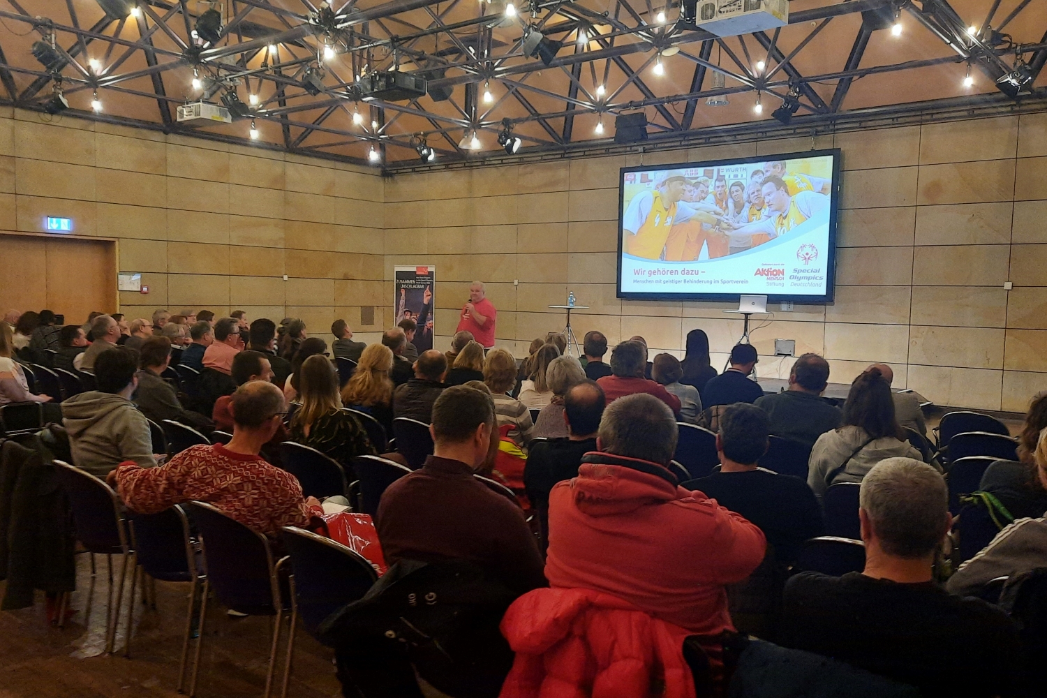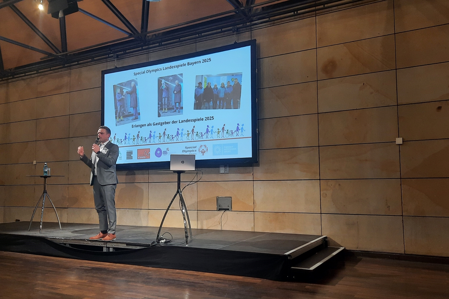 Was sind die Special Olympics und das Host Town Program? Was bedeutet Inklusion im Sport? Wie kann ich Sportangebote inklusiv gestalten? Wo erhalte ich Unterstützung? Wo können Sportvereine von inklusiven Sportangeboten profitieren? Das waren die Inhalte des Infoabends für Vereine "Inklusion im und durch Sport - Wir gehören dazu", zu dem weit über 100 Interessierte am 15. Februar 2023 in die Fürther Stadthalle kamen. Eingeladen hatten die Host Town Städte Erlangen, Fürth und Nürnberg sowie Special Olympics Bayern. Jörg Volleth (Bürgermeister der Stadt Erlangen), Markus Braun (Bürgermeister der Stadt Fürth) und Cornelia Trinkl (Referentin für Schule und Sport der Stadt Nürnberg) hatten in der Einladung formuliert: "Lassen Sie uns gemeinsam ein Zeichen ´vom Nebeneinander zum Miteinander' setzen!" Sie konnten im Zuge der Veranstaltung feststellen: Für dieses Ziel stehen viele Mitstreiterinnen und Mitstreiter ein. Der Einladung gefolgt waren Aktive aus Sportvereinen und -verbänden, aber auch Interessierte verschiedener Initiativen und Einrichtungen. Nach der Vorstellung der Schwerpunkte im Host Town Program der drei Städte war schnell klar, dass es überall darum geht, die Inklusion im Sport nachhaltig zu stärken. Daher sind im Host Town Program vor allem die Sportvereine wichtig. Denn hier treffen sich täglich Menschen bei ihrer gemeinsamen Leidenschaft: Dem Sport. Hier findet täglich Inklusion statt! Weil es in der Praxis häufig Fragen und Berührungsängste gibt, informierten Peter Landisch von Special Olympics Bayern und Kristina Höhn vom Nürnberger Freizeitnetzwerk Sport und gaben wertvolle Tipps aus ihrer Erfahrung im inklusiven Vereinssport. Am Ende des Abends, an dem auch der gemeinsame Austausch nicht zu kurz kam, war die Motivation riesig und es stand für alle fest: Es gibt keine Gründe gegen inklusive Sportangebote, aber viele dafür! Der Sport(-Verein) ist für alle Menschen da, neue Mitglieder werden gewonnen und alle profitieren von der Begegnung. Auch aus Vereinen, die schon inklusiven Sport anbieten, wurde berichtet, dass die inklusiven Angebote, die zum Teil nur versuchsweise ins Leben gerufen wurden, mittlerweile mit großer Begeisterung weitergeführt werden: Das "Einfach machen!" hat sich in jedem Fall gelohnt!