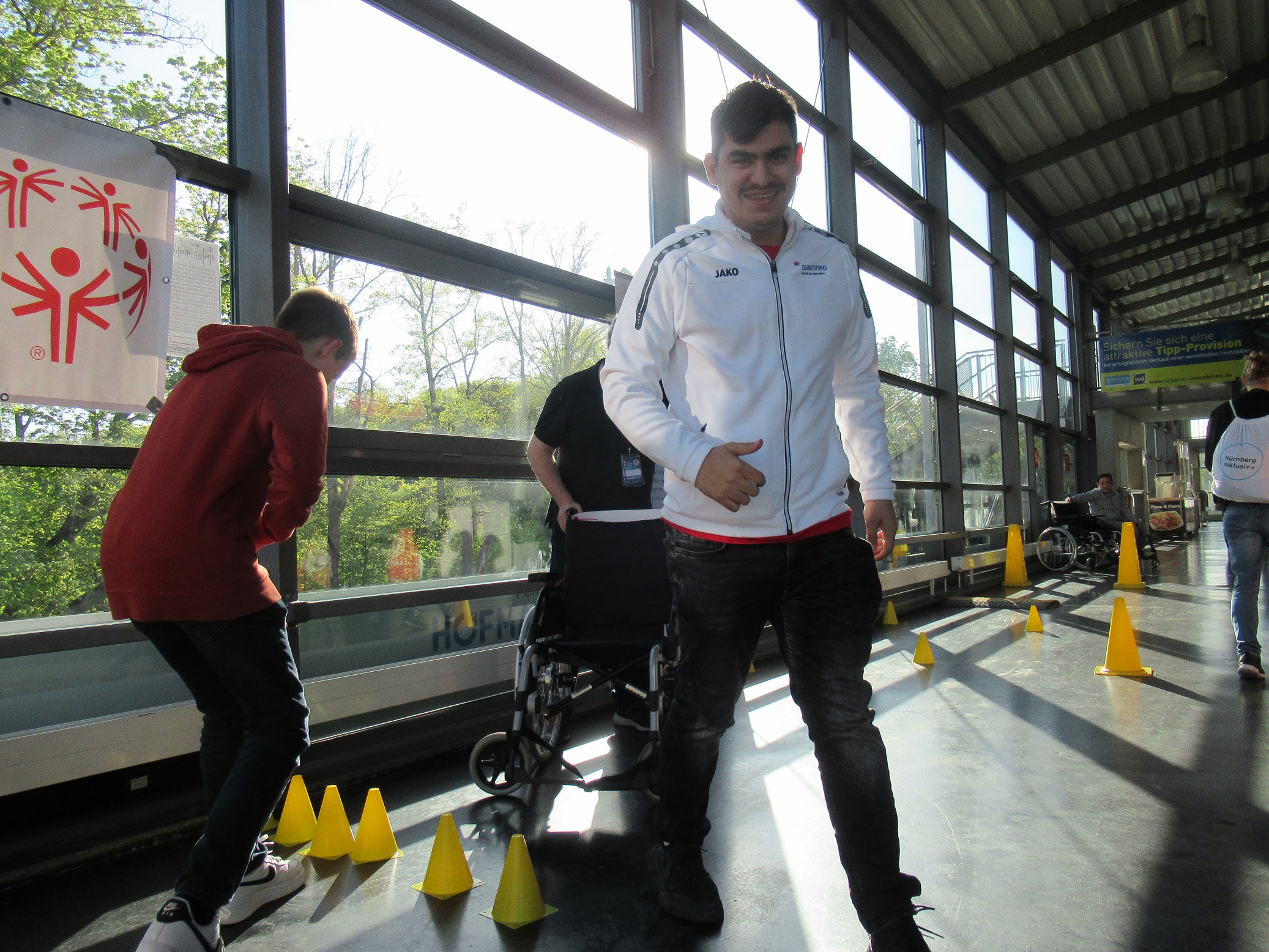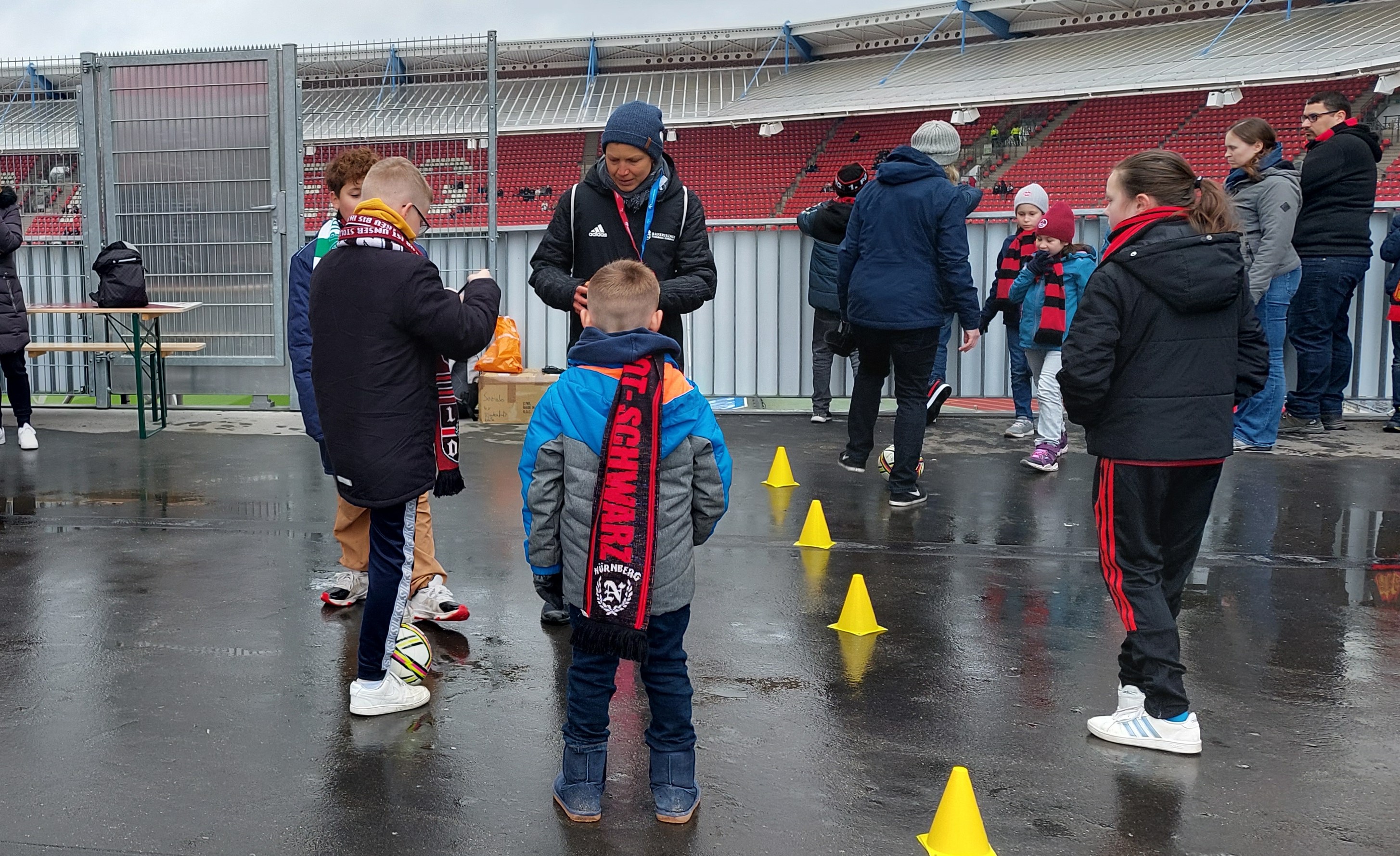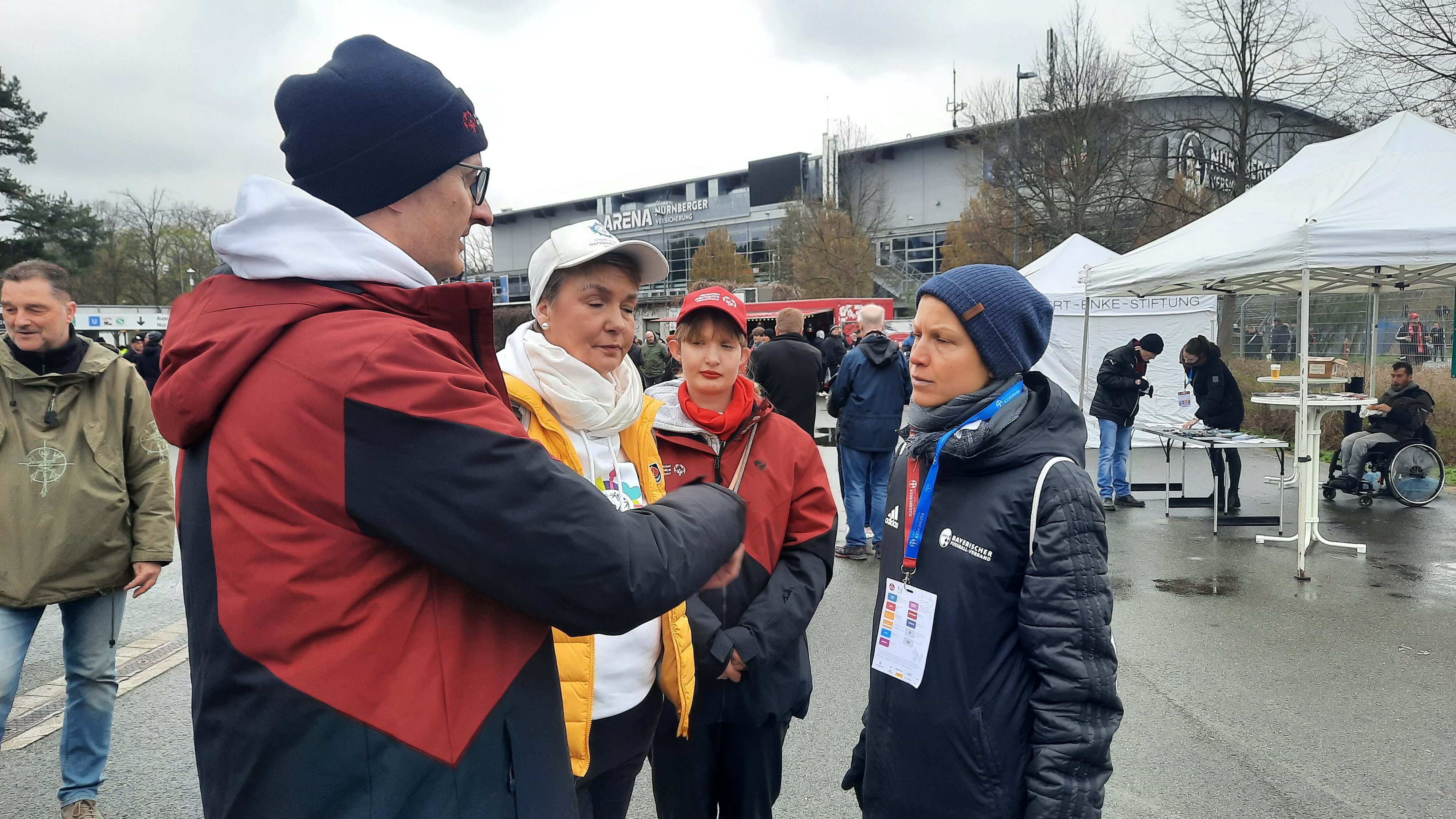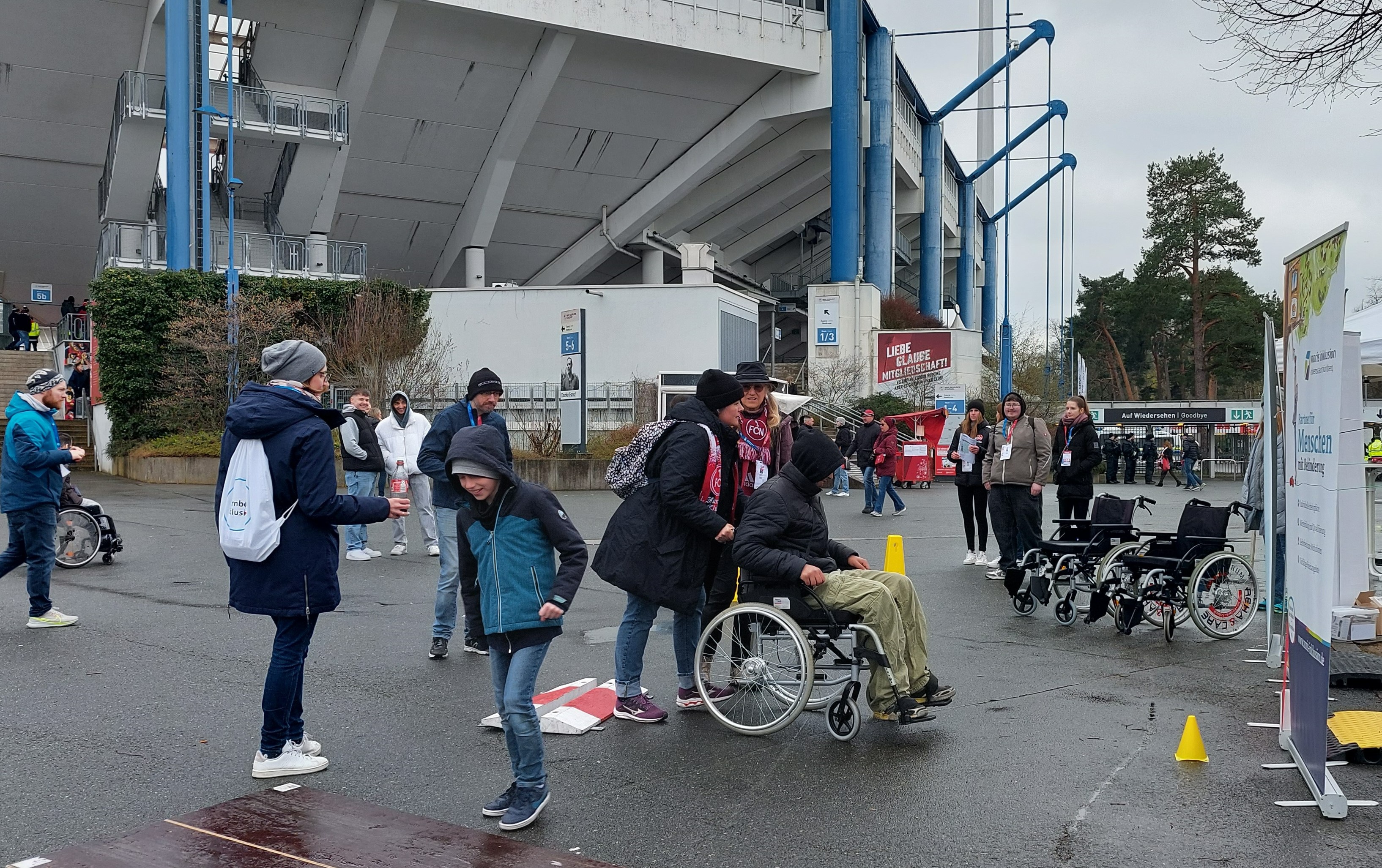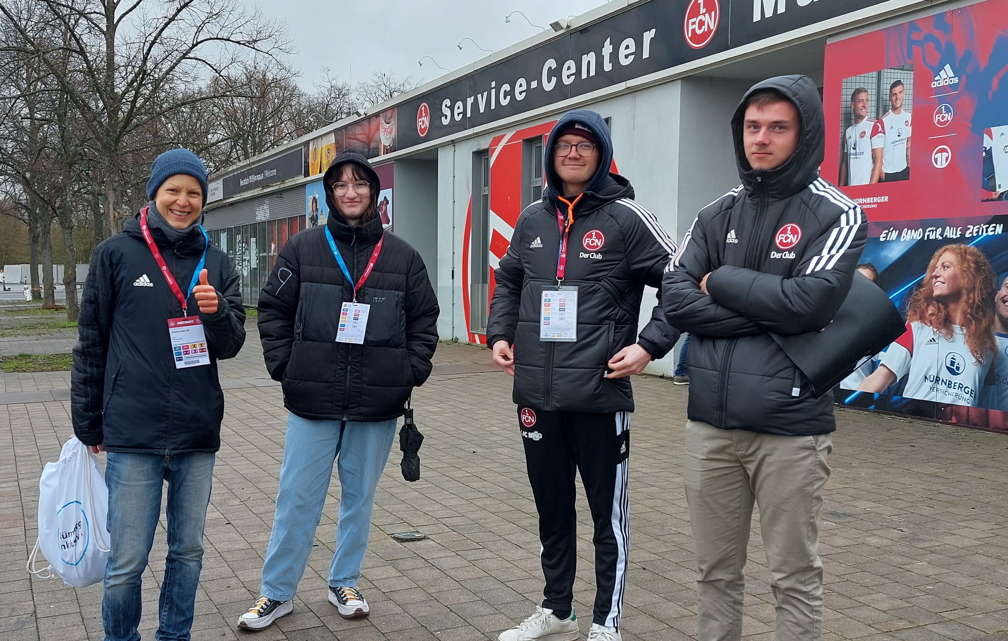 So erhielten Förderschulen, Einrichtungen der Behindertenarbeit, Werkstätten und Wohnheime schon vorab 200 Sozialtickets für den Spieltag. Die Stadionsprecher Florian Kerschner und Jörg Dippold wurden von Rene Funken aus dem FCN-Inklusionsteam im Stadion begleitet. Daneben gab es einige Mitmachangebote für alle, die Inklusion erleben wollten: Im Stadionumlauf organisierten der Behindertenrat Nürnberg und der Post SV, unterstützt von Reha & Care in Nürnberg Altenfurt, einen Rollstuhl-Parcours. Sportlich wurde es auch bei der Blindenfußball-Station am Kids-Stand vor dem Familienblock, unterstützt von Nicole Bittner, die selbst erblindet ist. Einen ganz besonderen Moment der Teilhabe konnten zwei geistig beeinträchtigte Volunteers erleben: Im Einsatz als Tandem mit einem Volunteer des 1.FCN betreuten sie die Einlaufkinder des Fußballspiels und unterstützten die Pressefotografen.