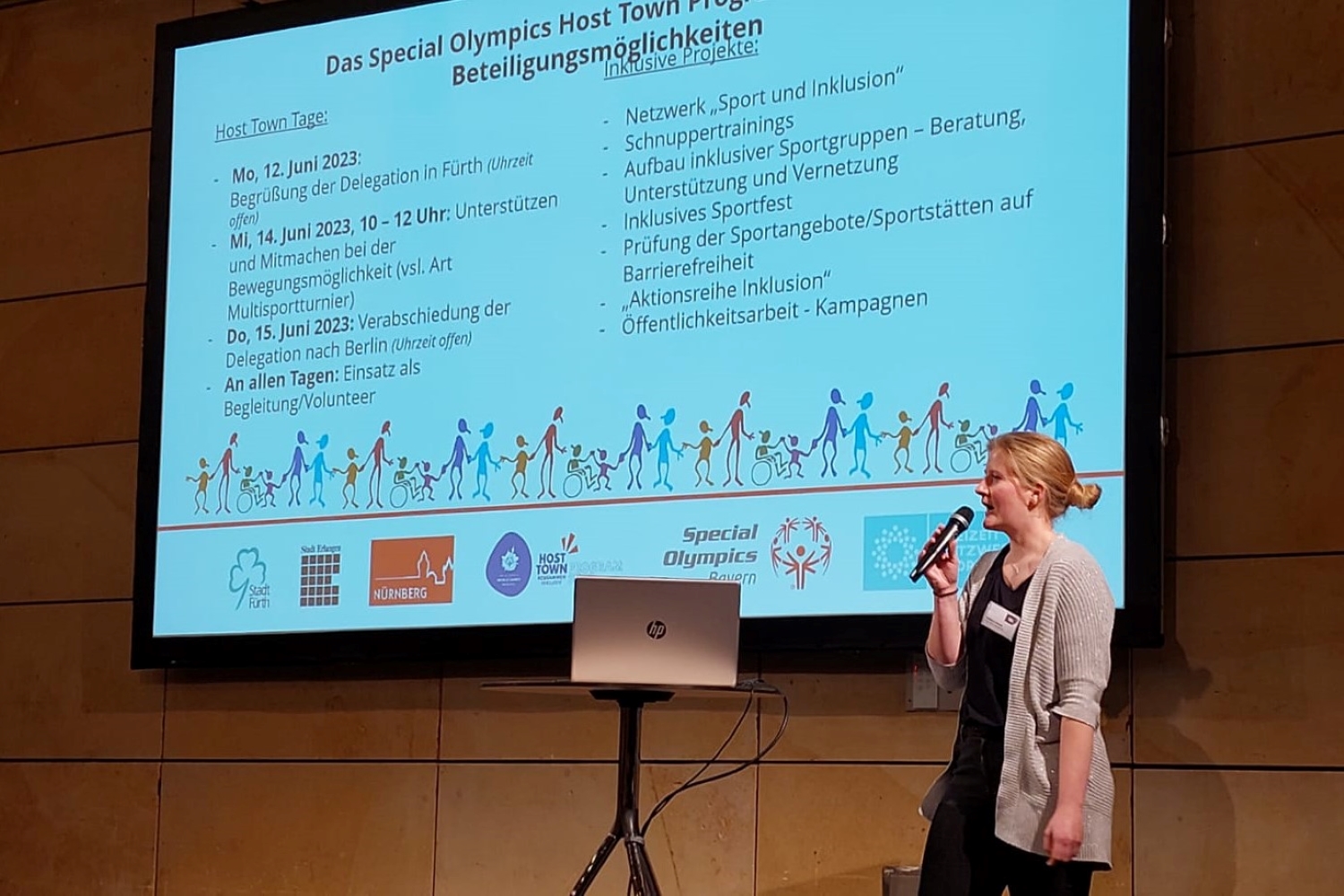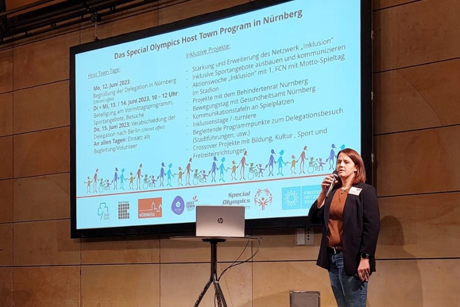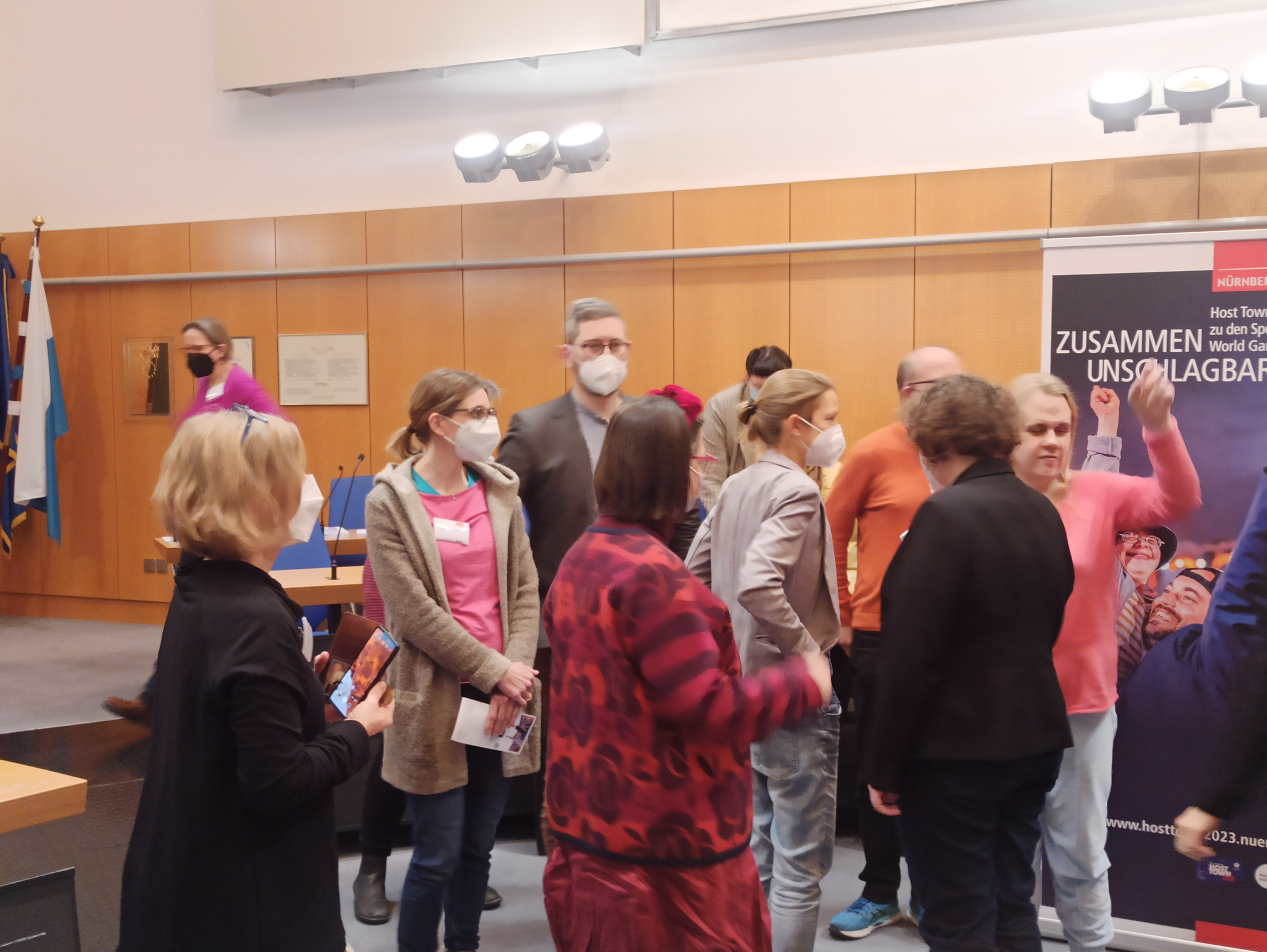 Aktionsplans zur Umsetzung der UN-Behindertenrechtskonvention (UNBRK) - bei all diesen Maßnahmen geht es um die gleichberechtigte Teilhabe von Menschen mit und ohne Behinderung in Nürnberg. Das Host Town Program wurde im Rahmen des Handlungsfeld "Freizeit, Kultur, Sport" vorgestellt. Dabei gaben Teilnehmende an inklusiven Sportprogrammen lebendige Einblicke in das Potential der Inklusion im und durch Sport.