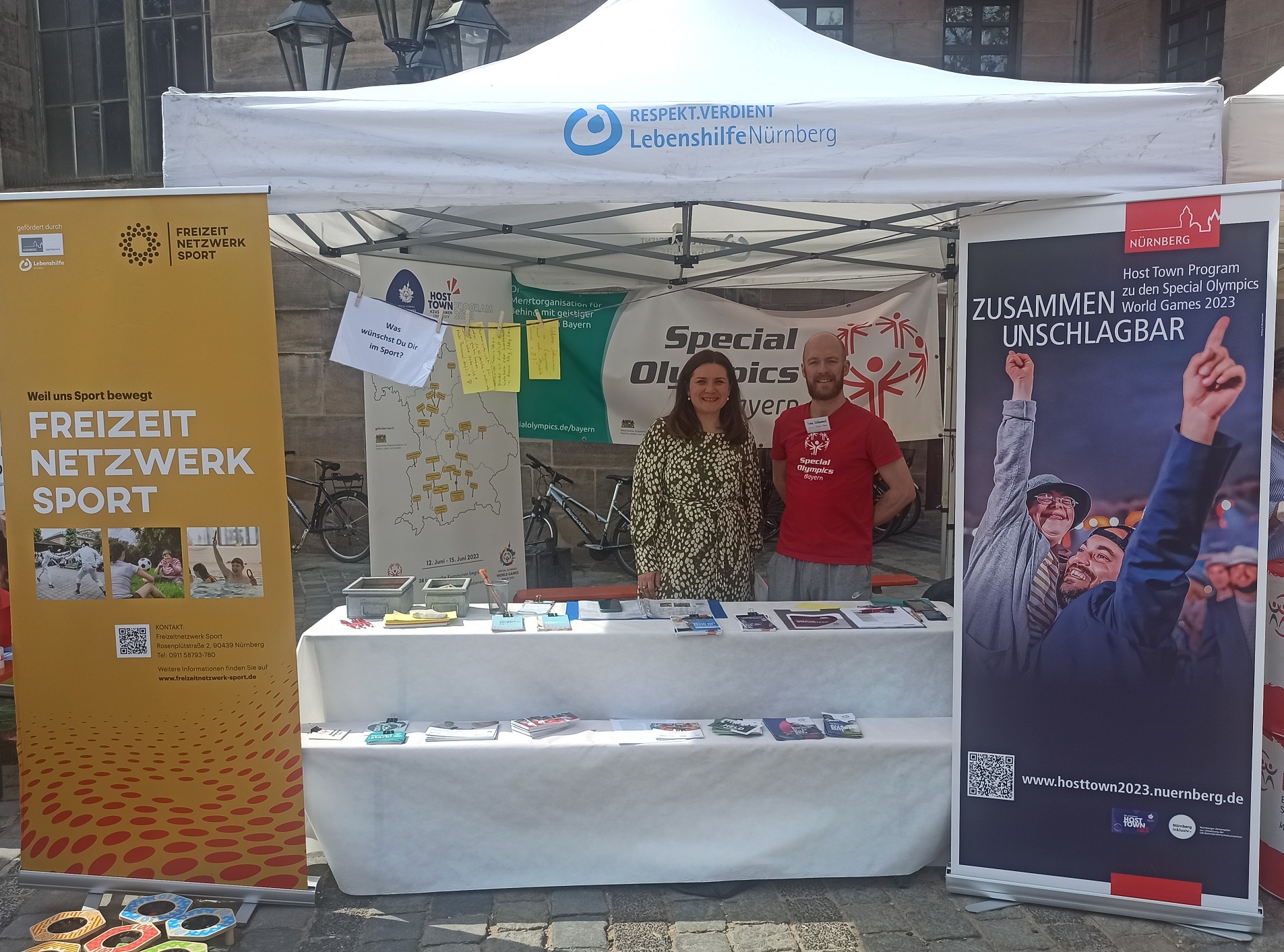 Am Samstag, den 6. Mai, machten sich in der Nürnberger Innenstadt viele Menschen und Initiativen für Inklusion stark: Beim UN-Zug zum Protesttag zur Gleichstellung von Menschen mit Behinderung wurde natürlich auch das Host Town Program thematisiert. Die Stadt Nürnberg, das Freizeitnetzwerk Sport und Special Olympics Bayern informierten gemeinsam über anstehende Projekte und Inklusion im Sport.