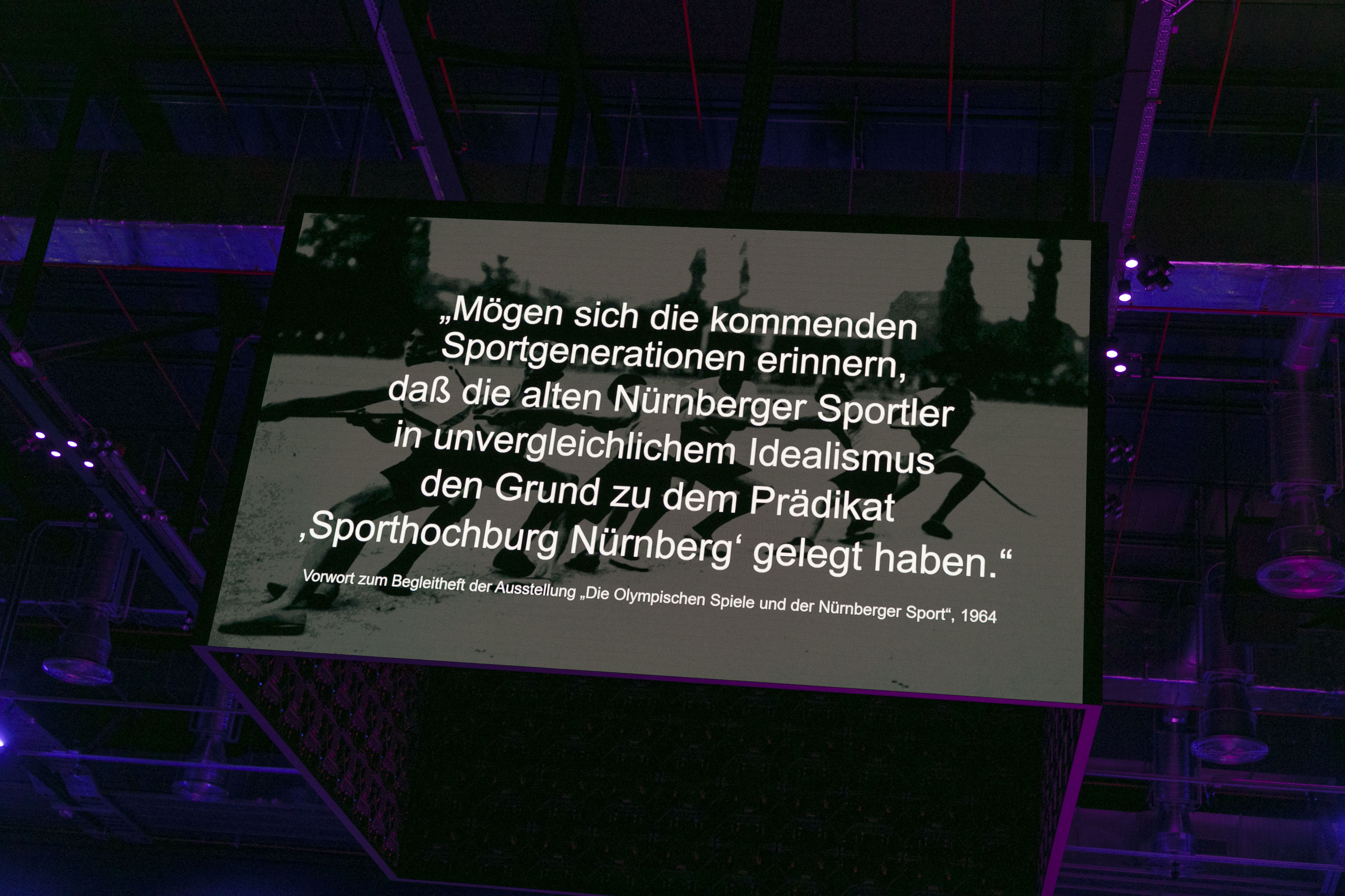 Während der Jubiläumsveranstaltung lieferte Autor Klaus Schamberger eine bebilderte Erzählung und ordnete das Sportgeschehen der 1920er, 1930er und 1940er Jahre in die jeweilige Zeit ein. Anschließend wurde das Goldene Buch der Stadt Nürnberg zum Leben erweckt. Einige Sportlerinnen und Sportler, die aufgrund ihrer historischen sportlichen Leistung im Goldenen Buch verewigt sind, nahmen das Publikum mit in die Zeit ihrer größten sportlichen Erfolge. Mit dabei waren die Deutschen Fußballmeister Heiner Müller (Meister 1961) und Horst Leupold (Meister 1968), Andreas Wolf (Pokalsieger 2007), Christiane Pape (mehrfache Goldmedaillengewinnerin im Para-Tischtennis), Max Müller (Doppelolympiasieger im Hockey), Patrick Reimer (Silbermedaillengewinner im Eishockey), Walter Heindl (Kampfrichter bei Olympia 1984 im Ringen) sowie Gerhard Scheller (Olympia-Teilnehmer im Radsport).