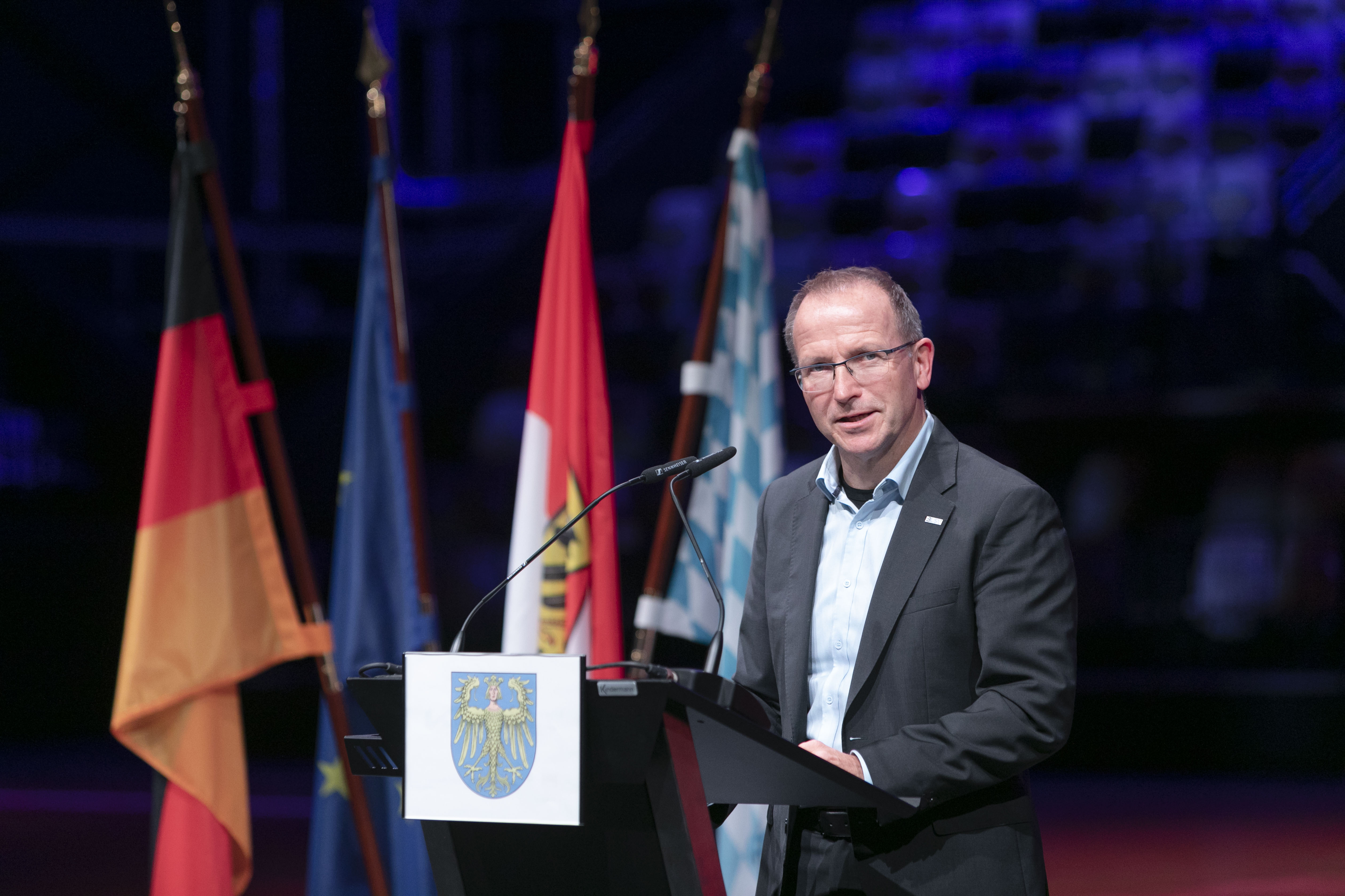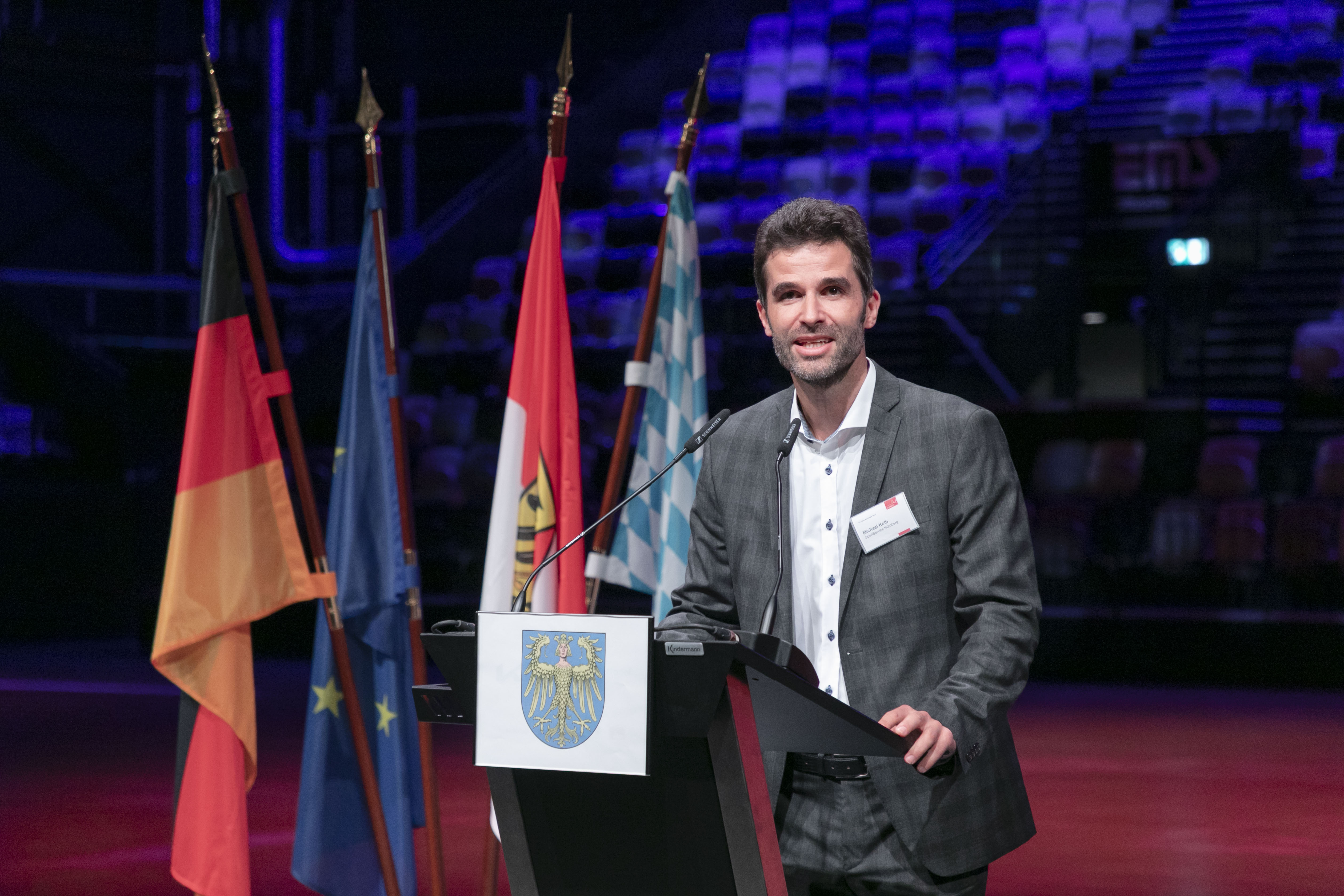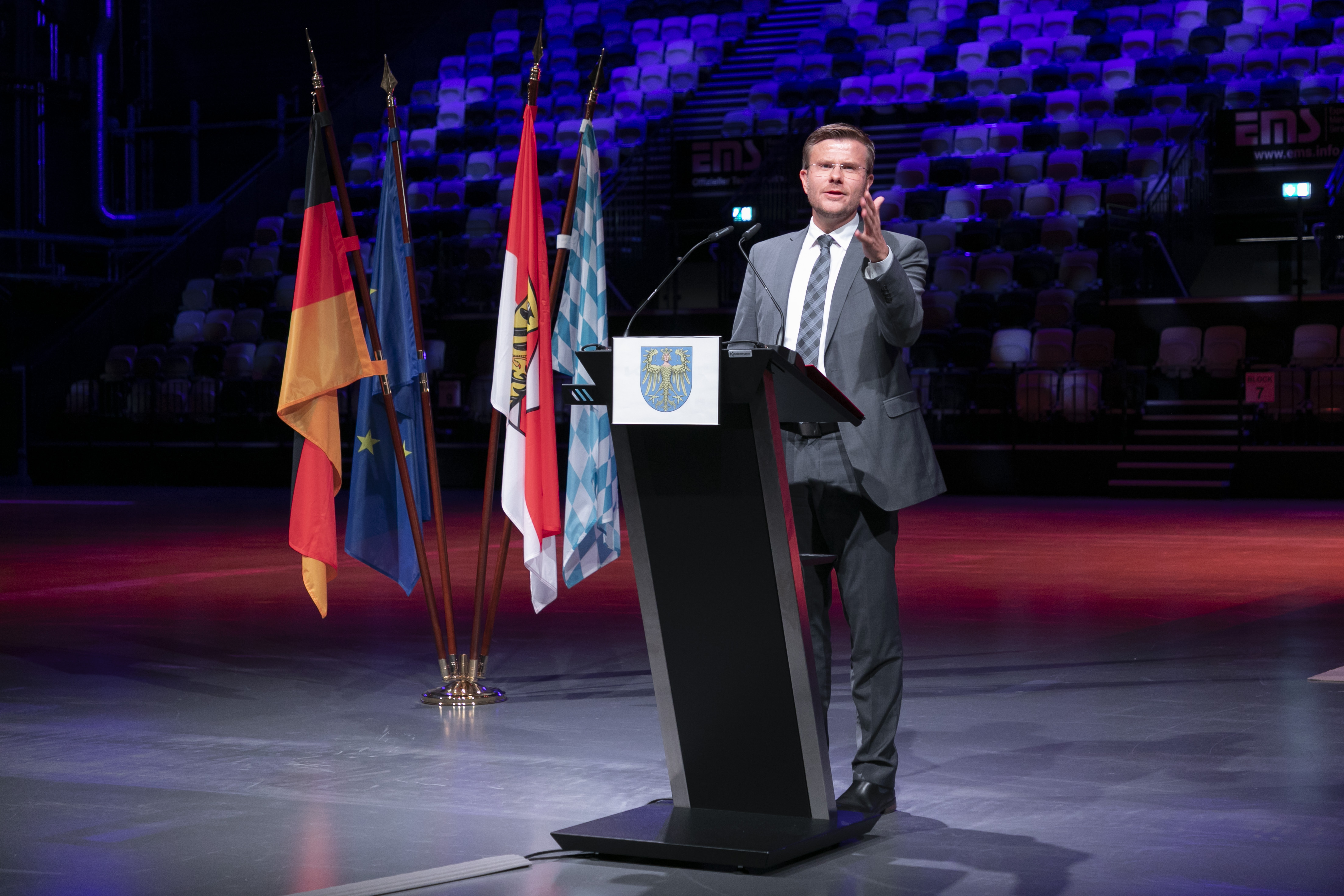 In seiner Begrüßung wies Oberbürgermeister Marcus König auf die besondere Bedeutung des Sports im vergangenen Jahrhundert hin. Trotz der immensen Aufs uns Abs gelang es immer, sich gemeinsam den Anforderungen der Zeit zu stellen. So soll auch in der Zukunft gemeinsam für den Sport gearbeitet werden: von Freizeit- und Breitensportangeboten für alle Bevölkerungsgruppen über Bewegung im öffentlichen Raum bis hin zur Leistungssportförderung. Von der Unterstützung des Vereinssports über alle Bereiche der Sportstätteninfrastruktur bis hin zu Nachhaltigkeit und gesellschaftlicher Verantwortung.