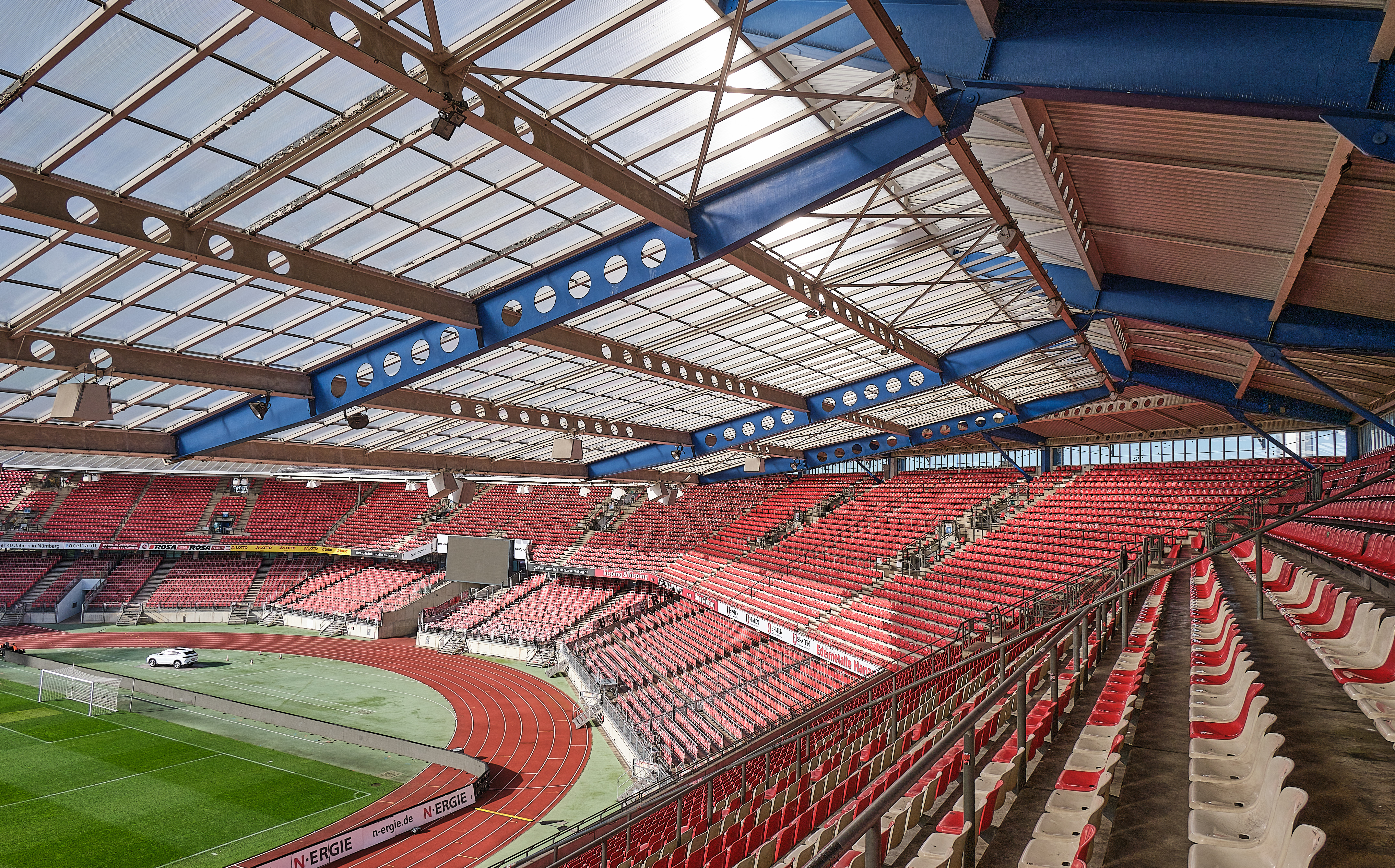 Die denkmalgeschützte Fassade der Haupttribüne ist eines der letzten sichtbaren Elemente des Ursprungsbaus von 1928. Auch wenn sie heute durch spätere Anbauten teilweise verdeckt ist, bleibt sie Symbol für die Geschichte und Kontinuität des Ortes. Sie erinnert daran, dass das Stadion eine lange Baugeschichte hat – und kein reines Produkt der Gegenwart ist.
