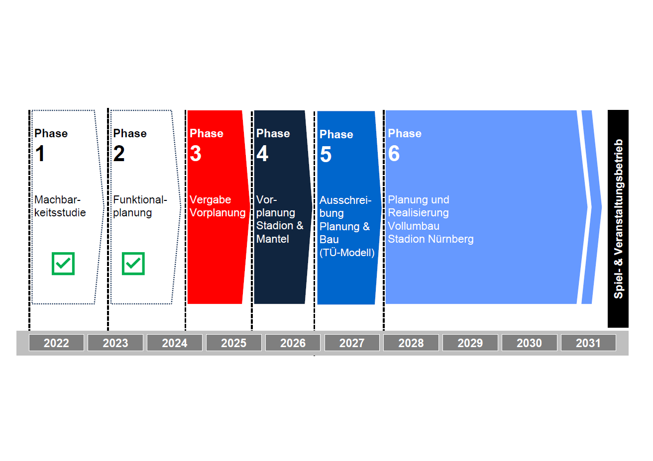 Die Vorplanung ist die Phase, in der das Planungsbüro gemeinsam mit Stadt, Verein und Betriebsgesellschaft die bisher offenen gebliebenen Fragen technisch, wirtschaftlich und organisatorisch bearbeitet. Parallel dazu soll die Stadt ein neues gesellschaftsrechtliches Modell prüfen: Der Eigenbetrieb Franken Stadion Nürnberg soll zu einem Kommunalunternehmen weiterentwickelt werden, um gemeinsam mit dem 1. FC Nürnberg ein rechtlich und finanziell tragfähiges Fundament für den Stadionvollumbau zu schaffen. Diese neue Organisationsform schafft die Voraussetzung, dass sich der Club organisatorisch und finanziell am Stadionbetrieb beteiligen kann.