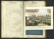 Die Stadtchronik wurde 1801 von dem Nürnberger Kaufmann und Bürger Georg Paul Amberger privat begonnen und 1844 der Stadt Nürnberg vermacht, die mit ihrer Fortführung heute das Stadtarchiv beauftragt hat. Besonders in die älteren Bände sind häufig Bilder und anderes Material eingefügt, so hier ein Stich über König Ludwigs I. Fahrt auf der Ludwigs-Eisenbahn anlässlich eines Nürnberg-Besuchs 1836. (StadtAN F 2 Nr. 6, Bl. 251/252)